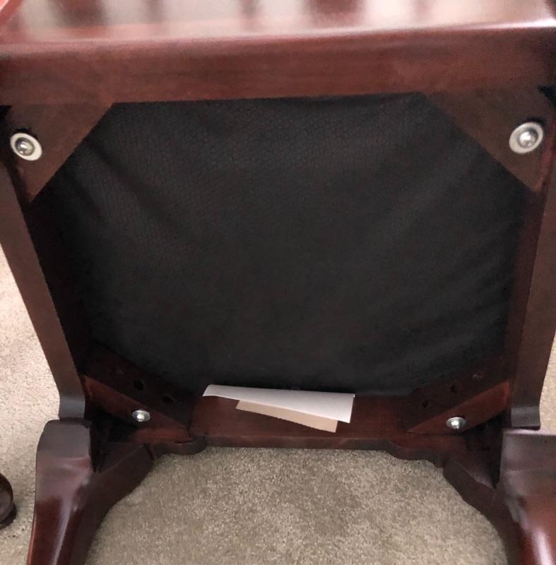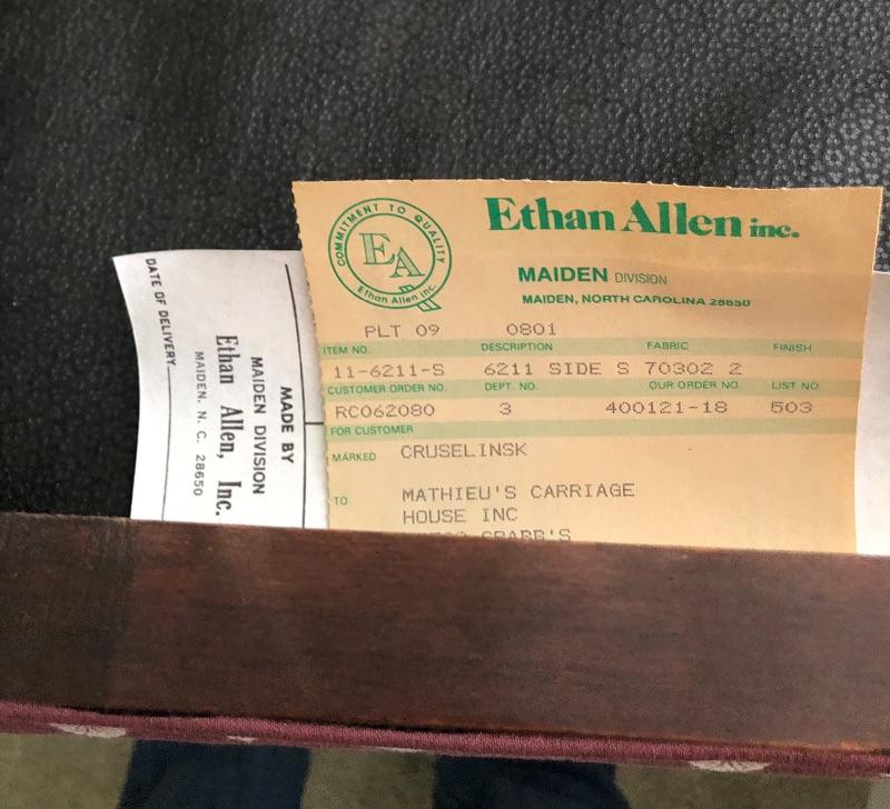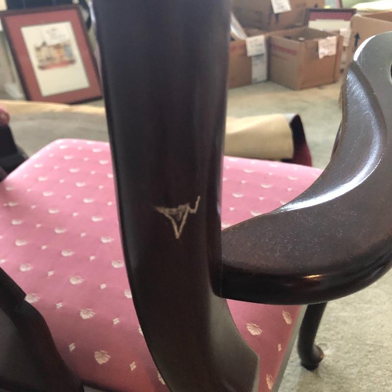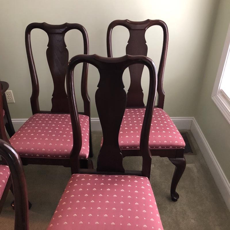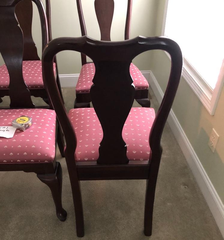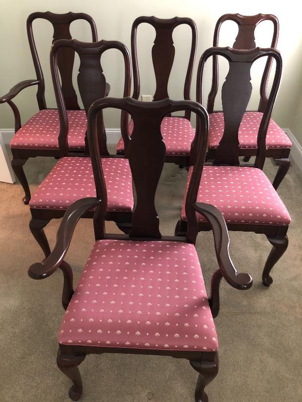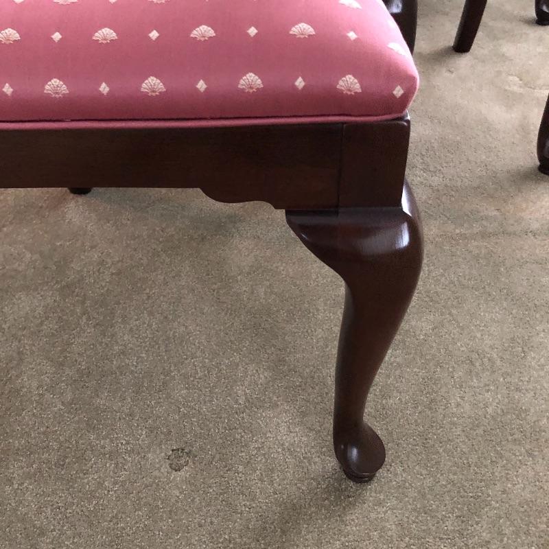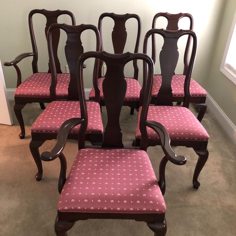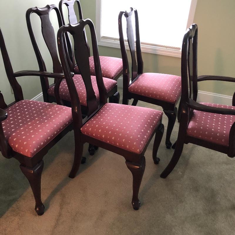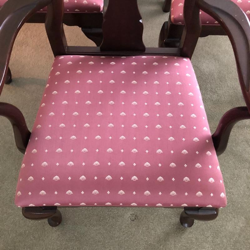 This set of six Ethan Allen dining chairs are in excellent condition with one chair having a small scratch see pictures (this has been updated as of Tuesday). There are two head of the table chairs with arms. The comfortable upholstered seats are a dusty pink color with a cream pattern.