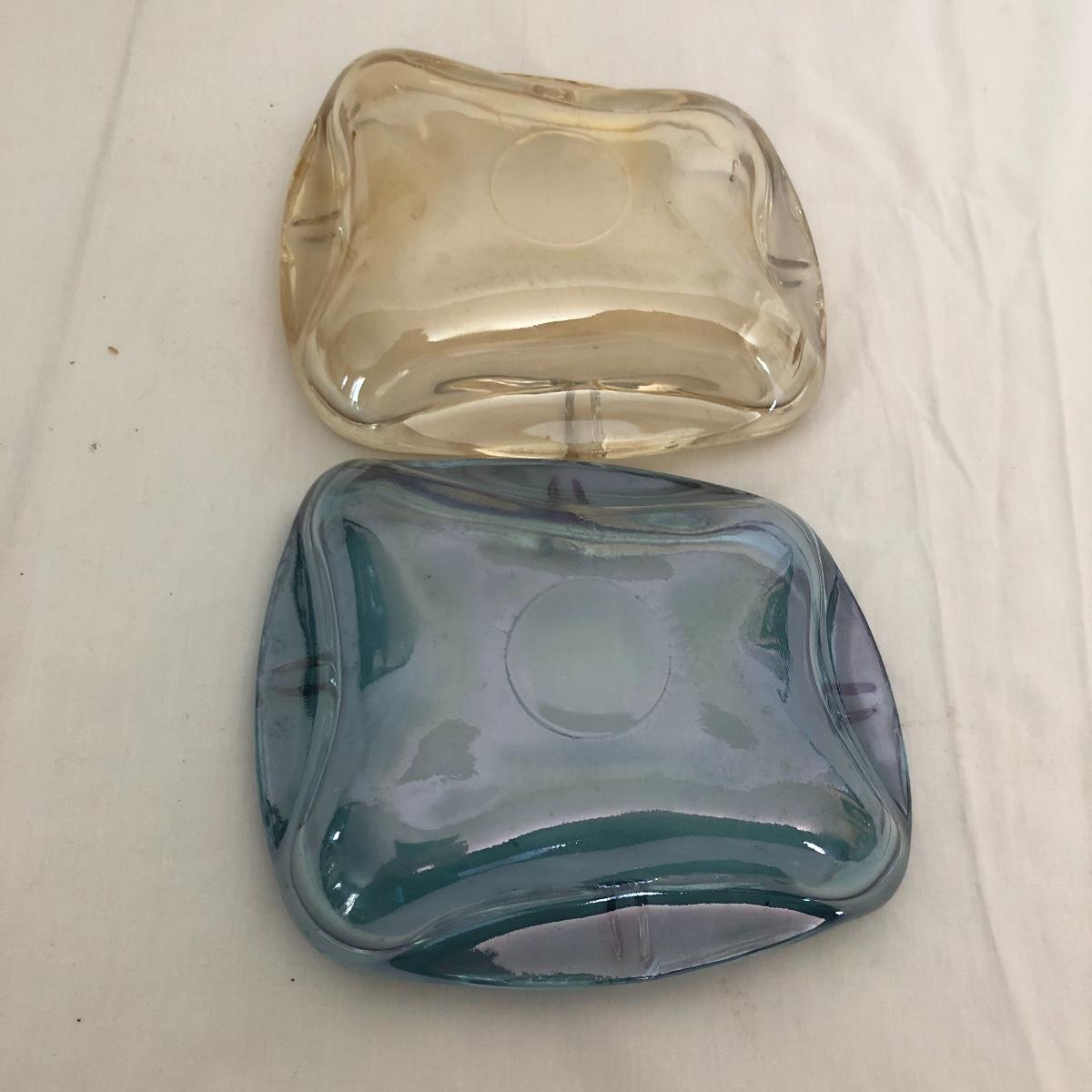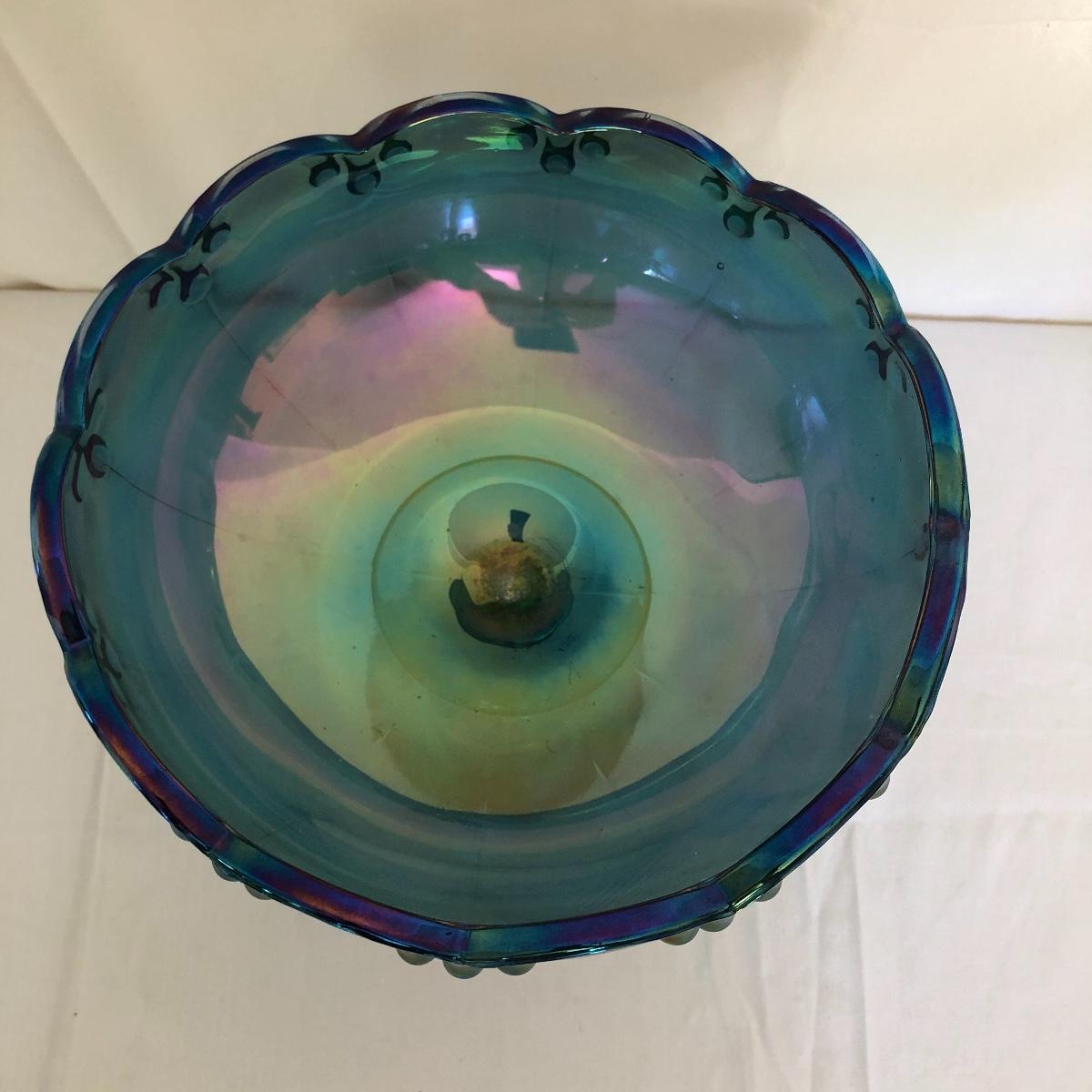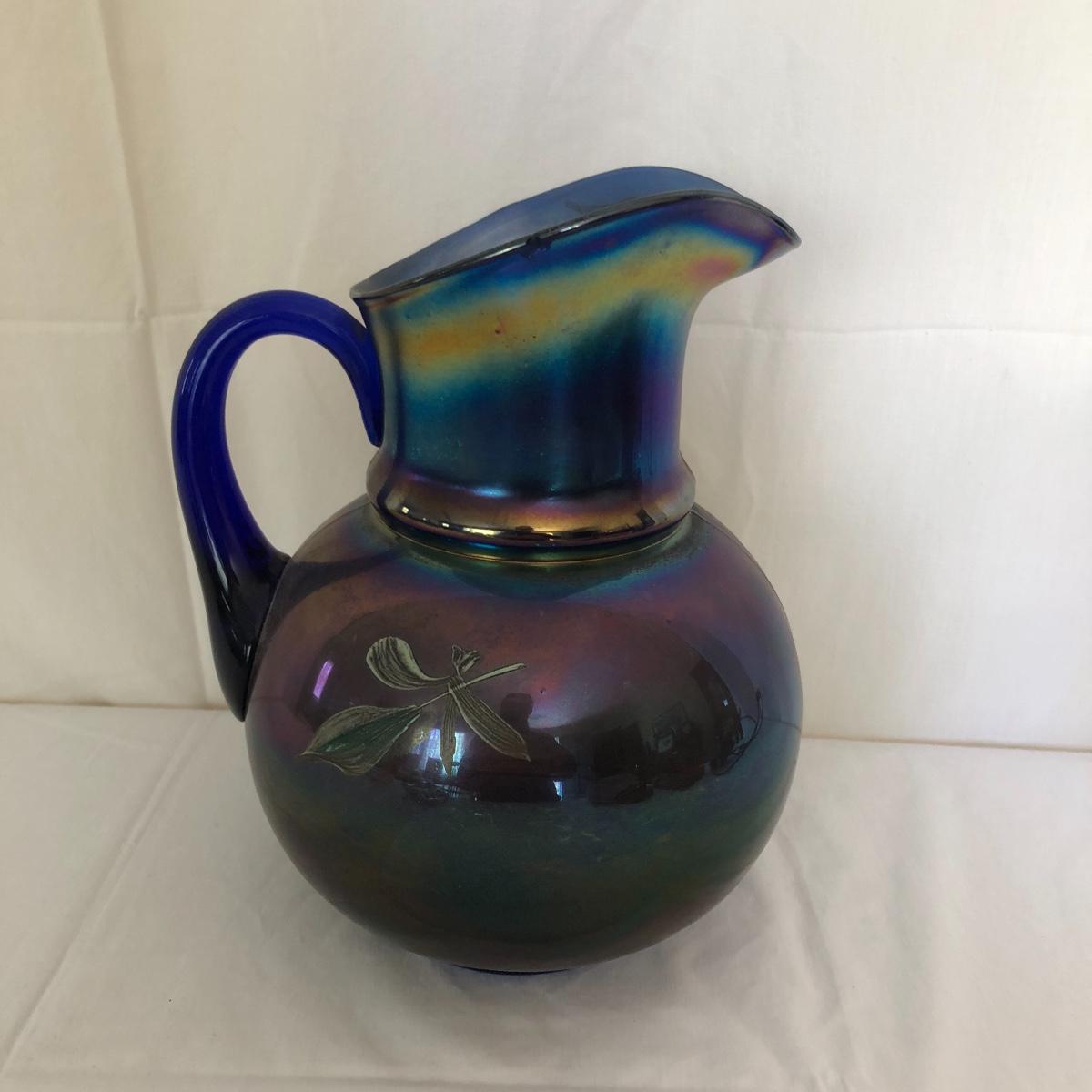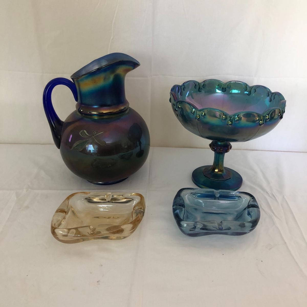 A lovely selection of carnival glass and more. Lot includes pitcher, footed bowl and two glass ashtrays. Pitcher measures 7.5”D x 10” tall.