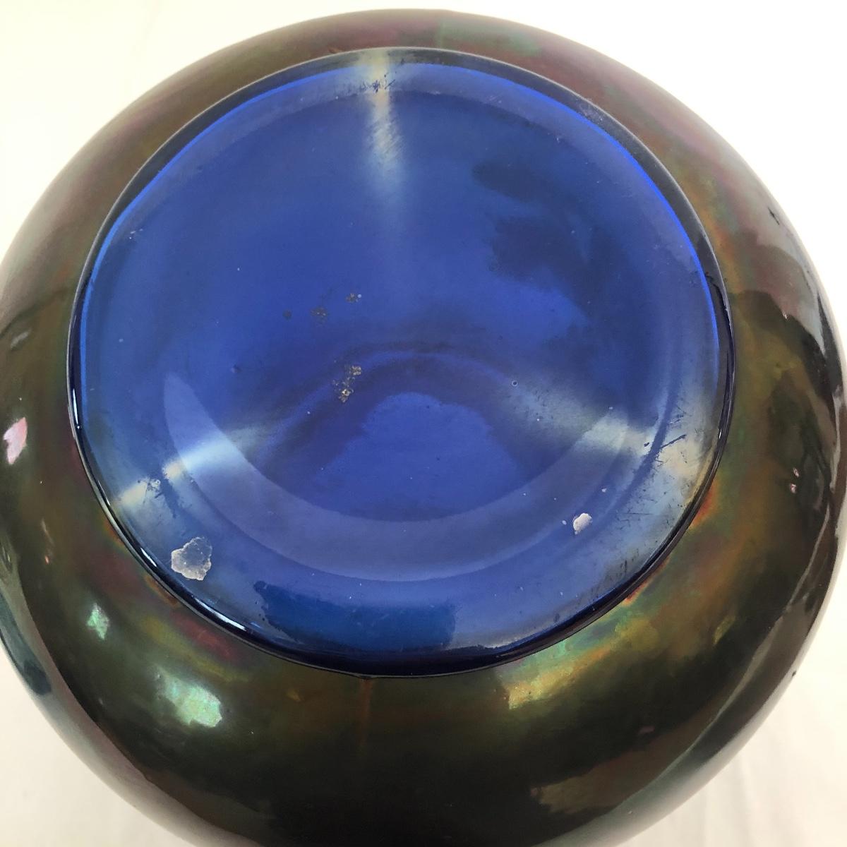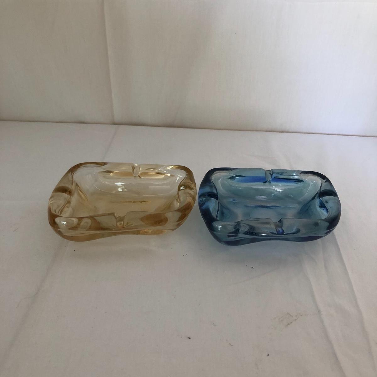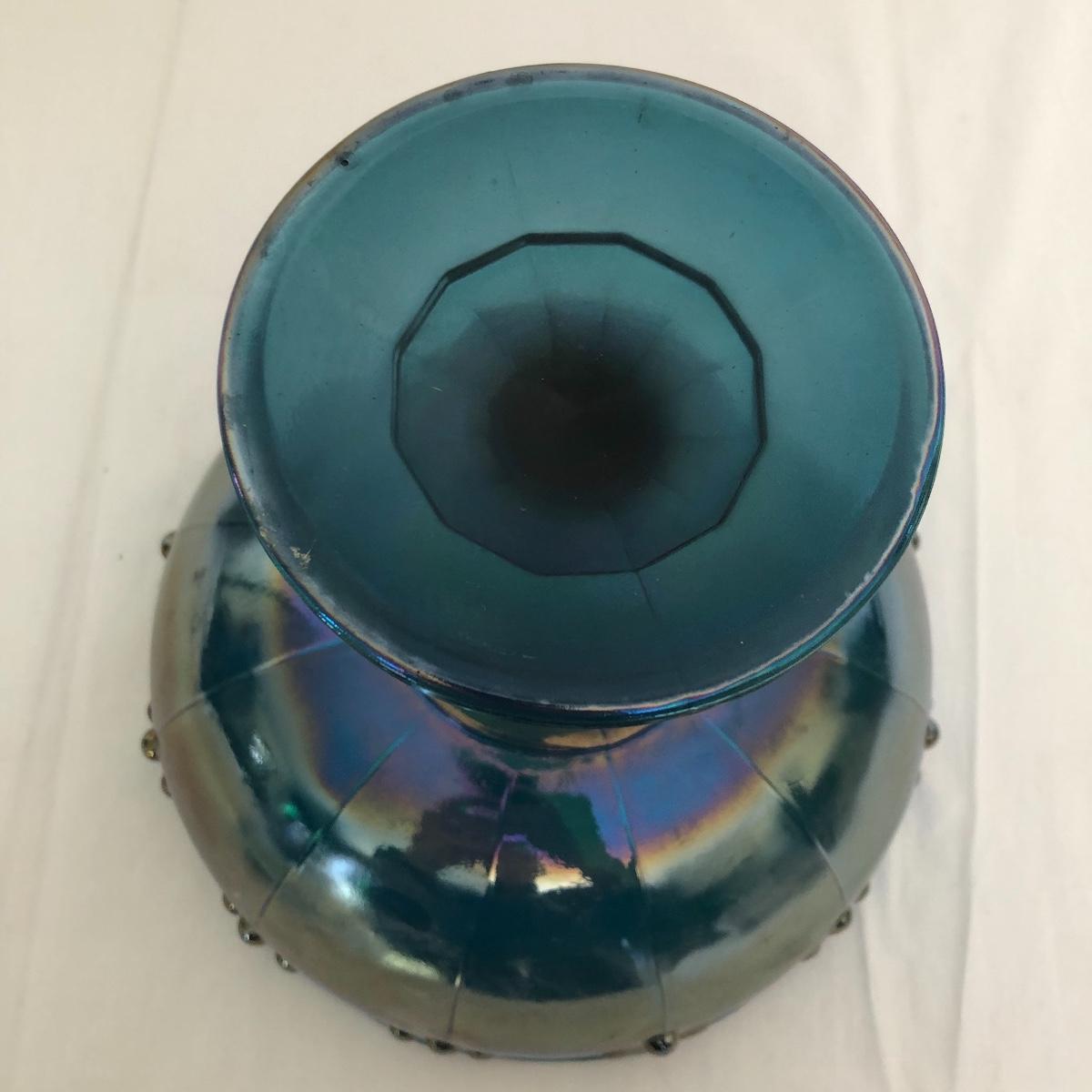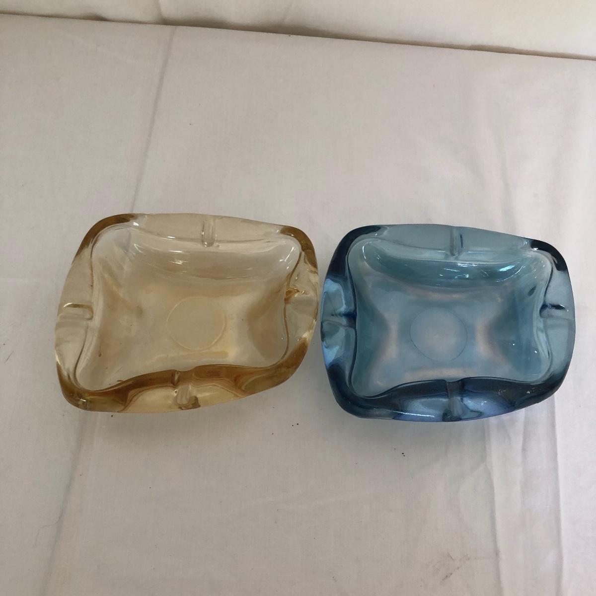A lovely selection of carnival glass and more. Lot includes pitcher, footed bowl and two glass ashtrays. Pitcher measures 7.5”D x 10” tall.