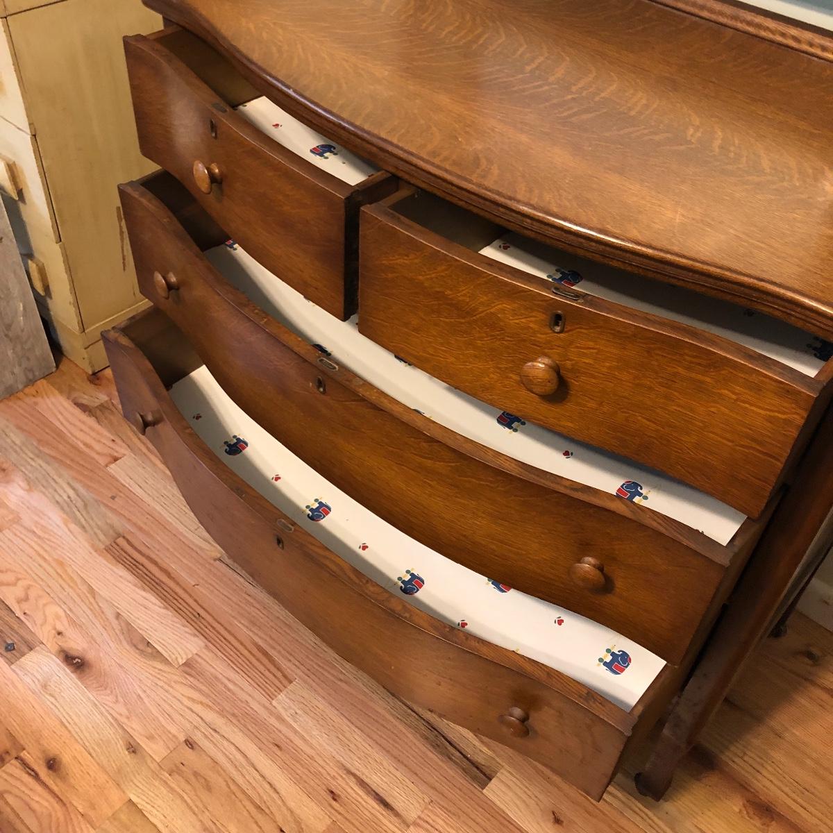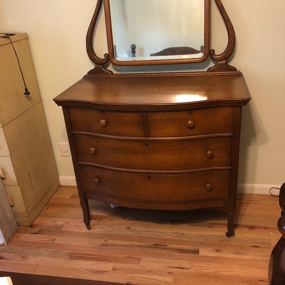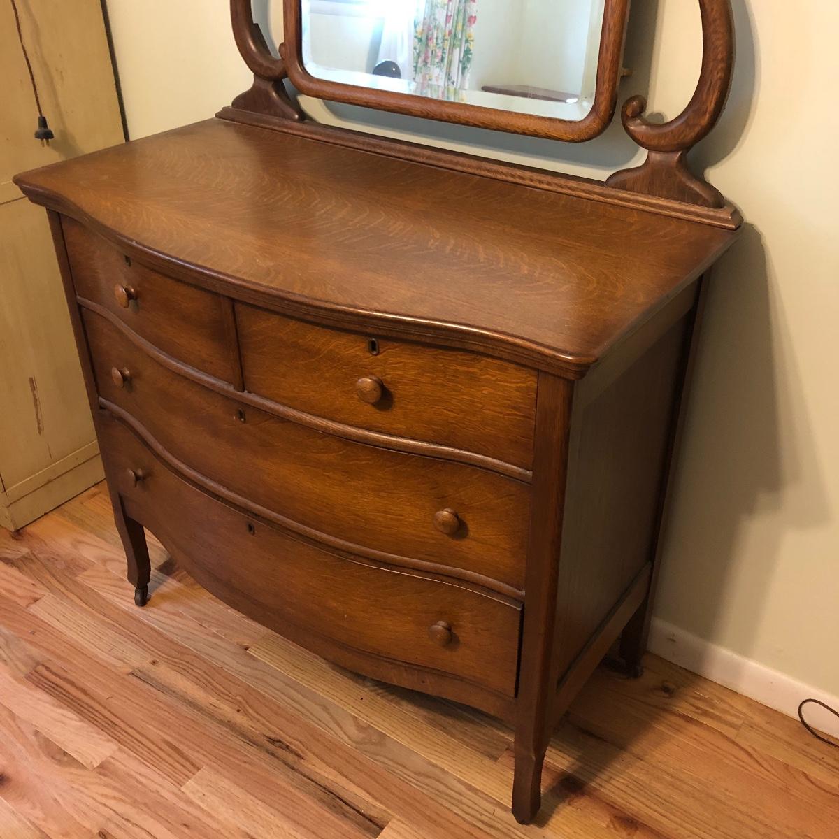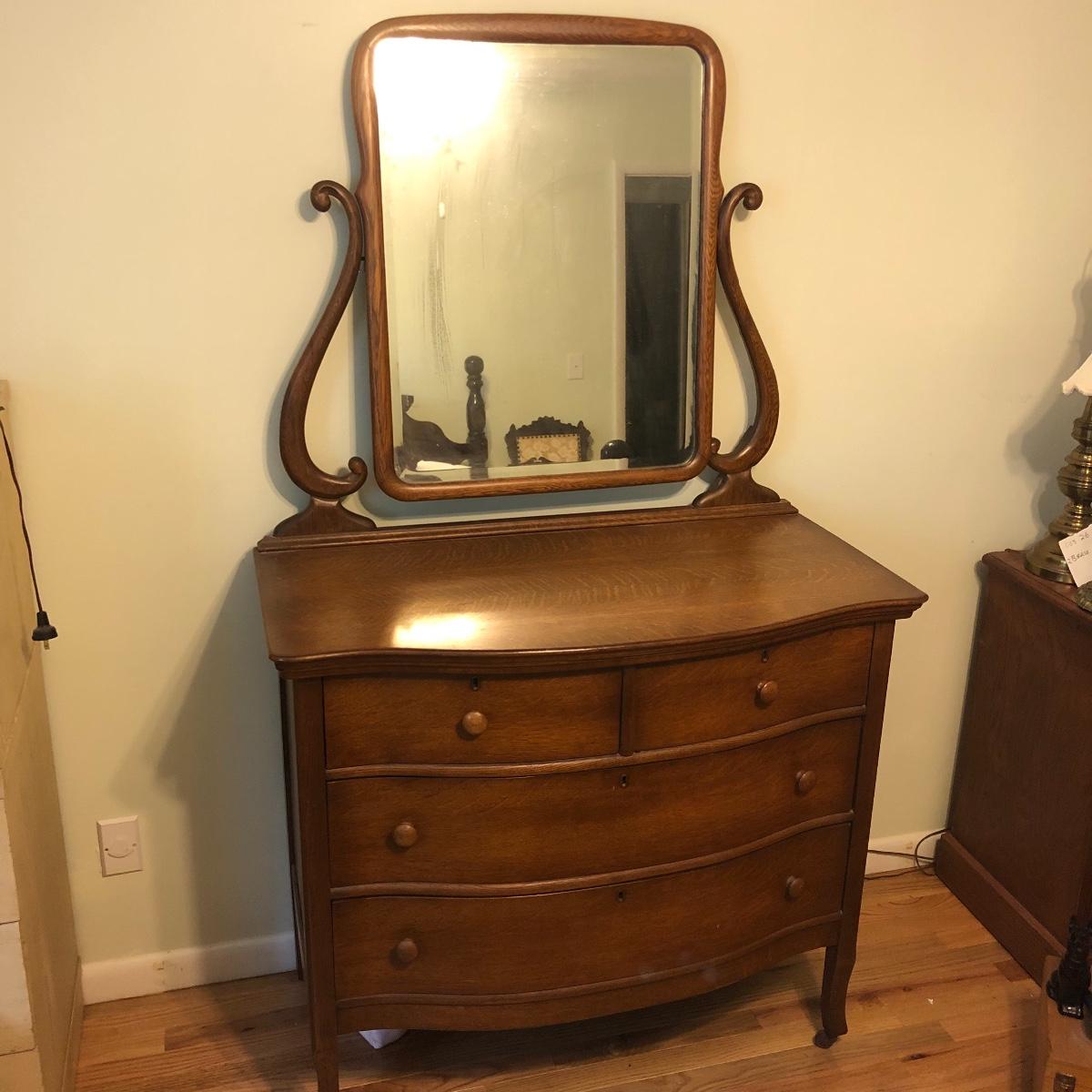 This beautiful four dovetailed drawer curved front antique vanity with beveled mirror will look great in any home. Vanity is in excellent shape and has wooden casters. There are some marks on the mirror that appear to be permanent, see images. Dresser measures 21L” x 39.5W” x 35.5H” and mirror and bracket measure 33.5” x 39”.