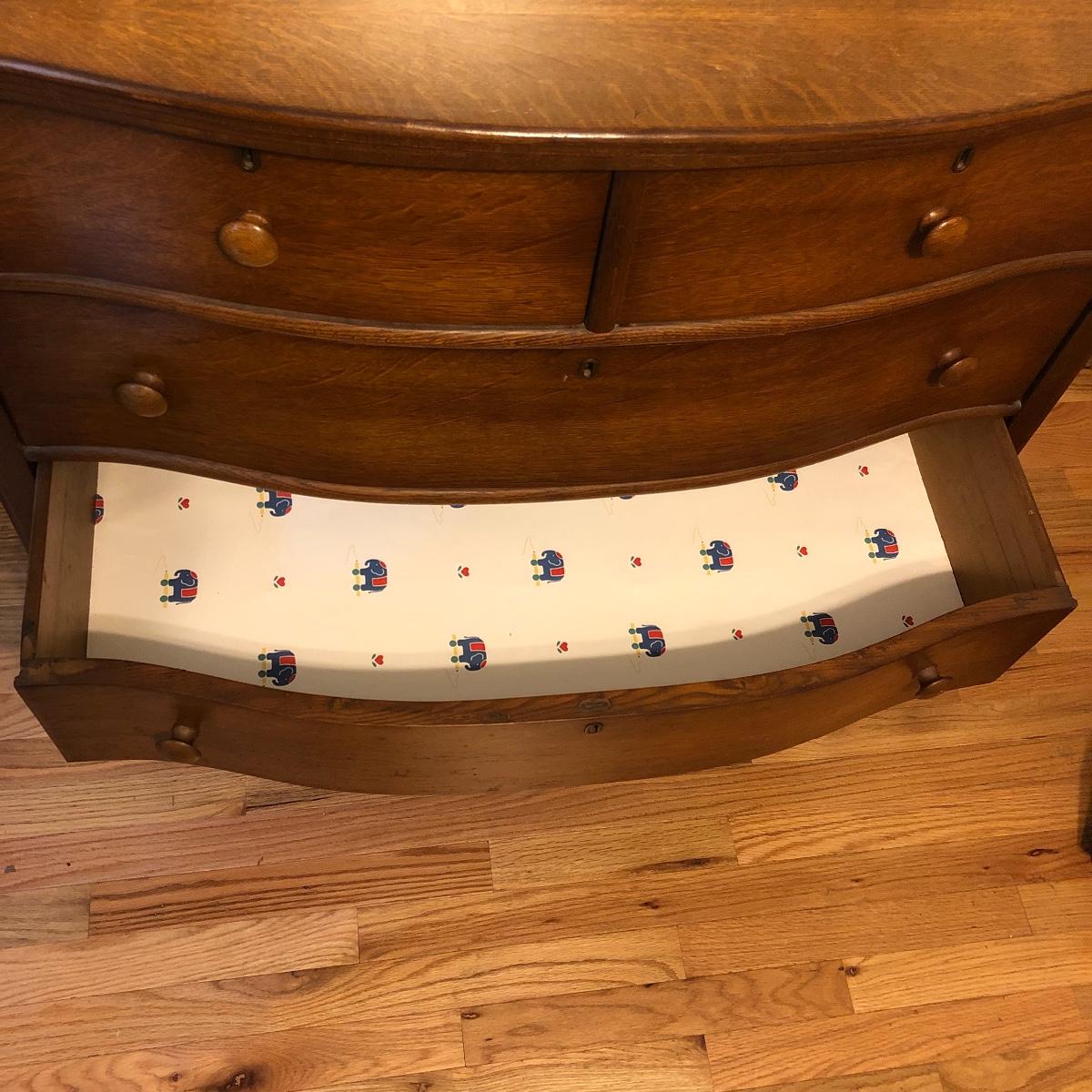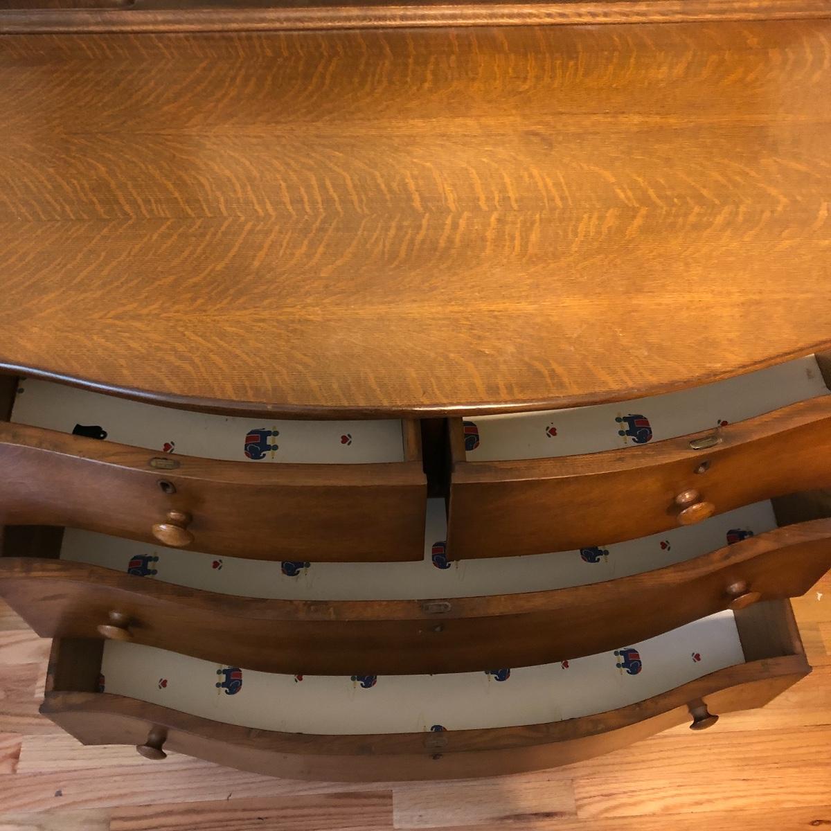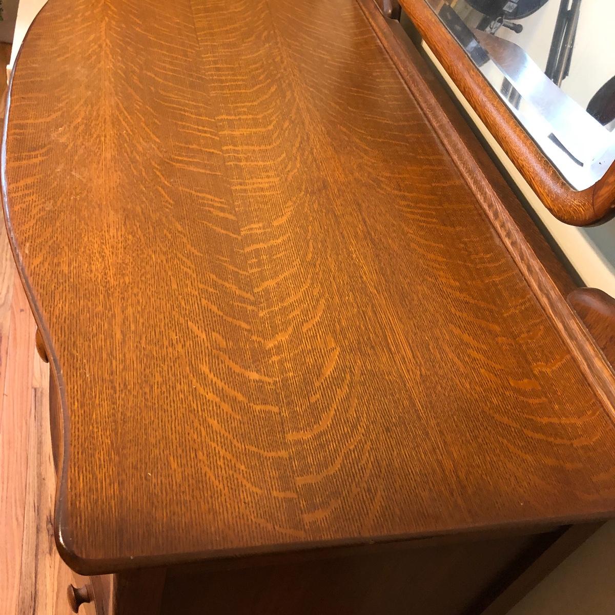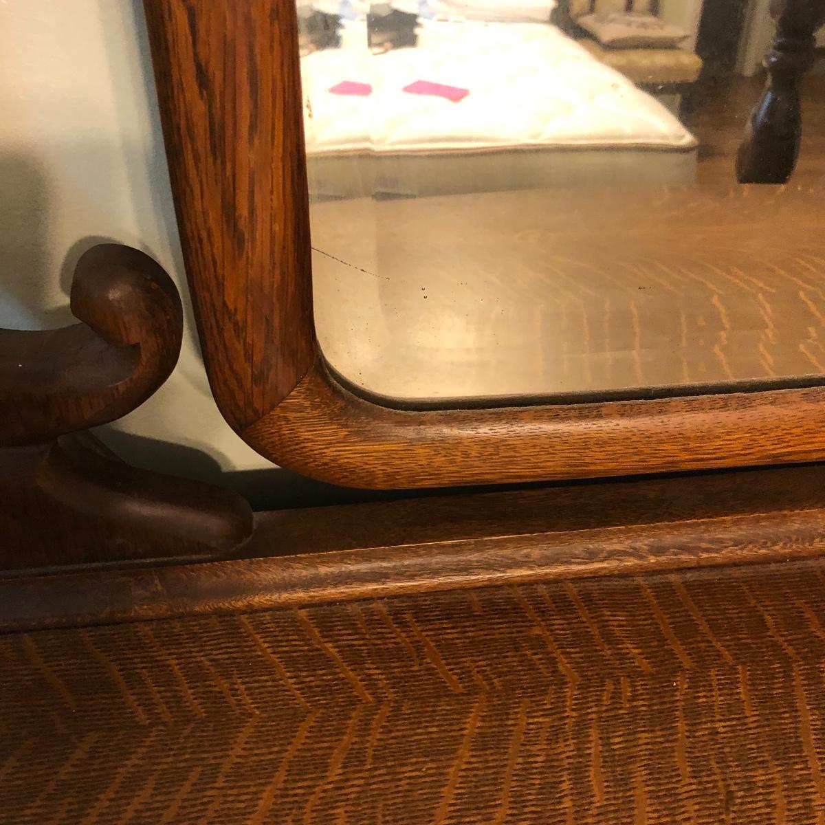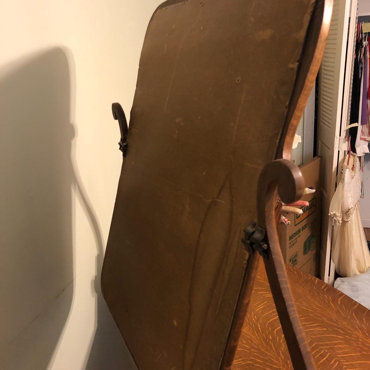 This beautiful four dovetailed drawer curved front antique vanity with beveled mirror will look great in any home. Vanity is in excellent shape and has wooden casters. There are some marks on the mirror that appear to be permanent, see images. Dresser measures 21L” x 39.5W” x 35.5H” and mirror and bracket measure 33.5” x 39”.
