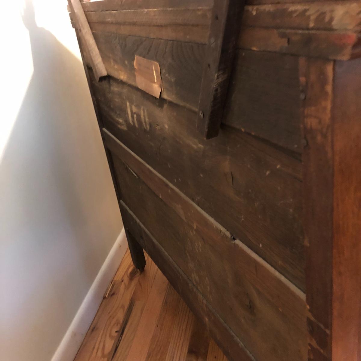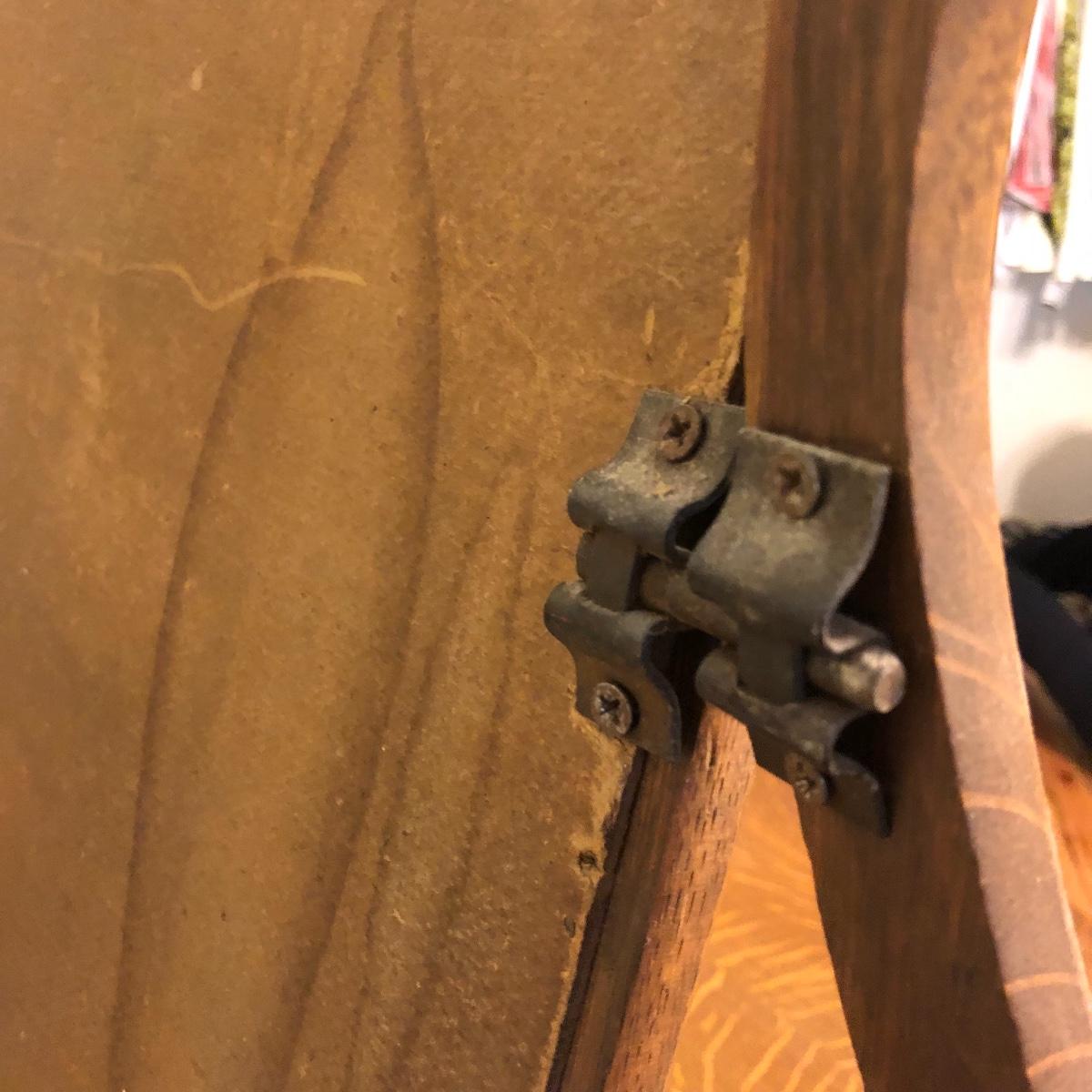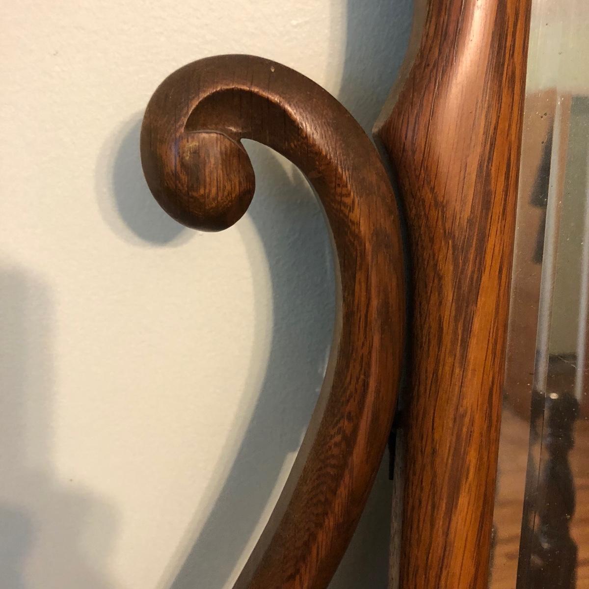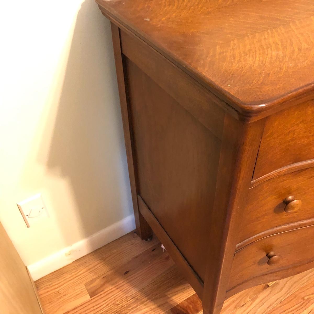 This beautiful four dovetailed drawer curved front antique vanity with beveled mirror will look great in any home. Vanity is in excellent shape and has wooden casters. There are some marks on the mirror that appear to be permanent, see images. Dresser measures 21L” x 39.5W” x 35.5H” and mirror and bracket measure 33.5” x 39”.