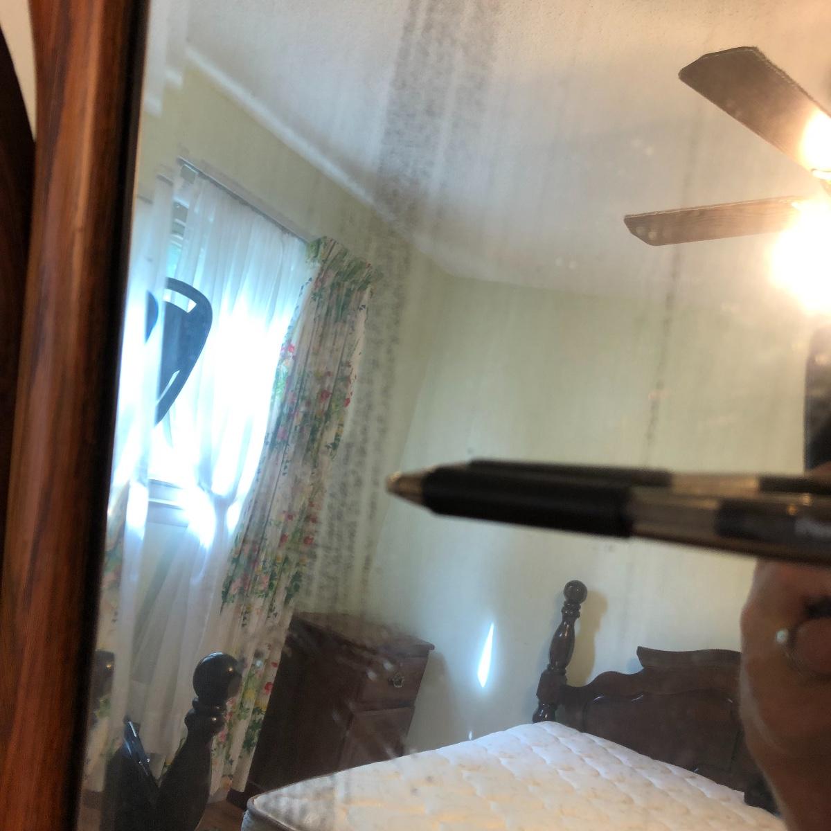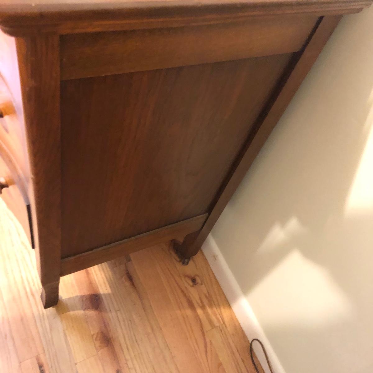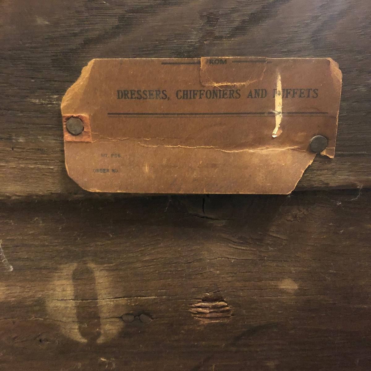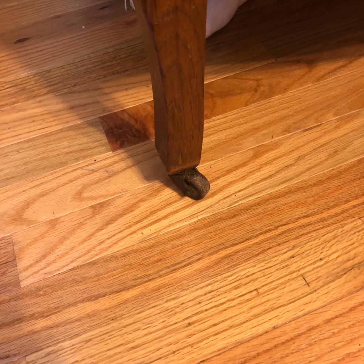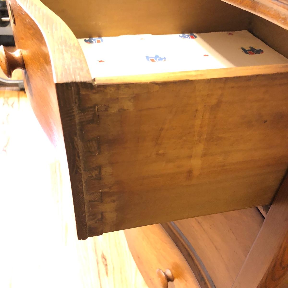 This beautiful four dovetailed drawer curved front antique vanity with beveled mirror will look great in any home. Vanity is in excellent shape and has wooden casters. There are some marks on the mirror that appear to be permanent, see images. Dresser measures 21L” x 39.5W” x 35.5H” and mirror and bracket measure 33.5” x 39”.