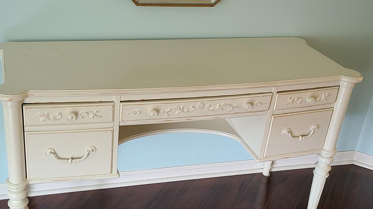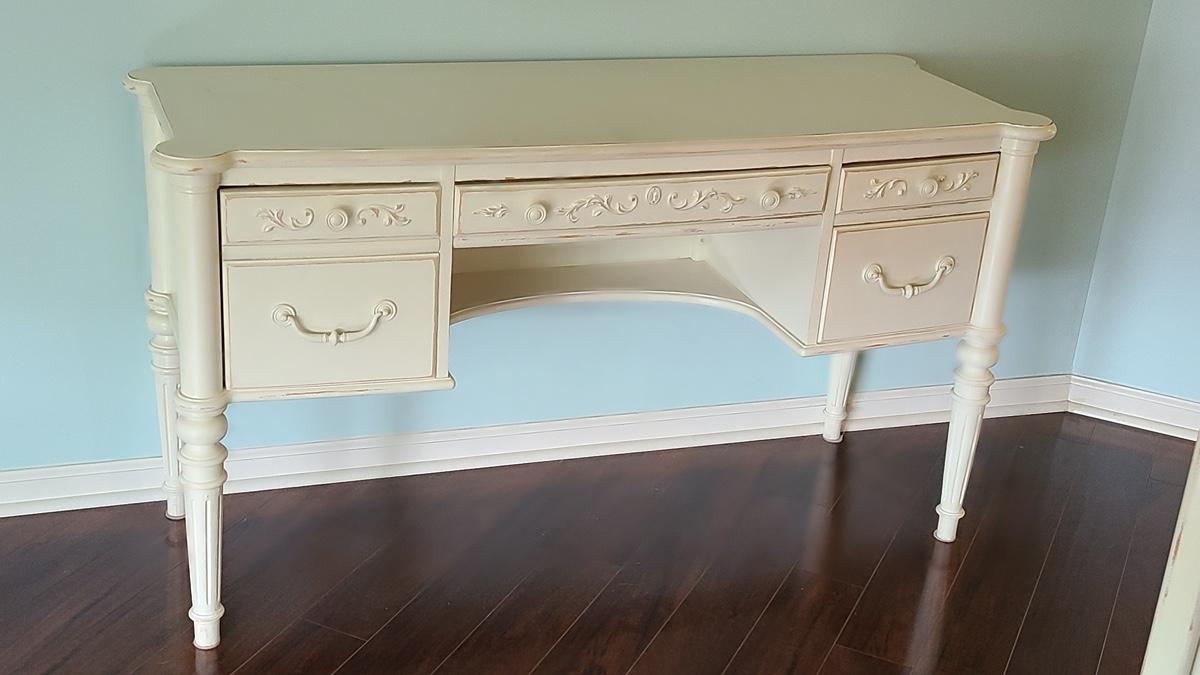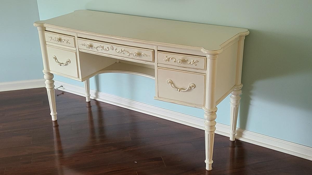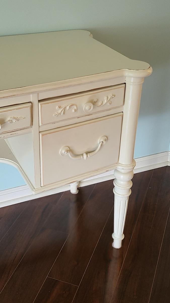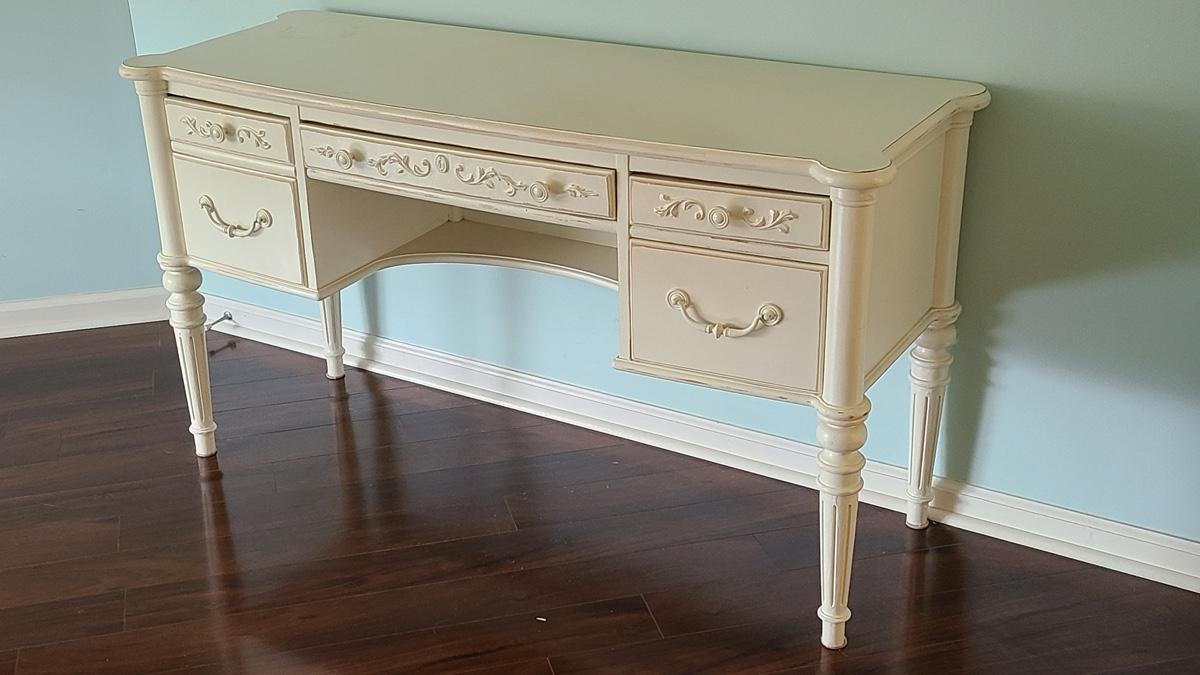 Lovely Vanity table or small desk. Please see all pictures for content of the lot, condition of the lot, and measurements if taken. Pictures are the best representation of the items listed and items are untested unless indicated in description. Thank you for looking and have fun bidding!