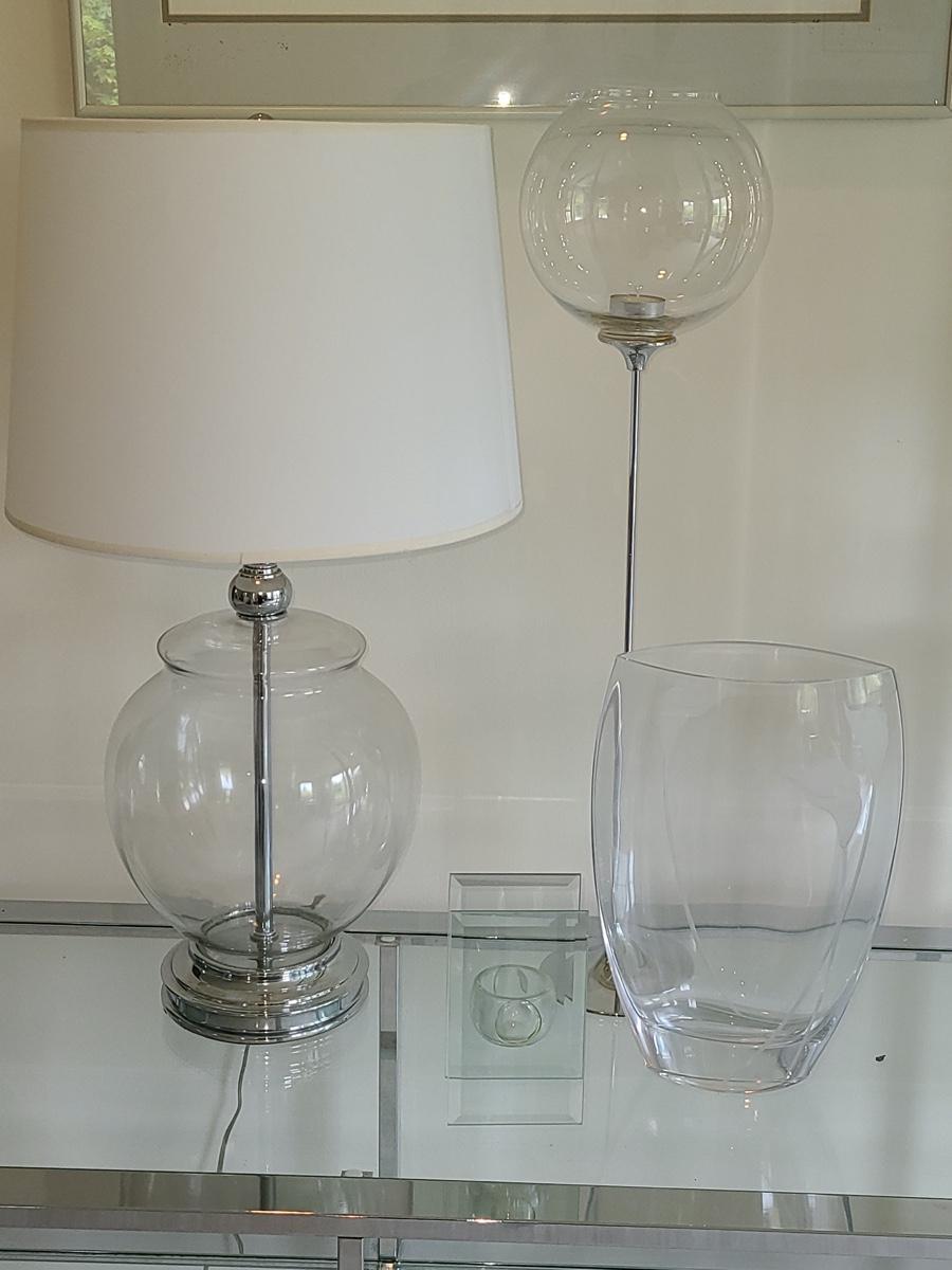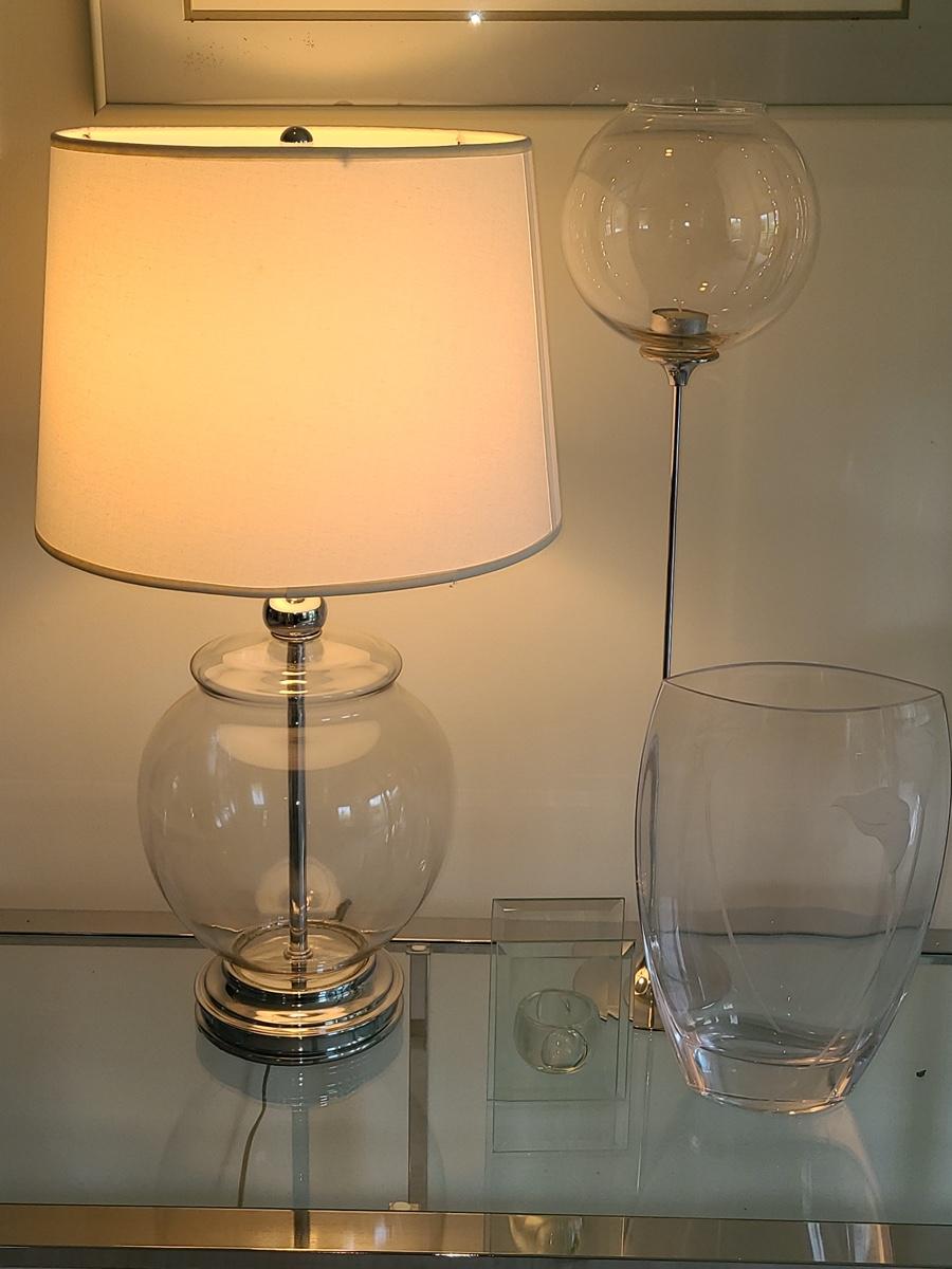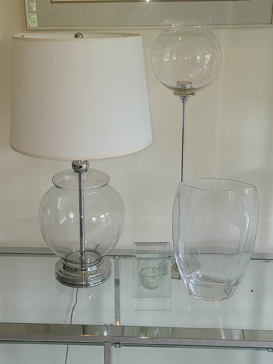 Lot 134: Home Accents: Chrome Based Lamp, Etched Glass Vase and More