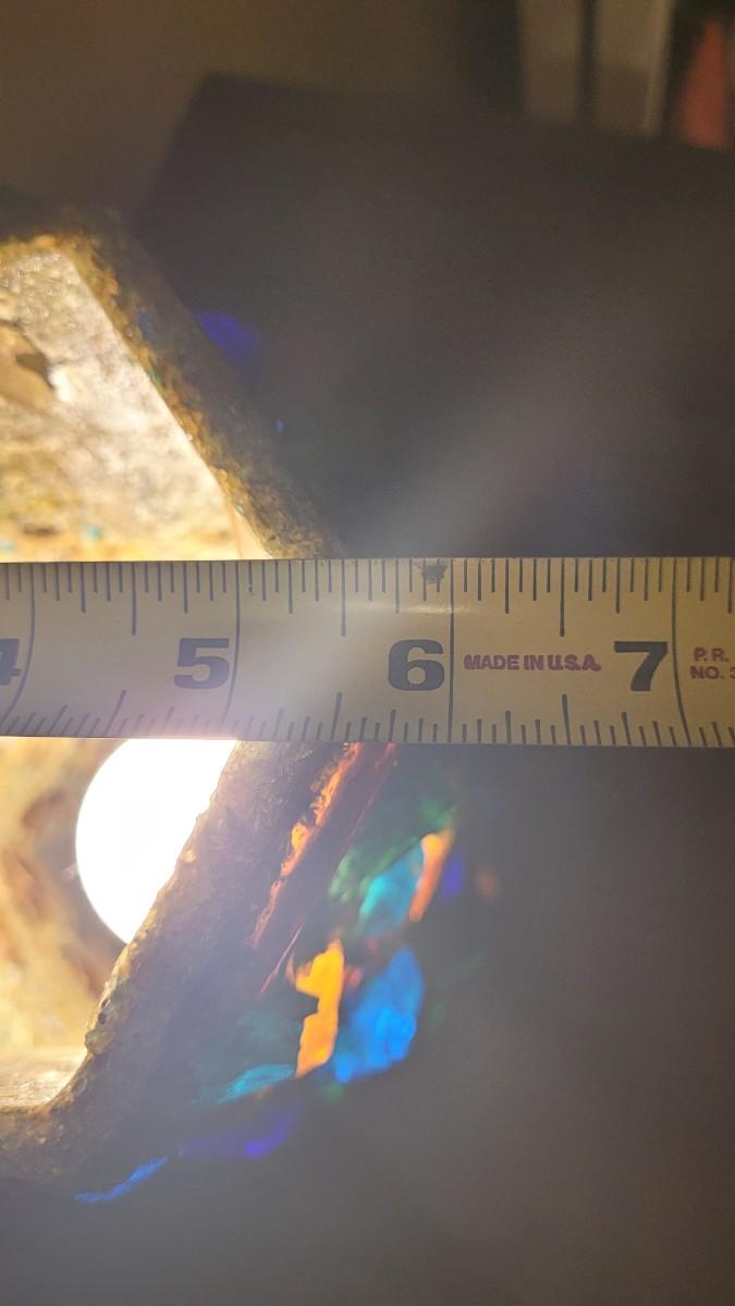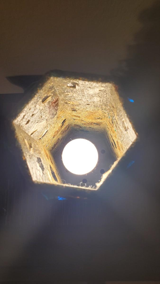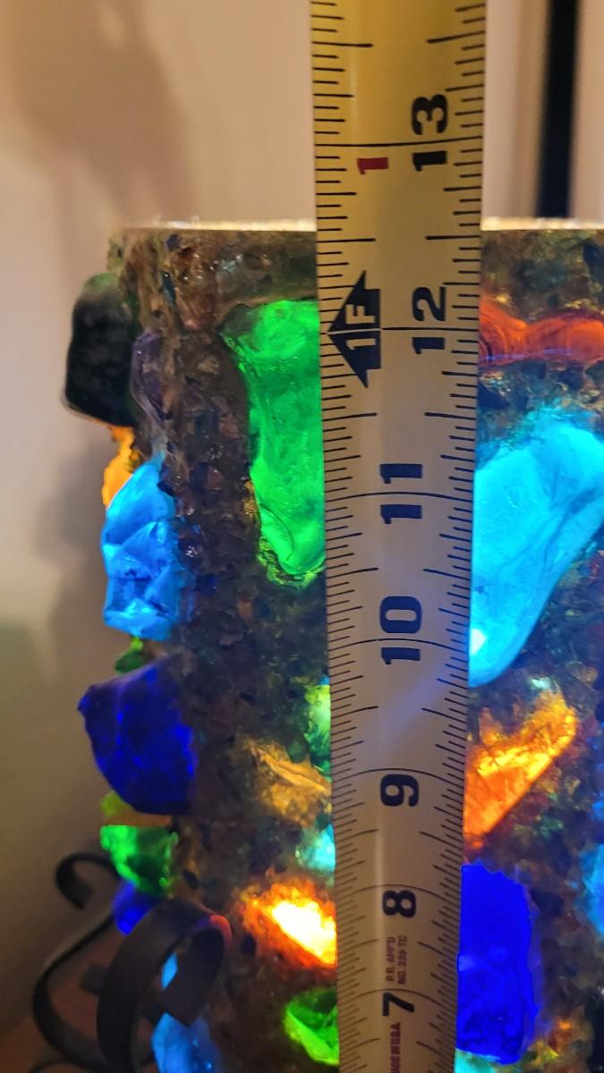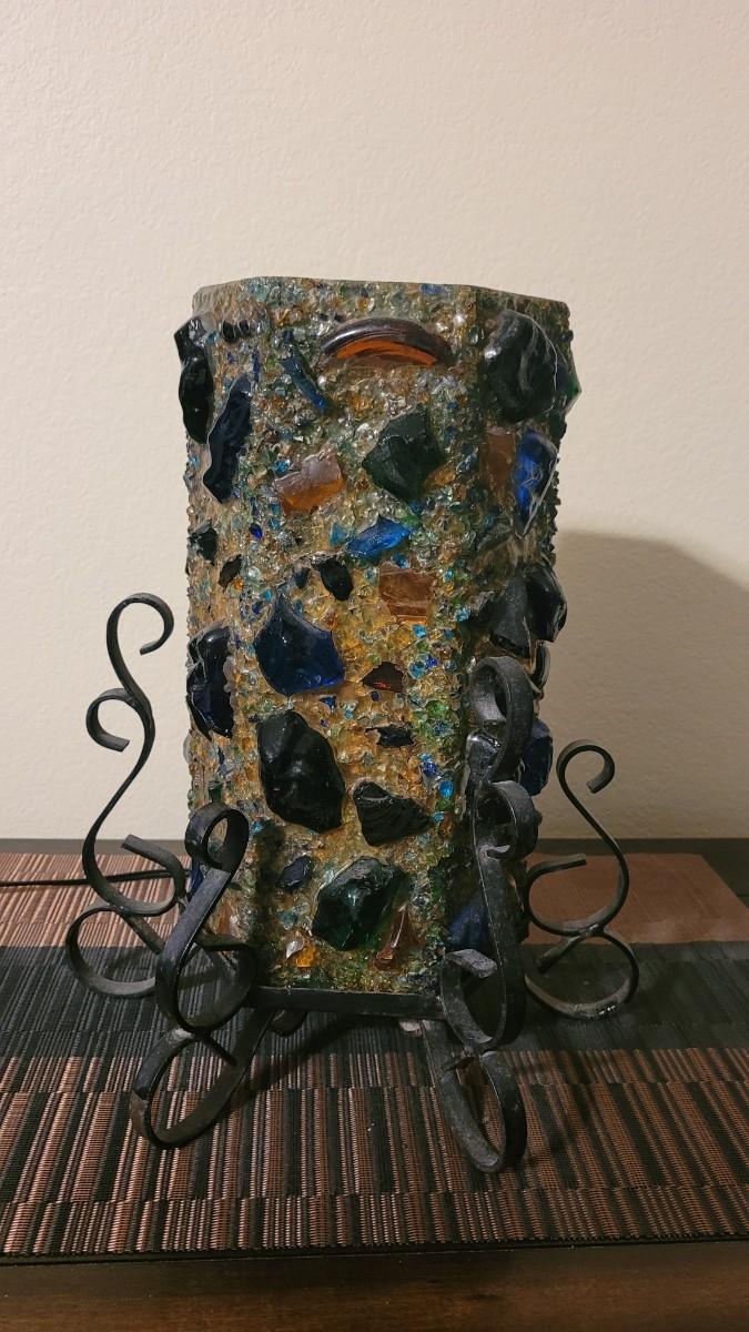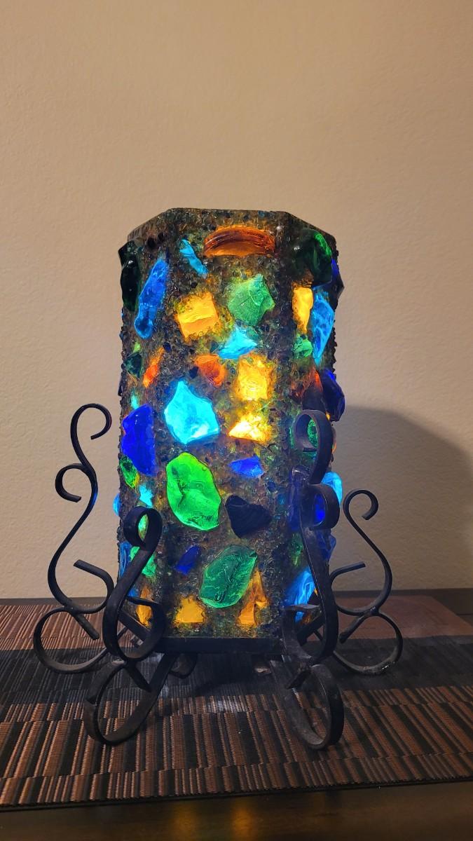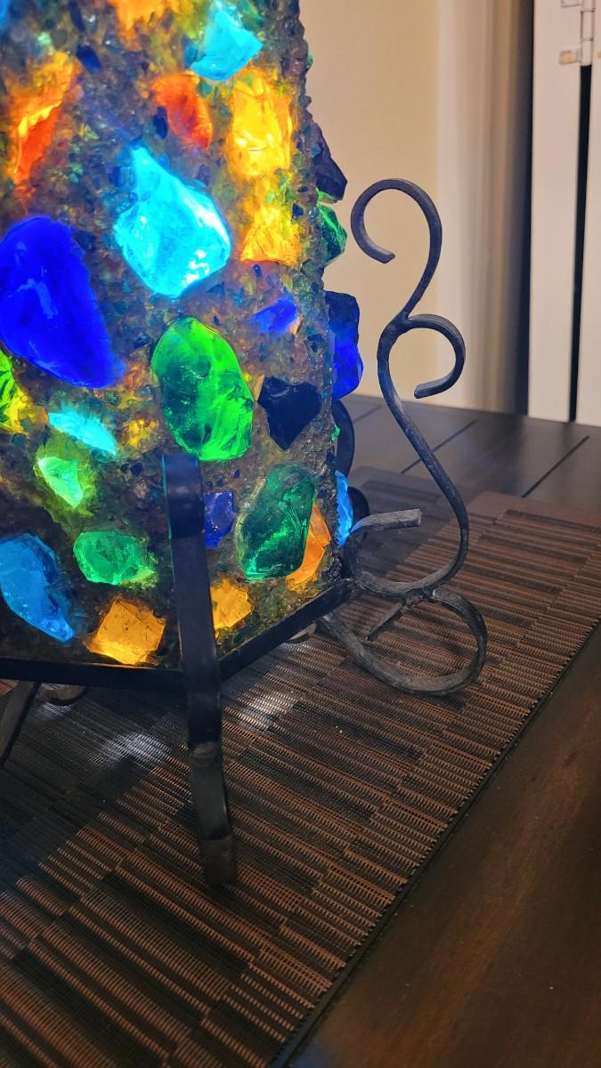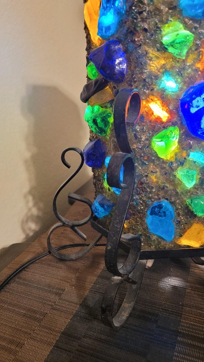 Metal base, Lamp Shade has large chunks of colored glass. Even better in person!