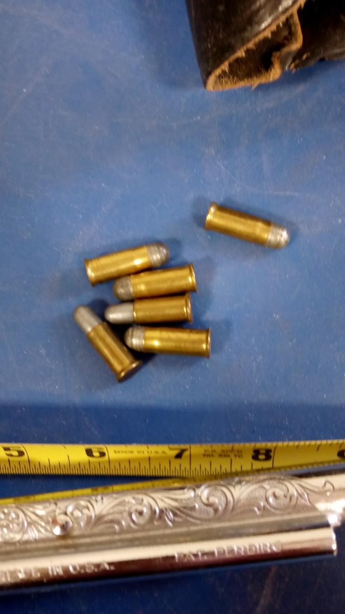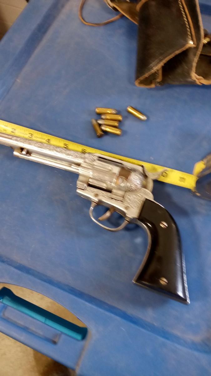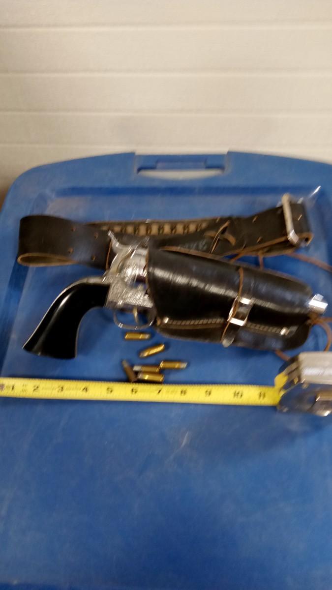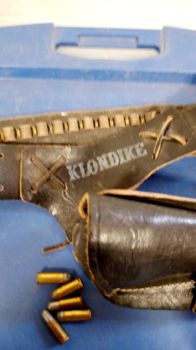 SIX BULLETS IN GUN AND 11 MORE IN BELT GUN WORKS AND HOLSTER MARKED KLONDIKE