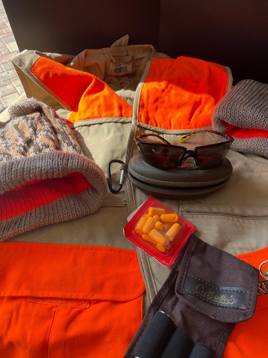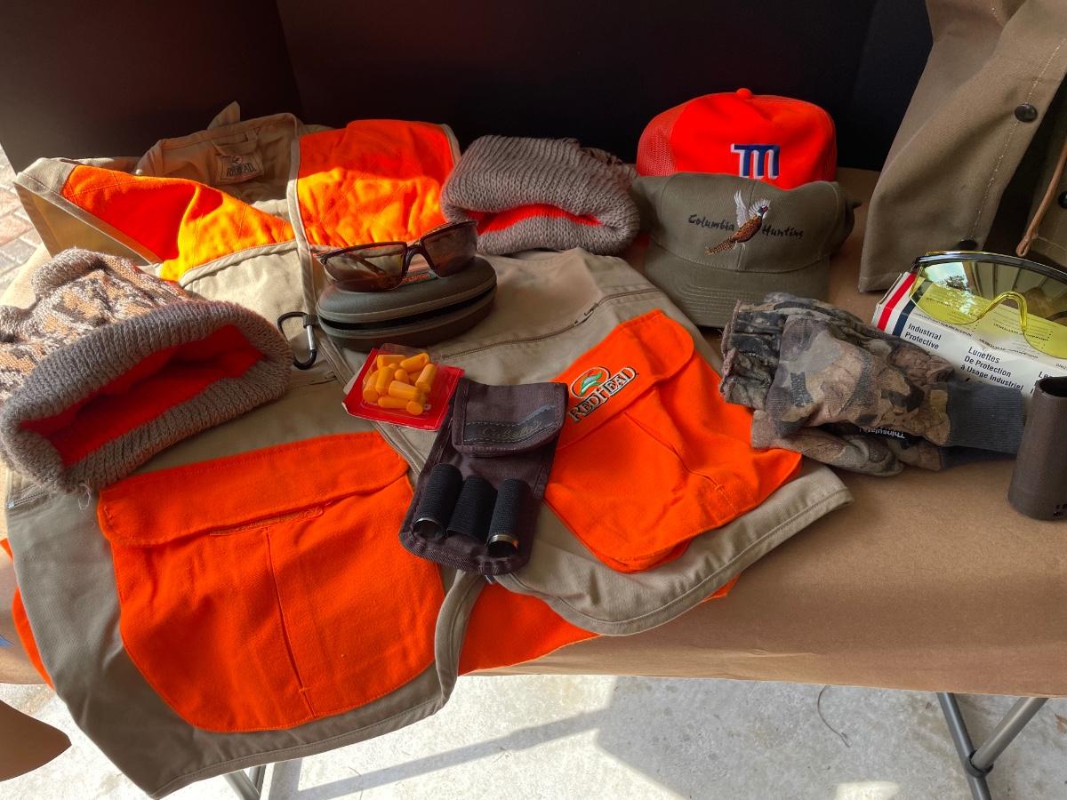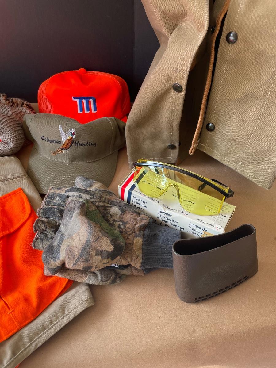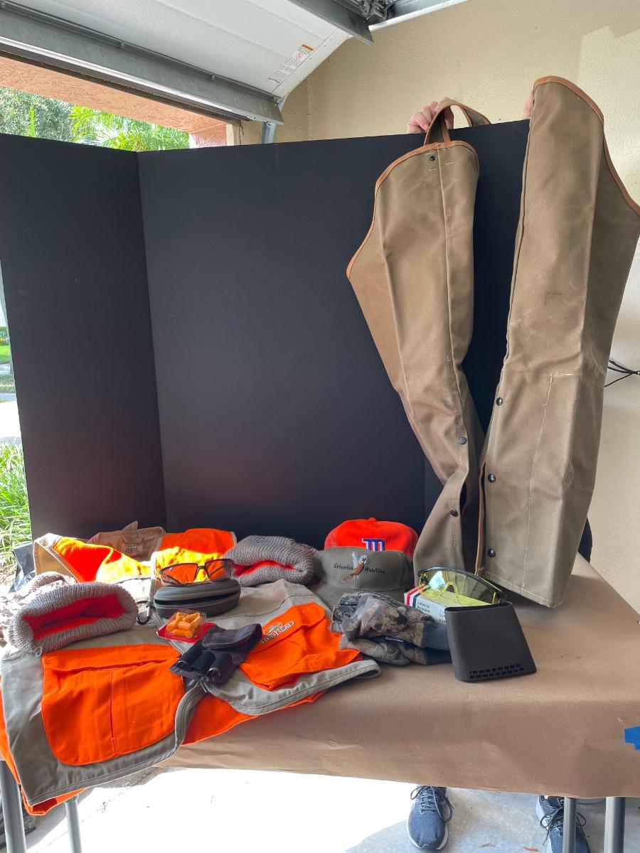 canvas waders, stocking cap, neck warmer, ear pugs, hunting vest gloves, carrying bag