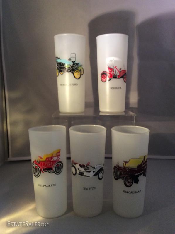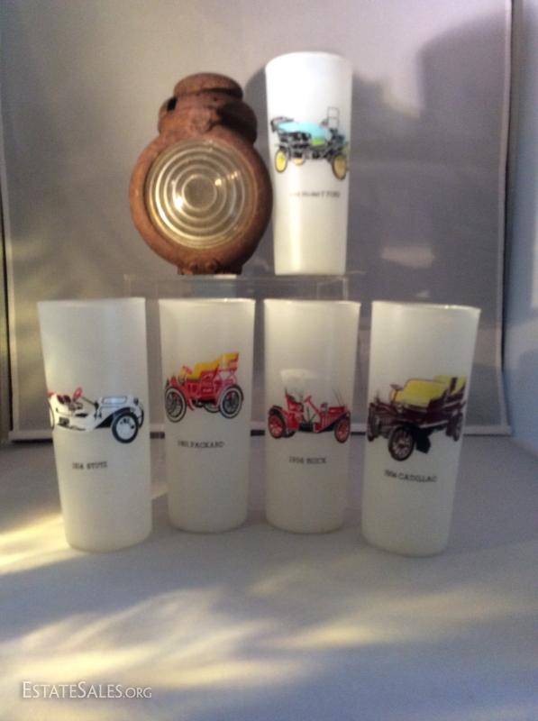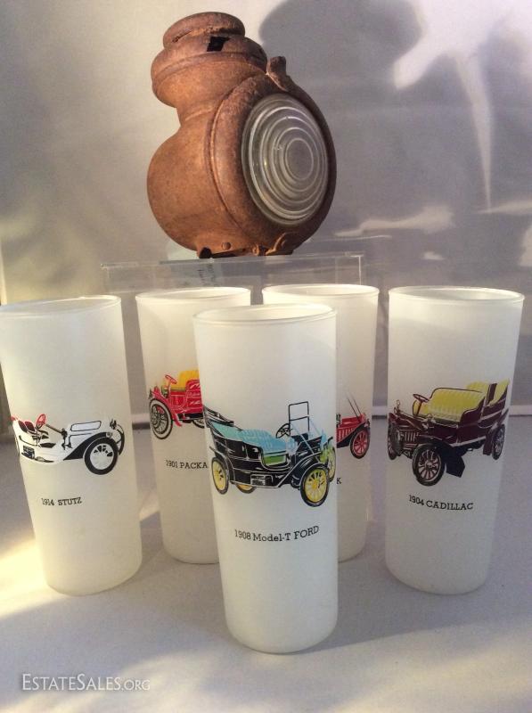 Great vintage highball glasses each having the signature car from each American car manufacturer. Plus a real treasure of a Ford Model - T headlight, very rusted, includes all it's lenses.