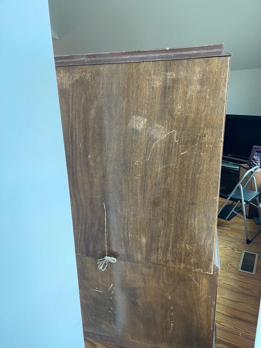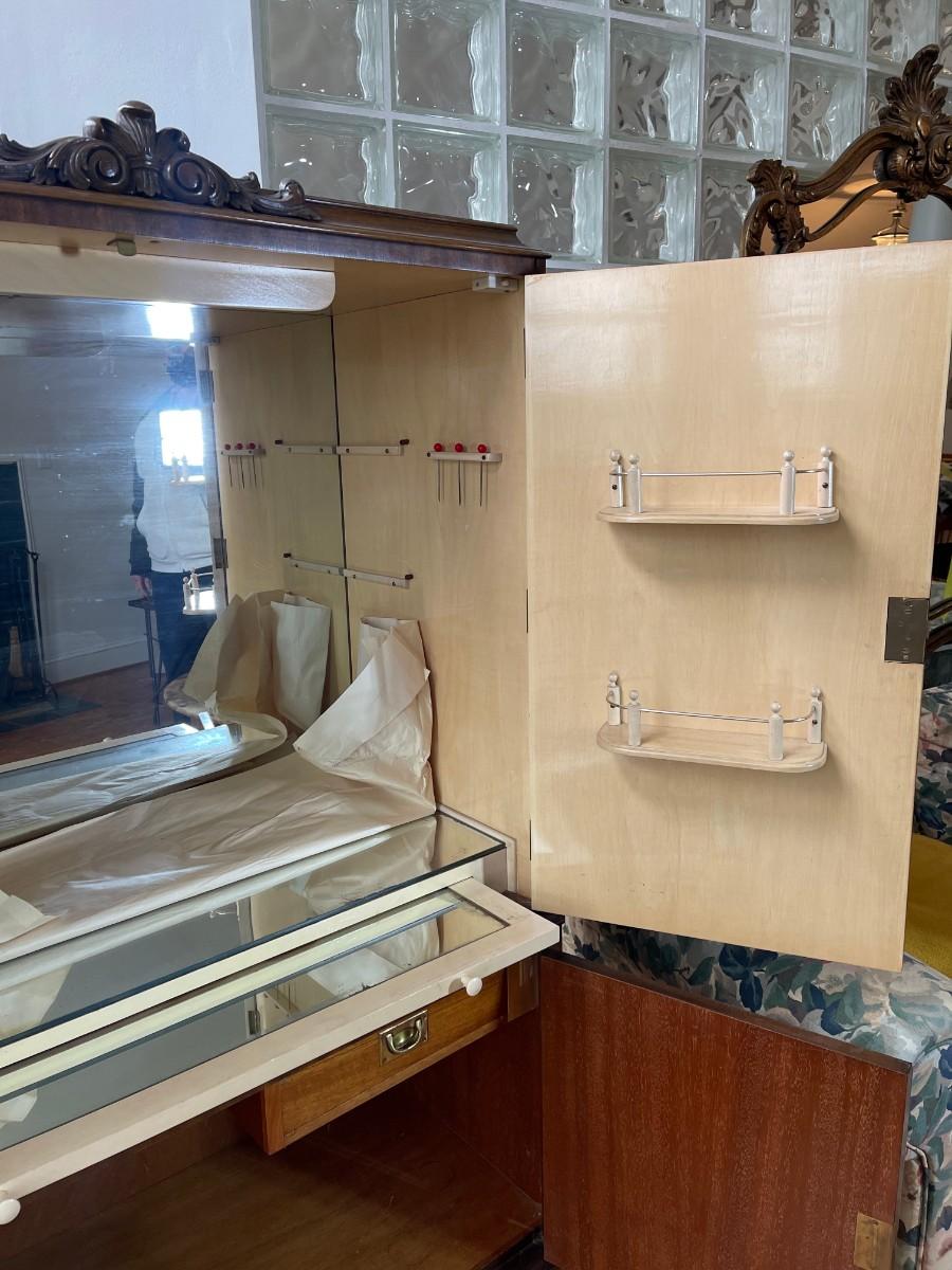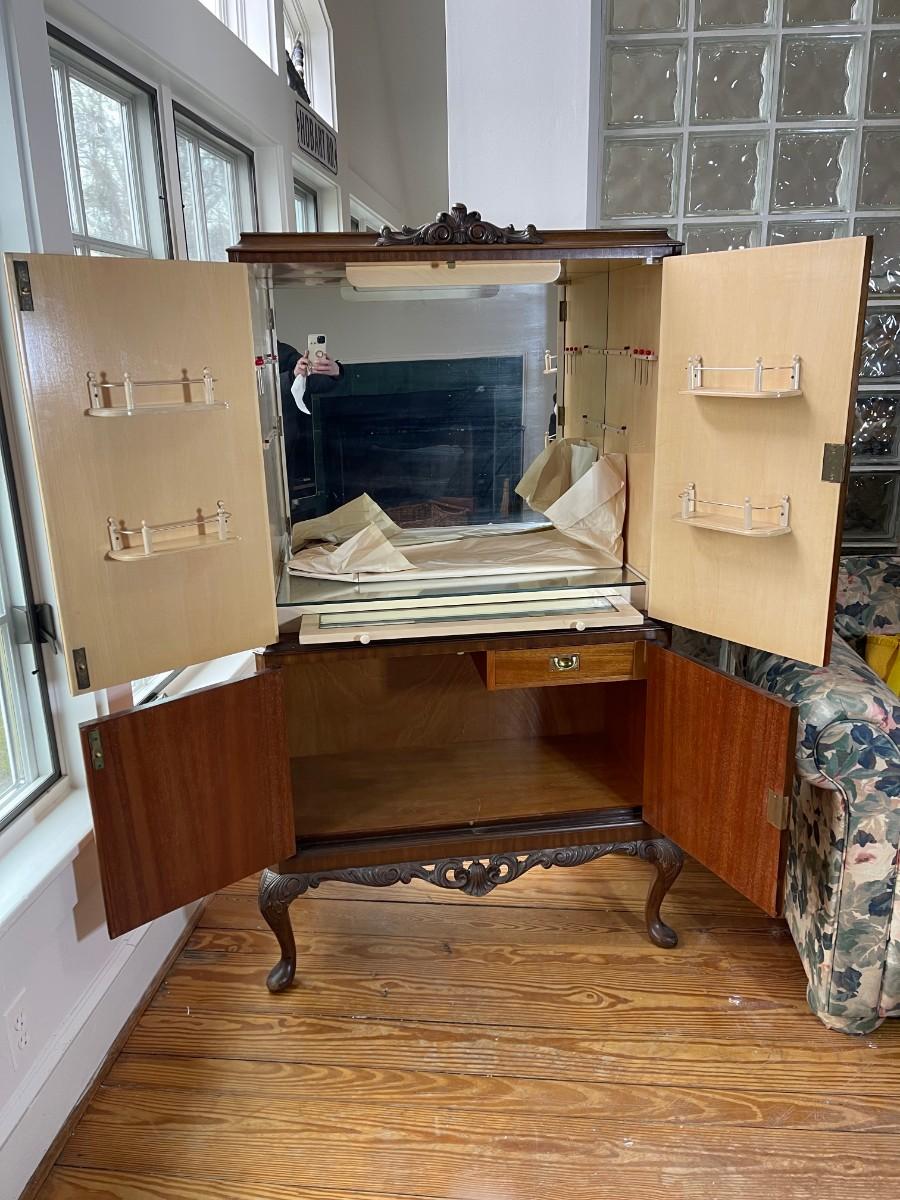 Top part has an inside mirror, shelves, pull out shelf to prep your cocktails, storage shelves built in on each side, cream colored, doors close with a key.