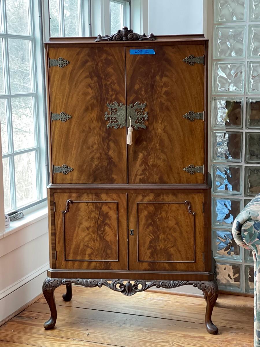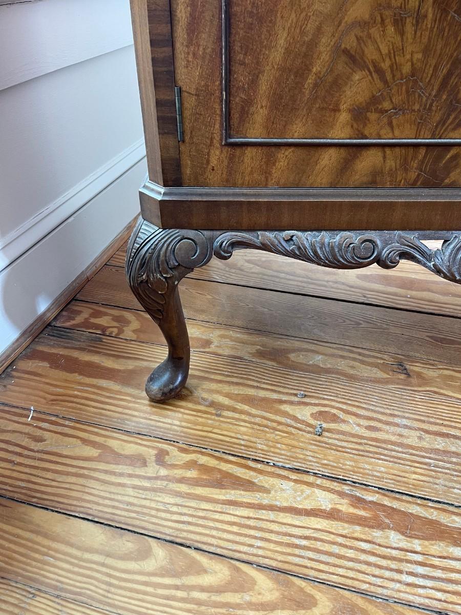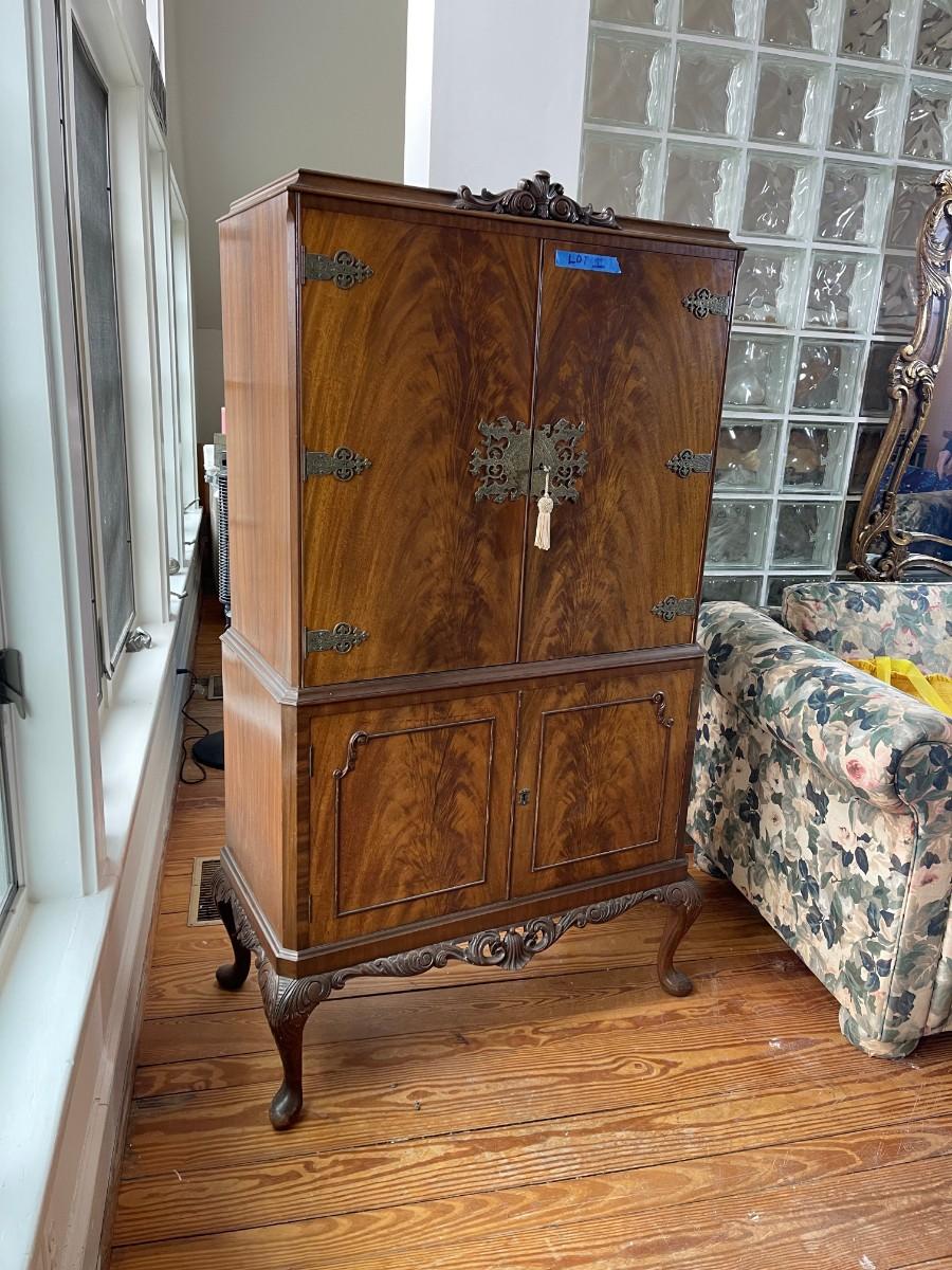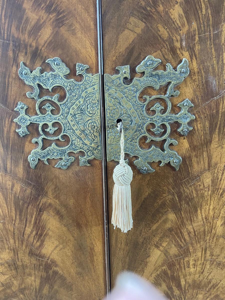 Ornate brass accents, hinges and lock, burl wood veneer and carved feet.