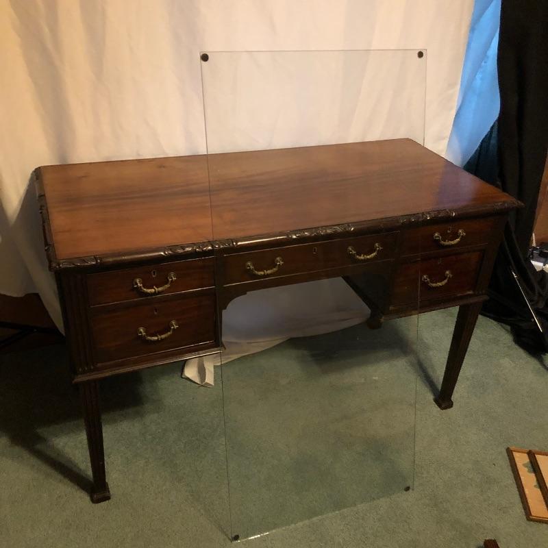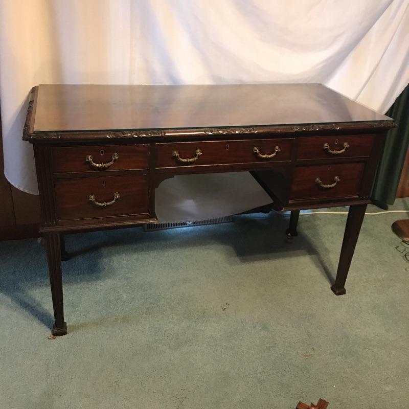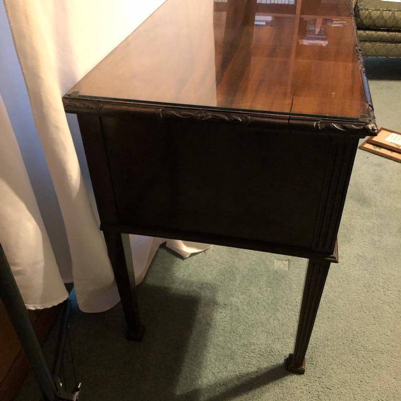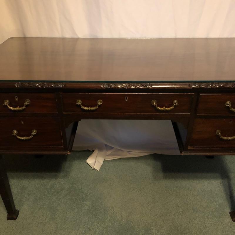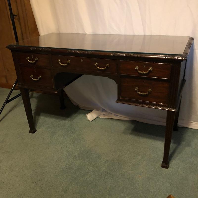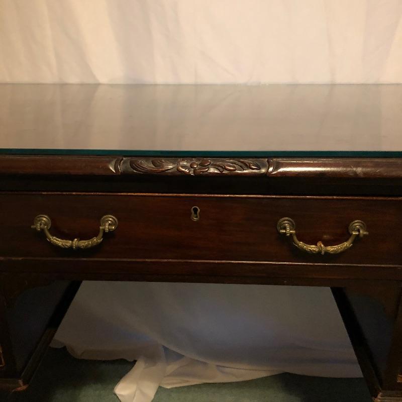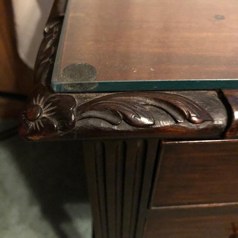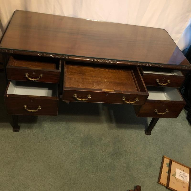 This antique gem with its exquisite details should not be missed! It appears to be mahogany but of course there is no guarantee on that. It has gorgeous floral inspired carvings all all along the edge of the top. The five drawers all have brass handles and English made brass locks; no keys with this piece. It has a glass top protector which has done its job, however the top has a split on the left side that is shown in the images.