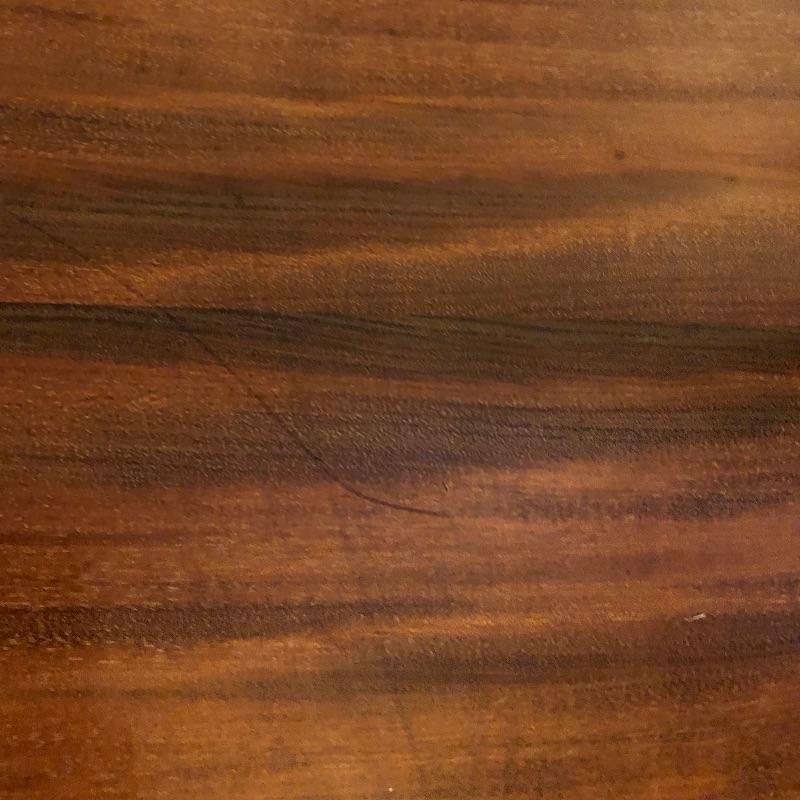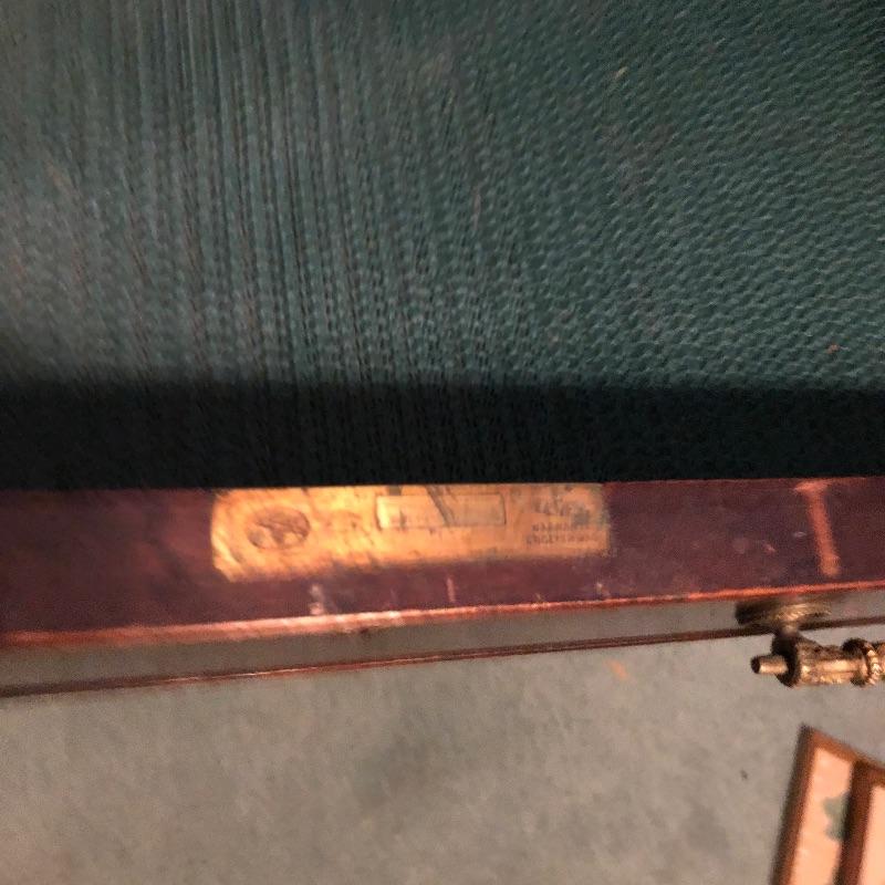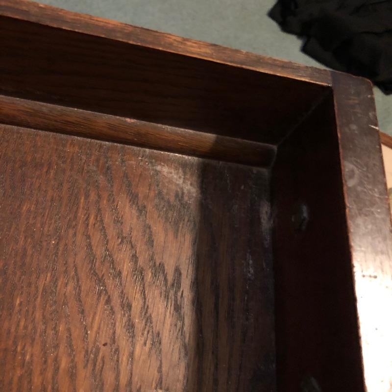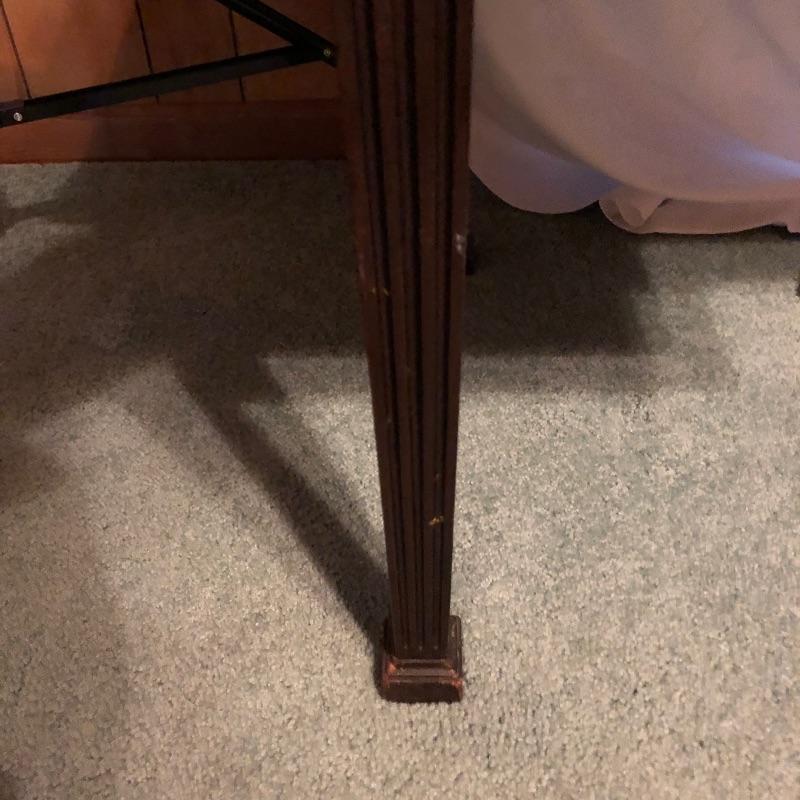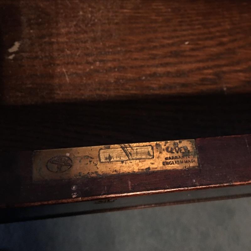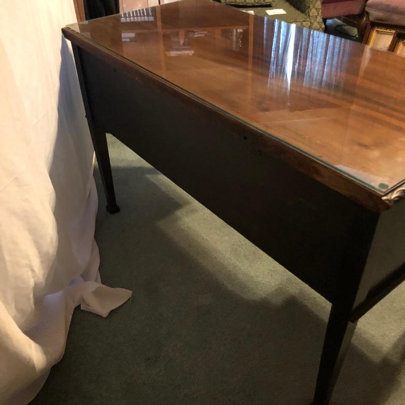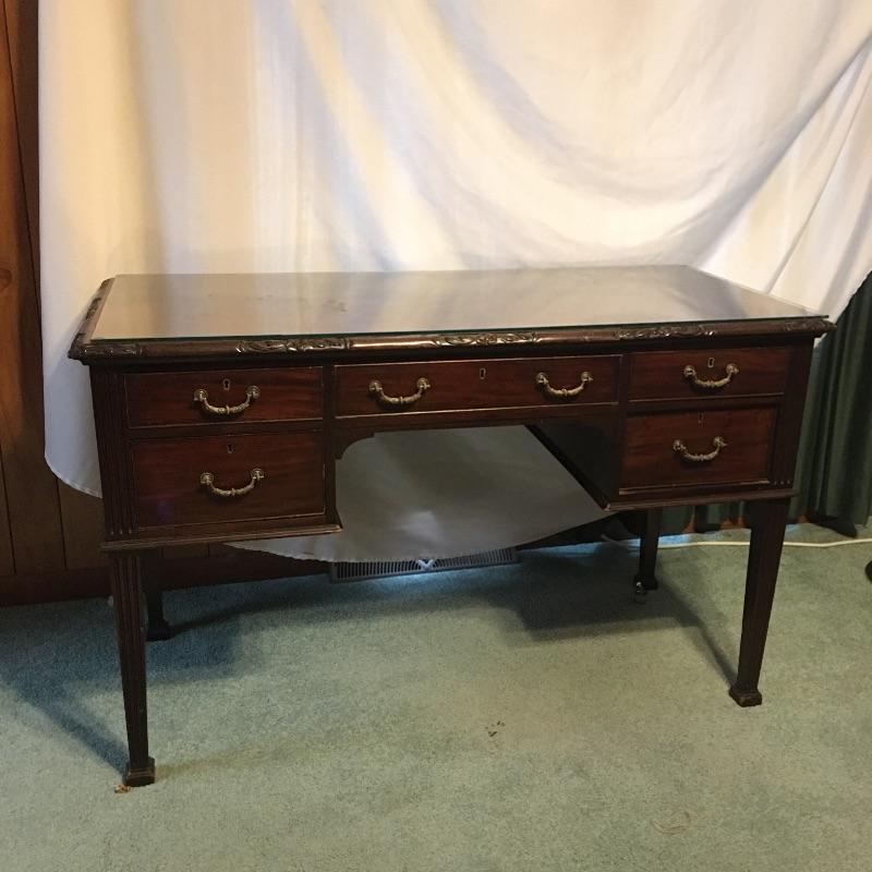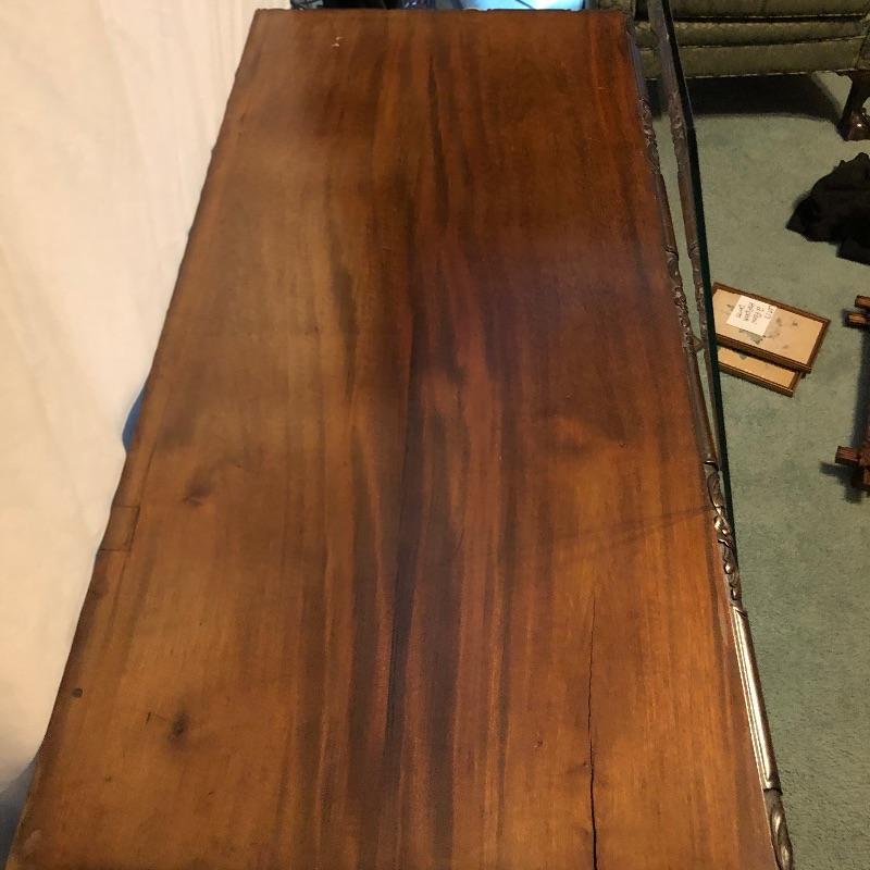 This antique gem with its exquisite details should not be missed! It appears to be mahogany but of course there is no guarantee on that. It has gorgeous floral inspired carvings all all along the edge of the top. The five drawers all have brass handles and English made brass locks; no keys with this piece. It has a glass top protector which has done its job, however the top has a split on the left side that is shown in the images.