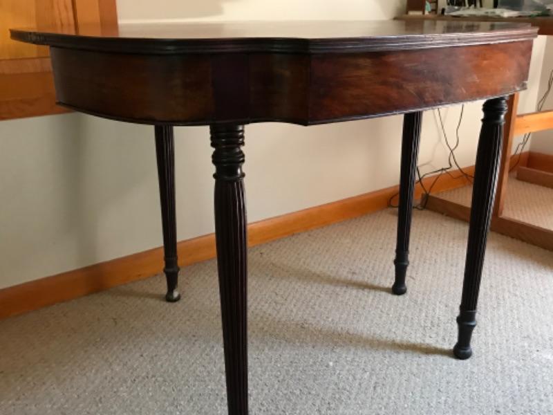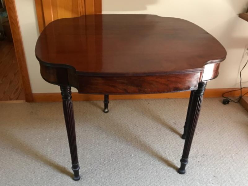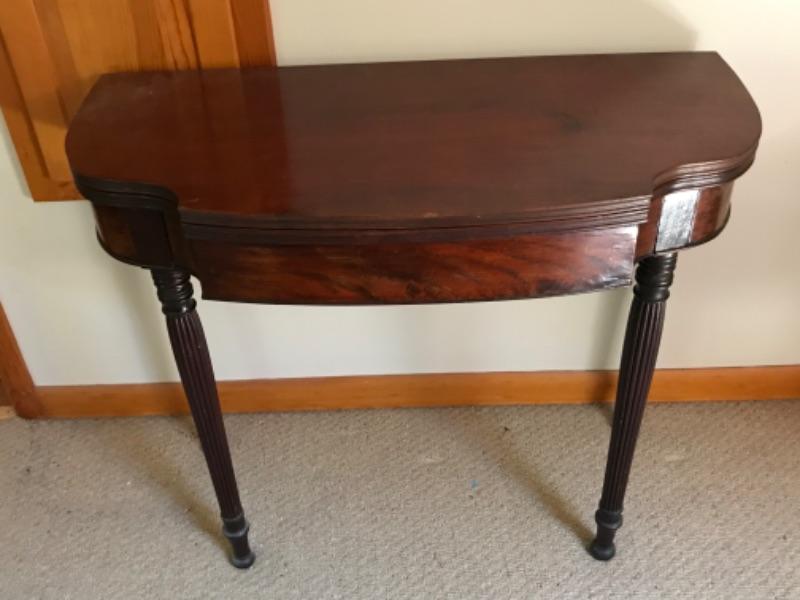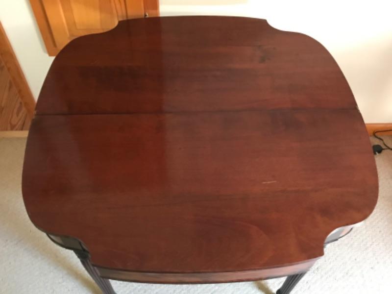 Beautiful antique mahogany flip top table. Excellent condition, no scratches or cracks. Brass hinges. Measures 2’5-1/2” high 3’ wide and 2’11-1/2” long (open) and 1’5-3/4” long (closed)
