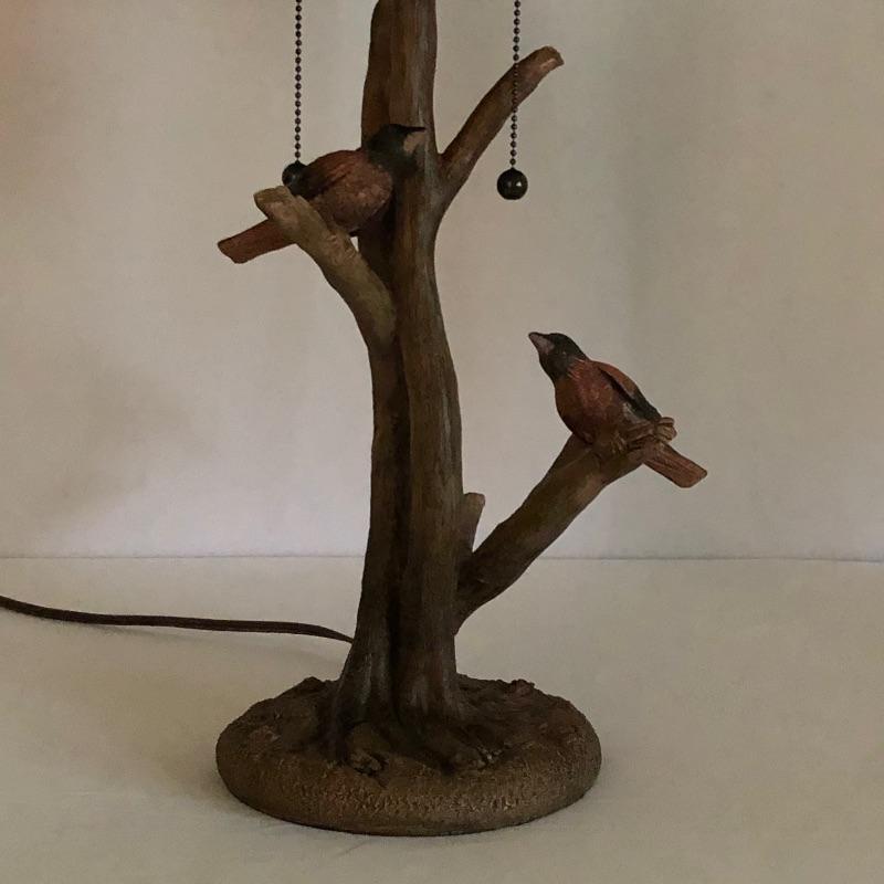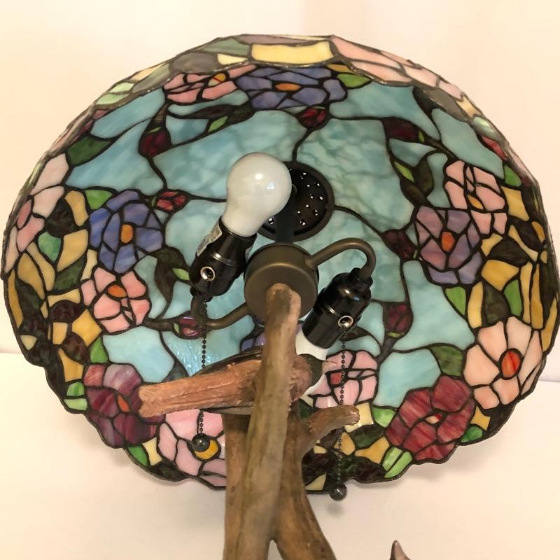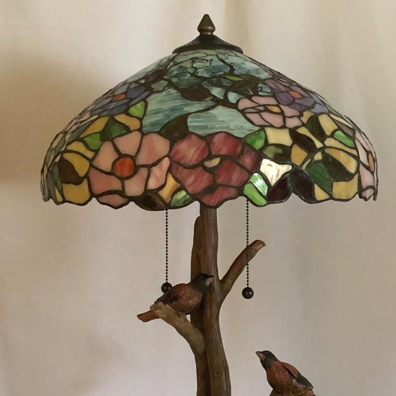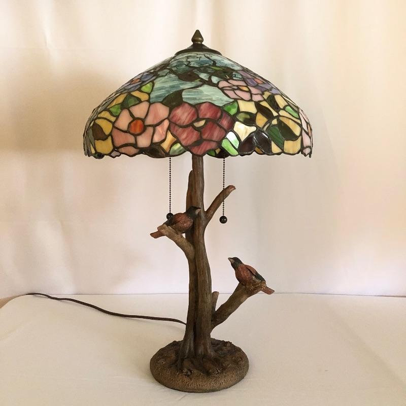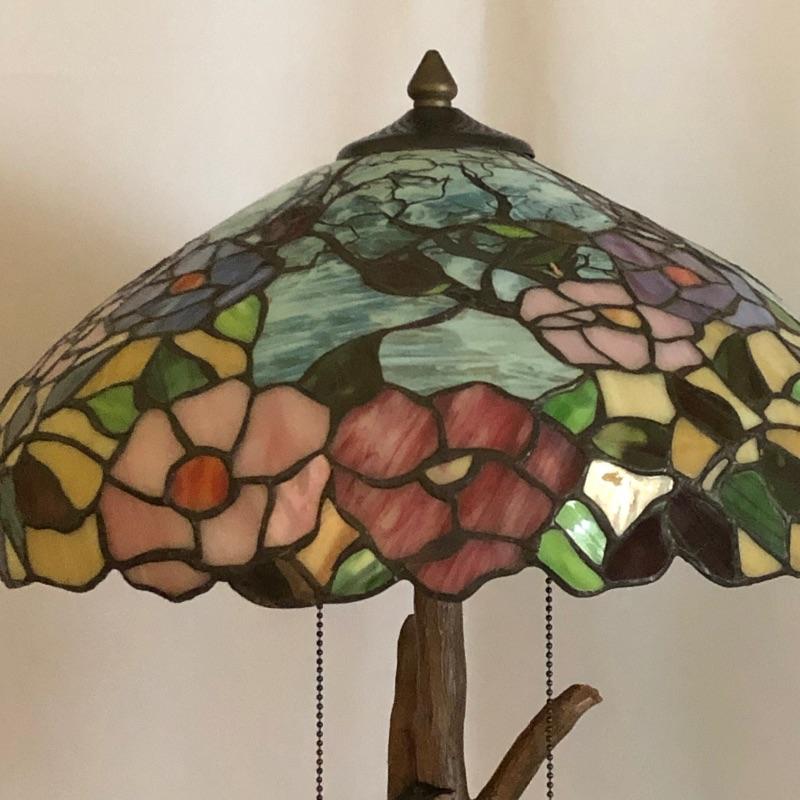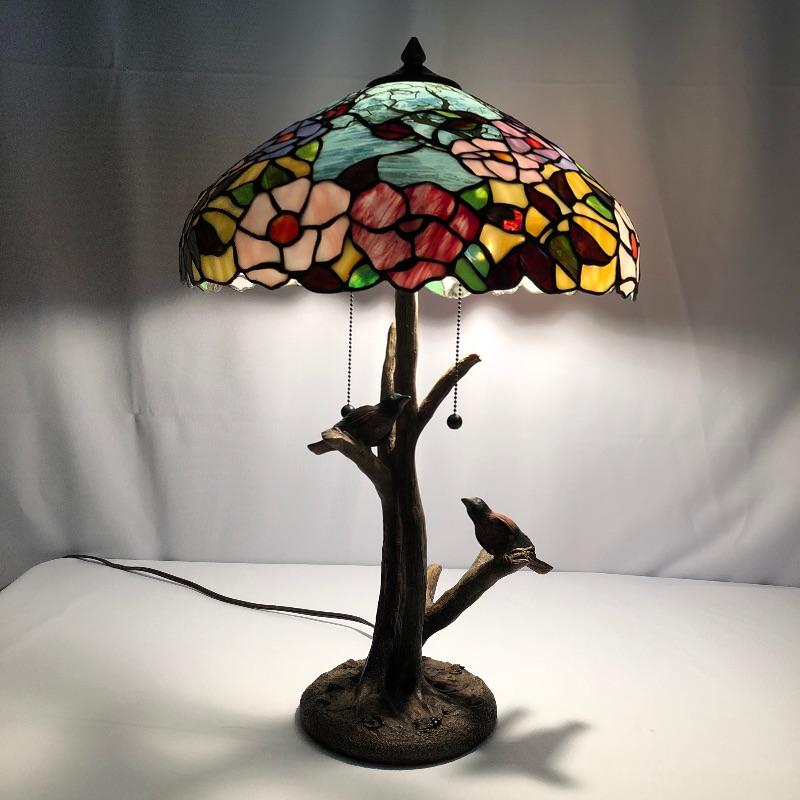 This truly stunning Tiffany style lamp is precious with its stand being a unique tree design complete with two birds perched on its branches. The simply gorgeous floral inspired shade is rich in colors and detail that looks amazing when unlit and even more so when turned on.