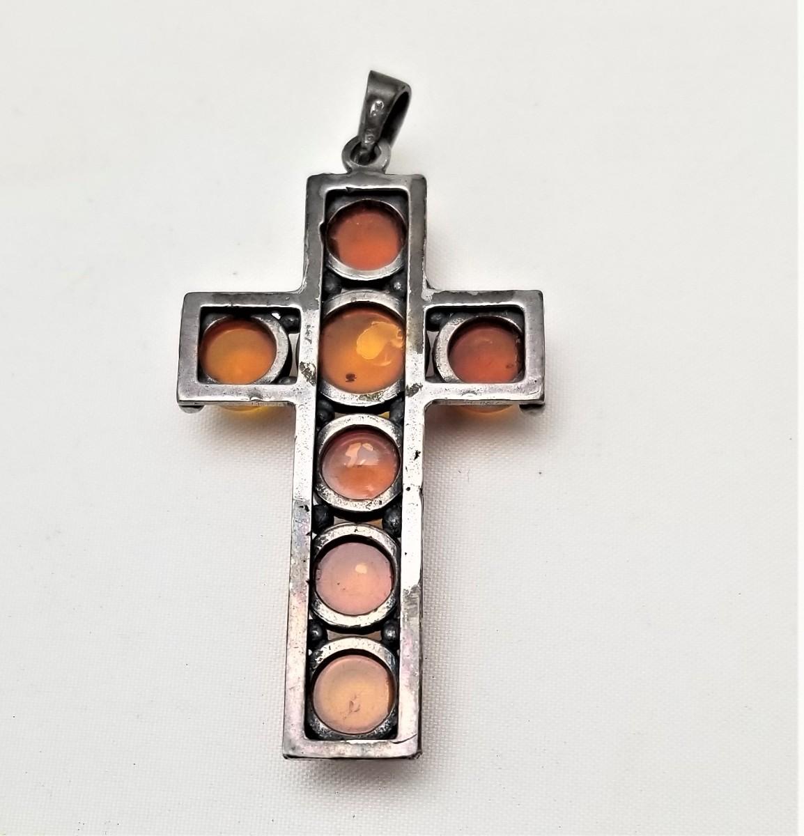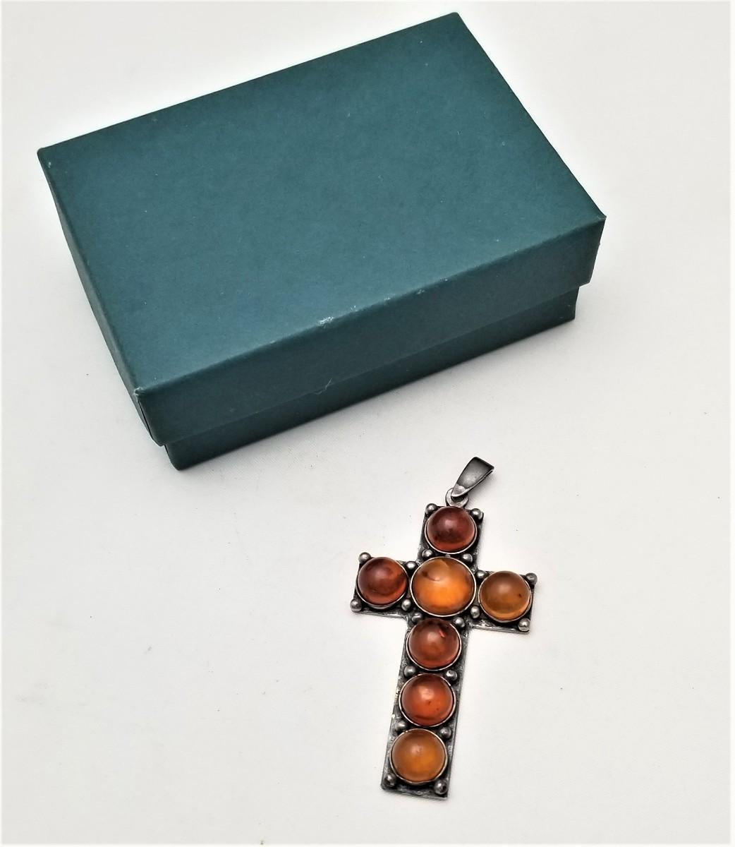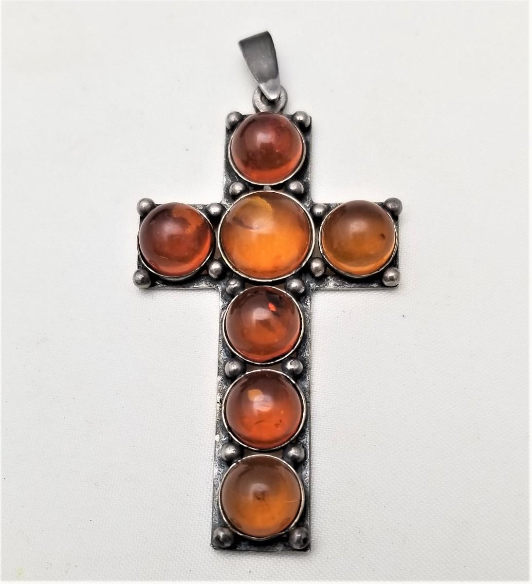 Nice cross set with 7 cabochon amber pieces - all done in Sterling Silver (marked). Measures about 1.75" long. No chain.