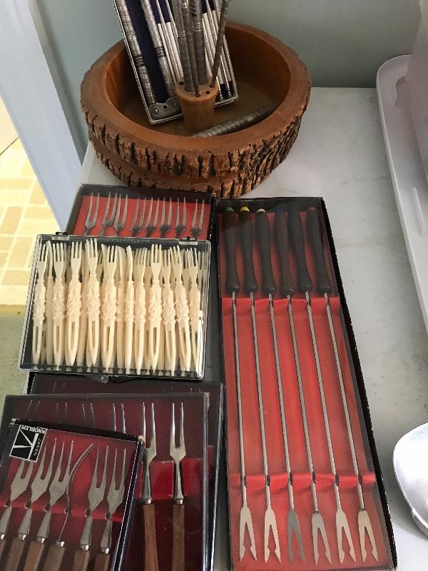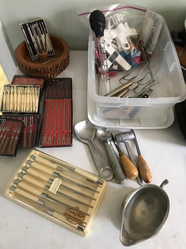 Large lot of Kitchen supplies with fondue forks, Carvel hall knives, Oyster knives, nut cracking set