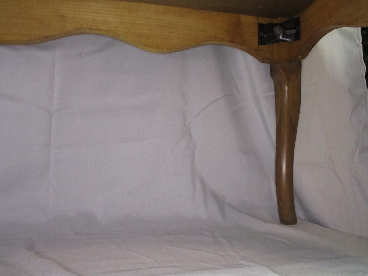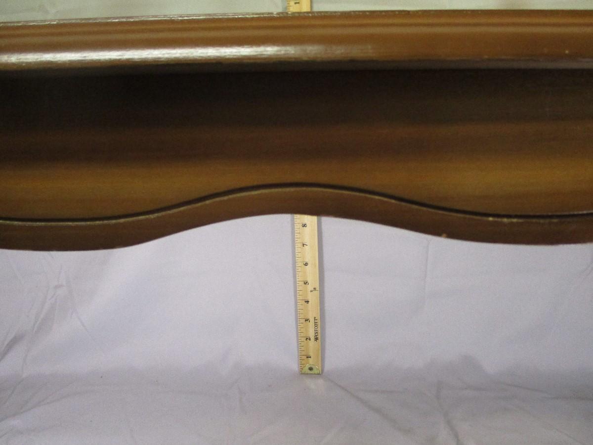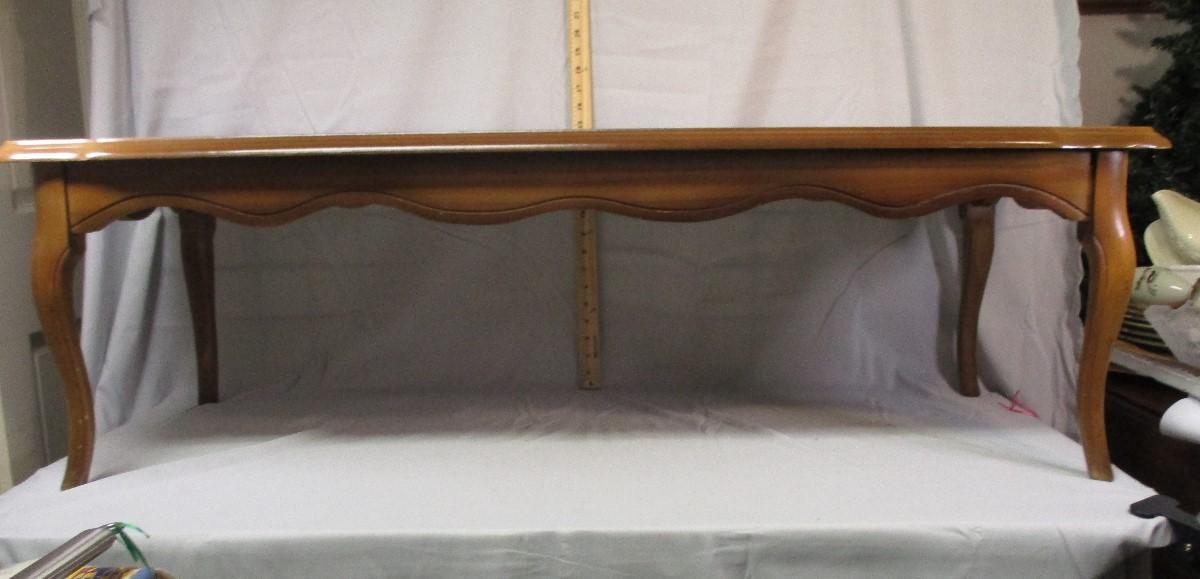 This coffee table is in nice condition. It measures approximately 42" long and about 14.5" tall.