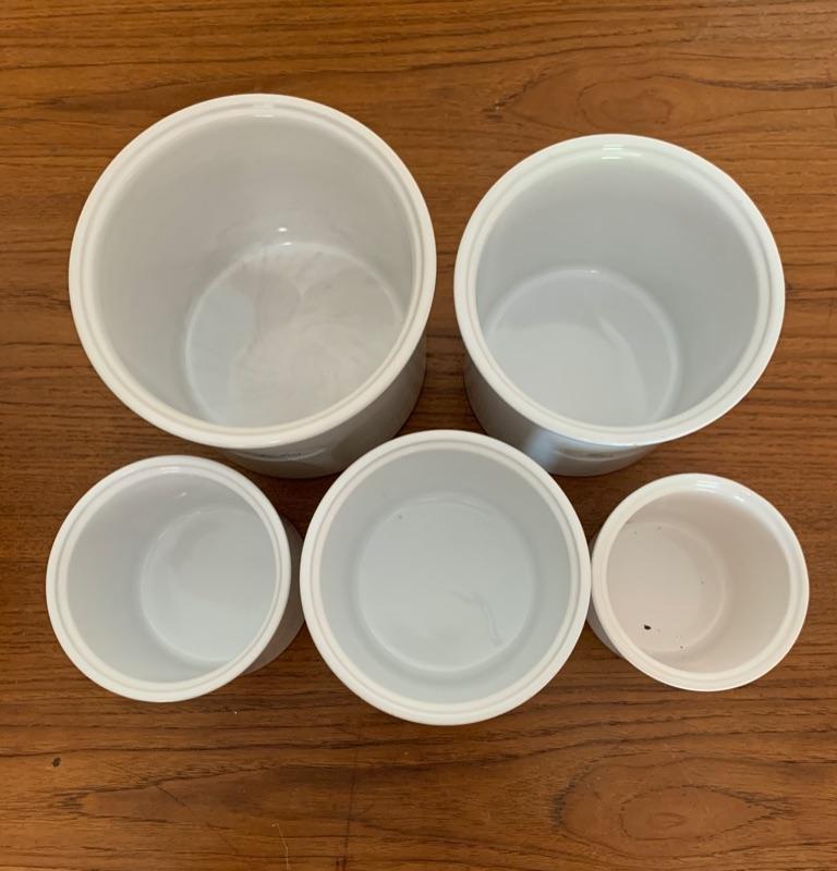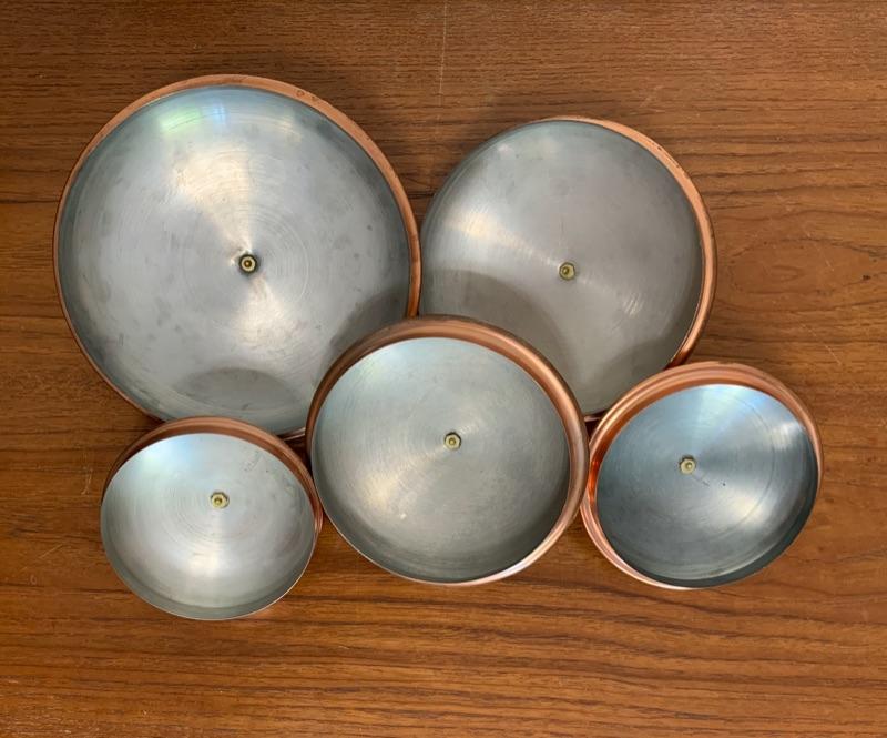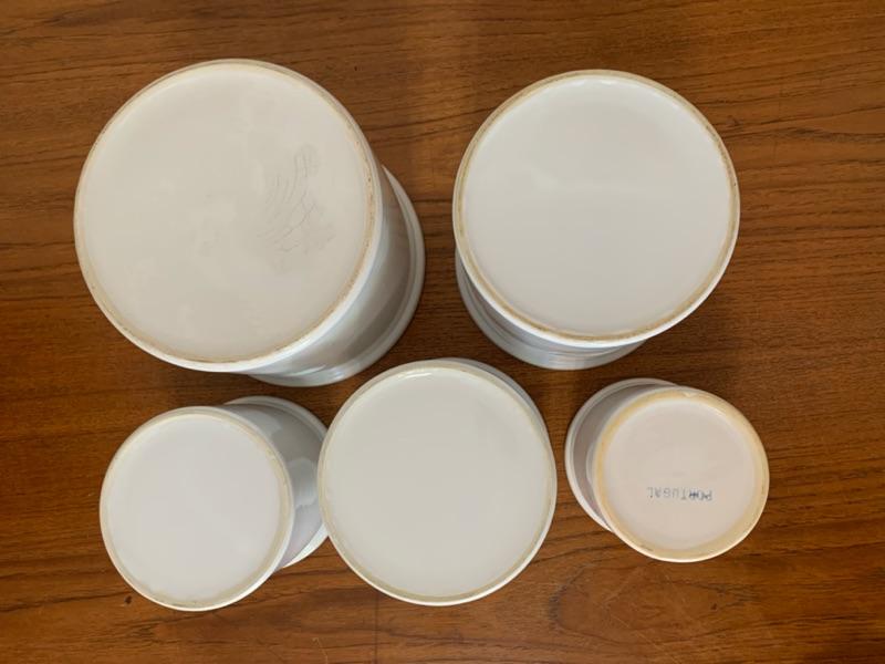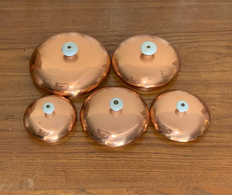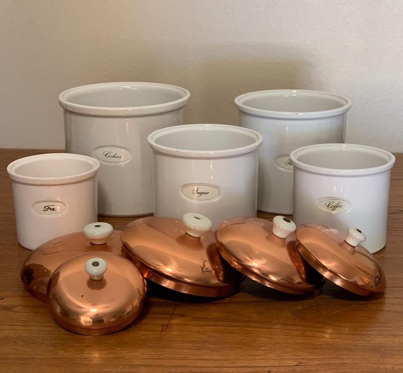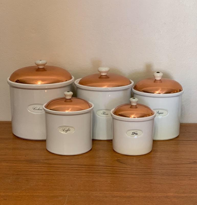 Overall excellent condition with typical wear for age. No chips, cracks or repairs. Largest canister shows some crazing. Smallest canister has utensil marks on inside and is marked “Portugal” on bottom. Copper lids with ceramic knobs in great condition with no dents and typical patina. Includes Cookies, Flour, Sugar, Coffee and Tea. Smallest measures 5 1/2” tall (w/ lid) x 4 3/4” diameter and largest measures 9” tall (w/ lid) x 7 7/8” diameter. Total 10 pcs (5 canisters, 5 lids).