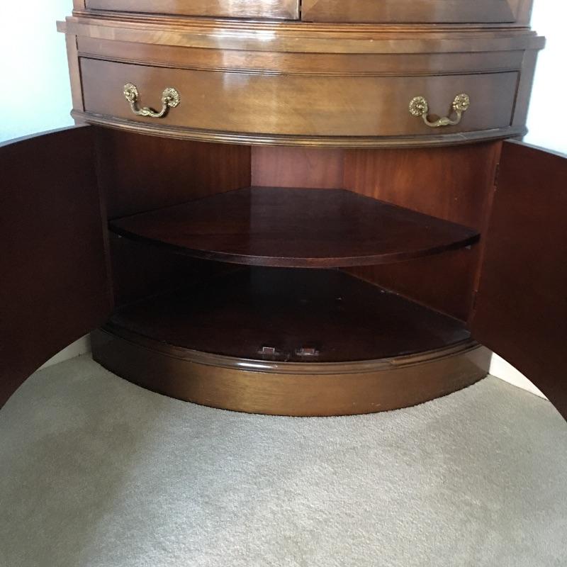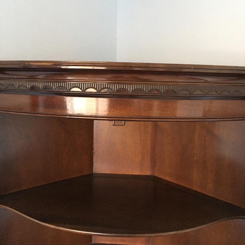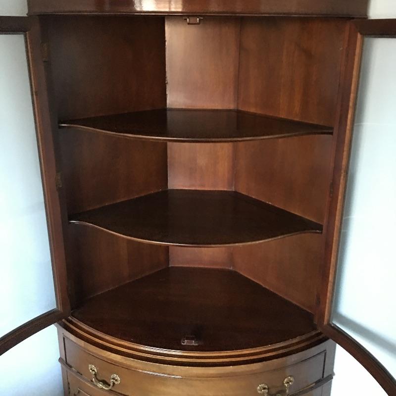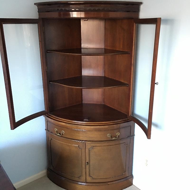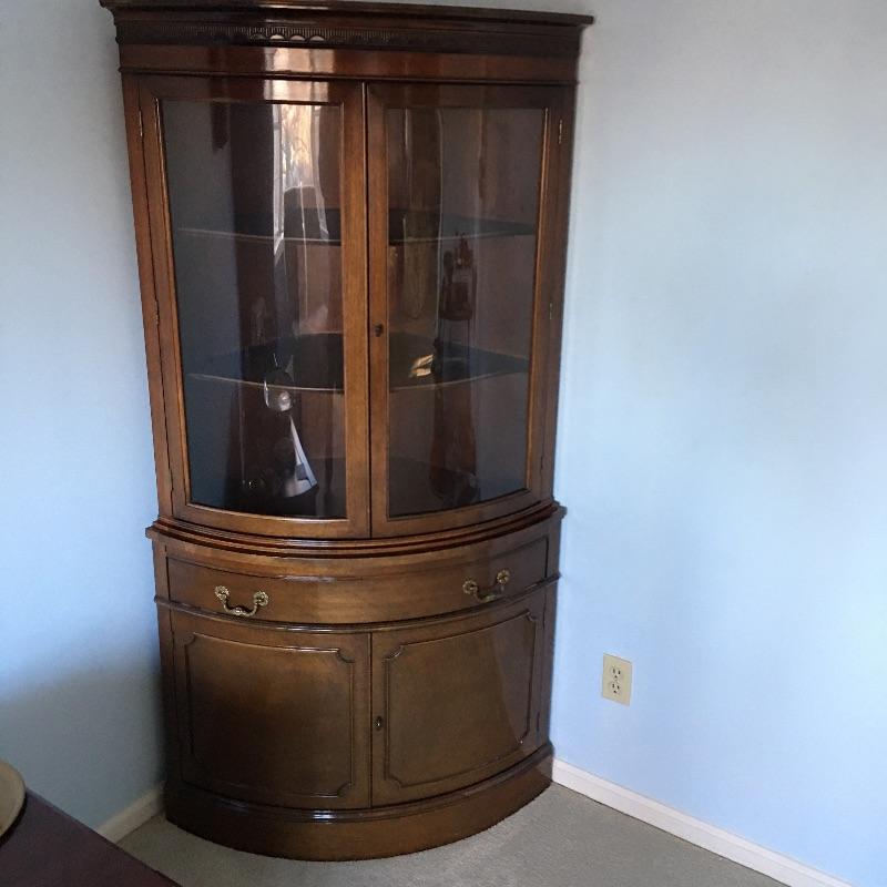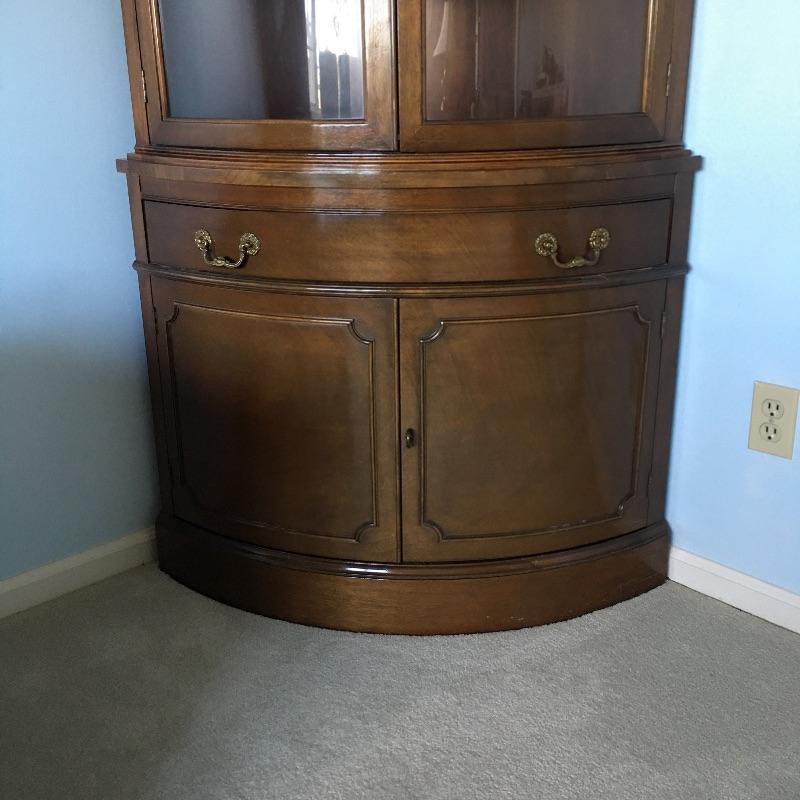 Corner cabinet made by Hickory Manufacturing company. Beautiful corner cabinet with dovetailed drawer, three shelves on top with curved glass on doors and two shelves below. A great way to display you collectibles while using a small amount of space. Not lighted. Does not come apart but it’s a small easy size to move. Cabinet measures 37” wide x 21” deep x 69” tall. Piece has one small mark on top, see pictures.