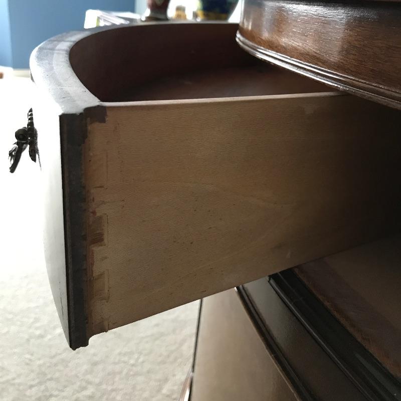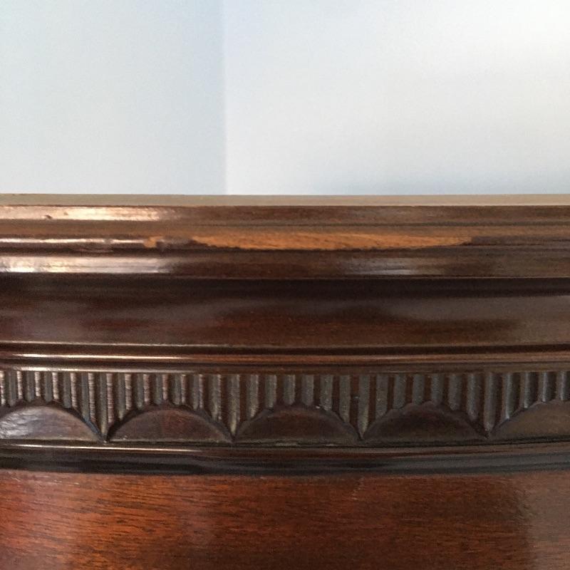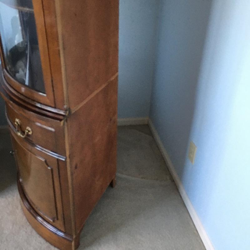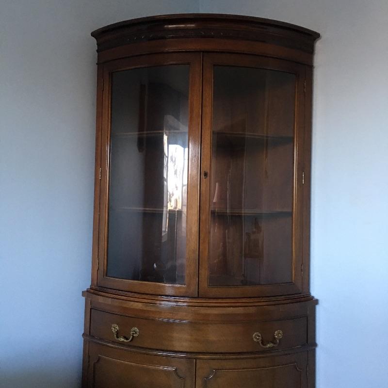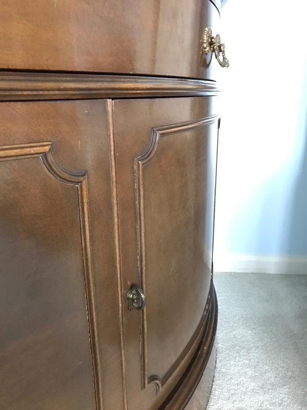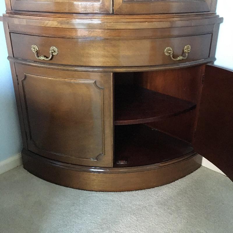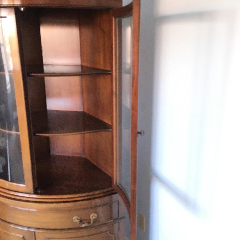 Corner cabinet made by Hickory Manufacturing company. Beautiful corner cabinet with dovetailed drawer, three shelves on top with curved glass on doors and two shelves below. A great way to display you collectibles while using a small amount of space. Not lighted. Does not come apart but it’s a small easy size to move. Cabinet measures 37” wide x 21” deep x 69” tall. Piece has one small mark on top, see pictures.