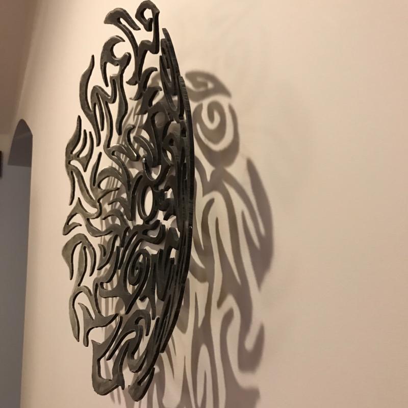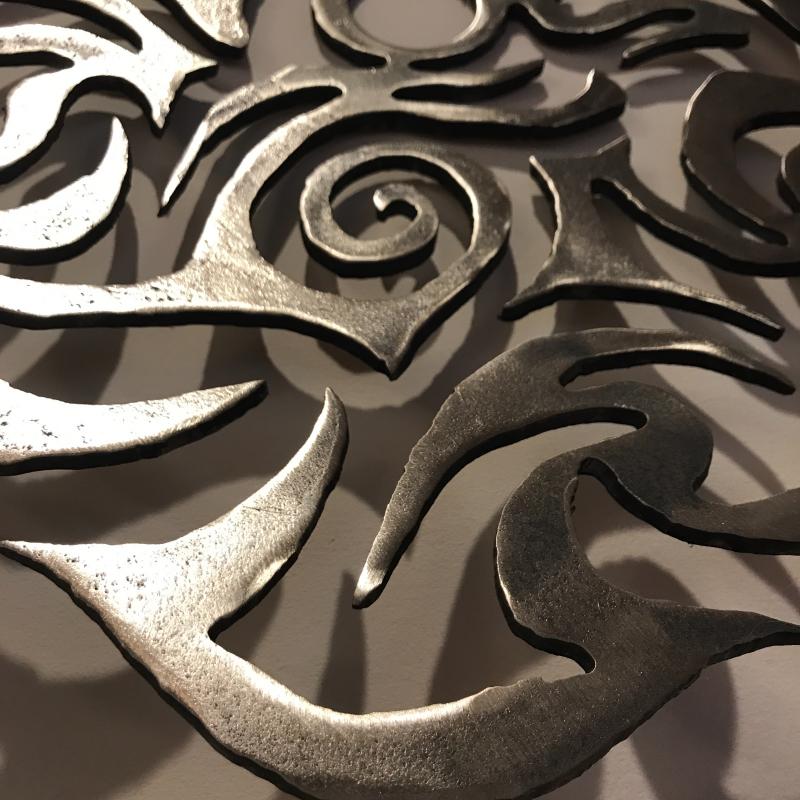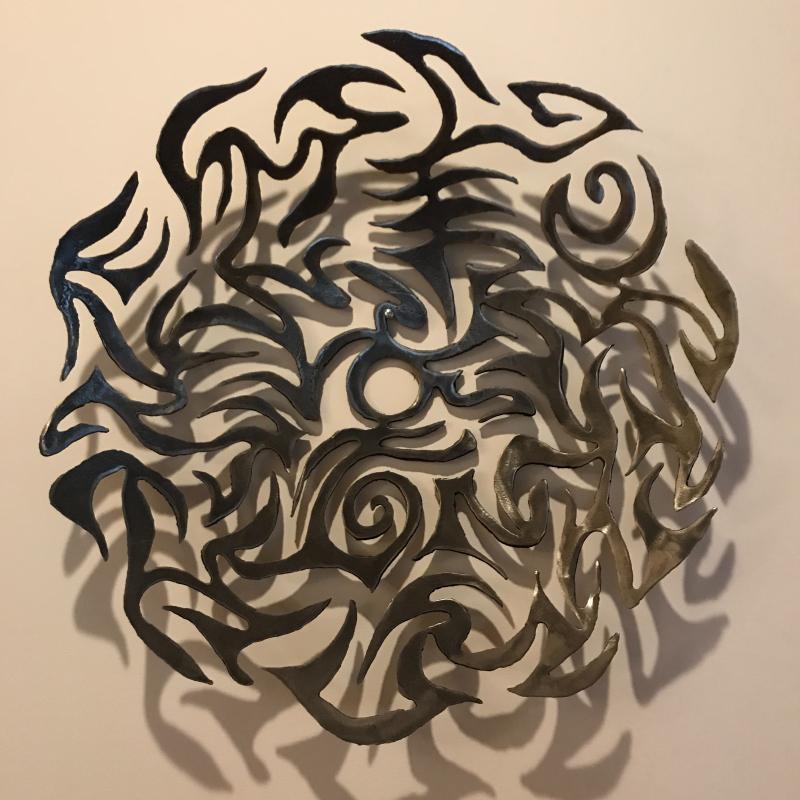 Hang this beautifully designed heavy metal piece on your wall or display on a table. Curved metal design. Measures 20” diameter. Shipping available or local pick up in Asheville, NC