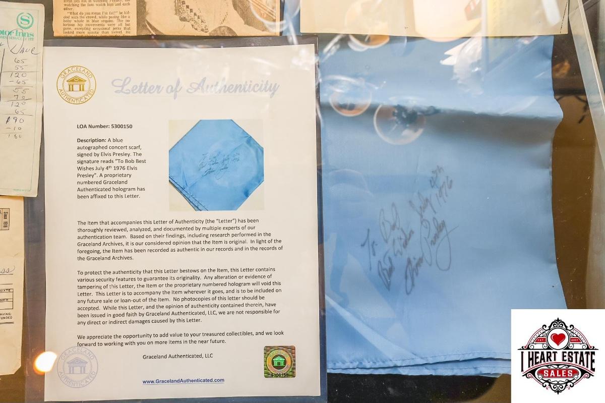 This extraordinary, concert-worn scarf was personally autographed and gifted by Elvis Presley to Bob Baugess, the lead officer of the Tulsa Police protection detail during Elvis’ July 4th, 1976 performance at the Mabee Center in Tulsa, Oklahoma.