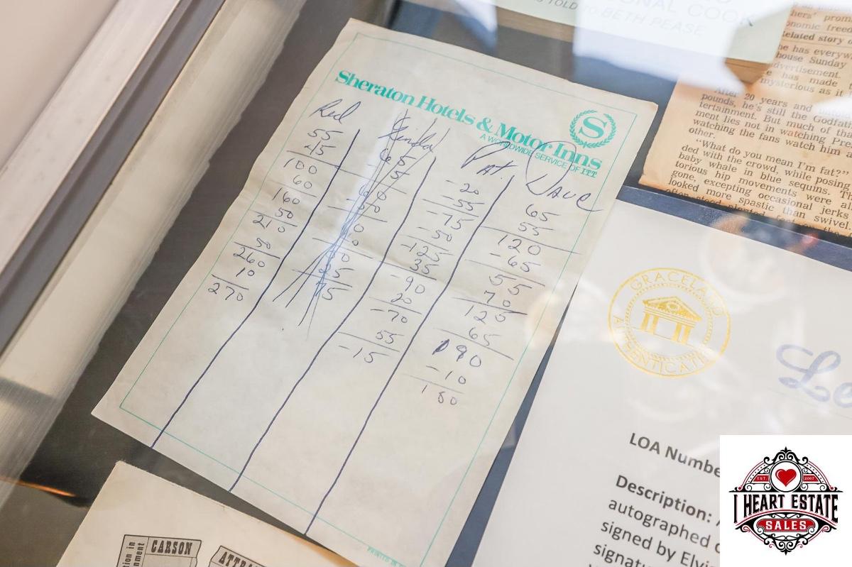 2    Backstage Canasta Score Sheet – Featuring scores from a game played during the show by Elvis’ girlfriend Linda Thompson, bodyguards Red West and Dave Hebler, Red’s wife, and Elvis’ personal secretary Pat Boyd-West.