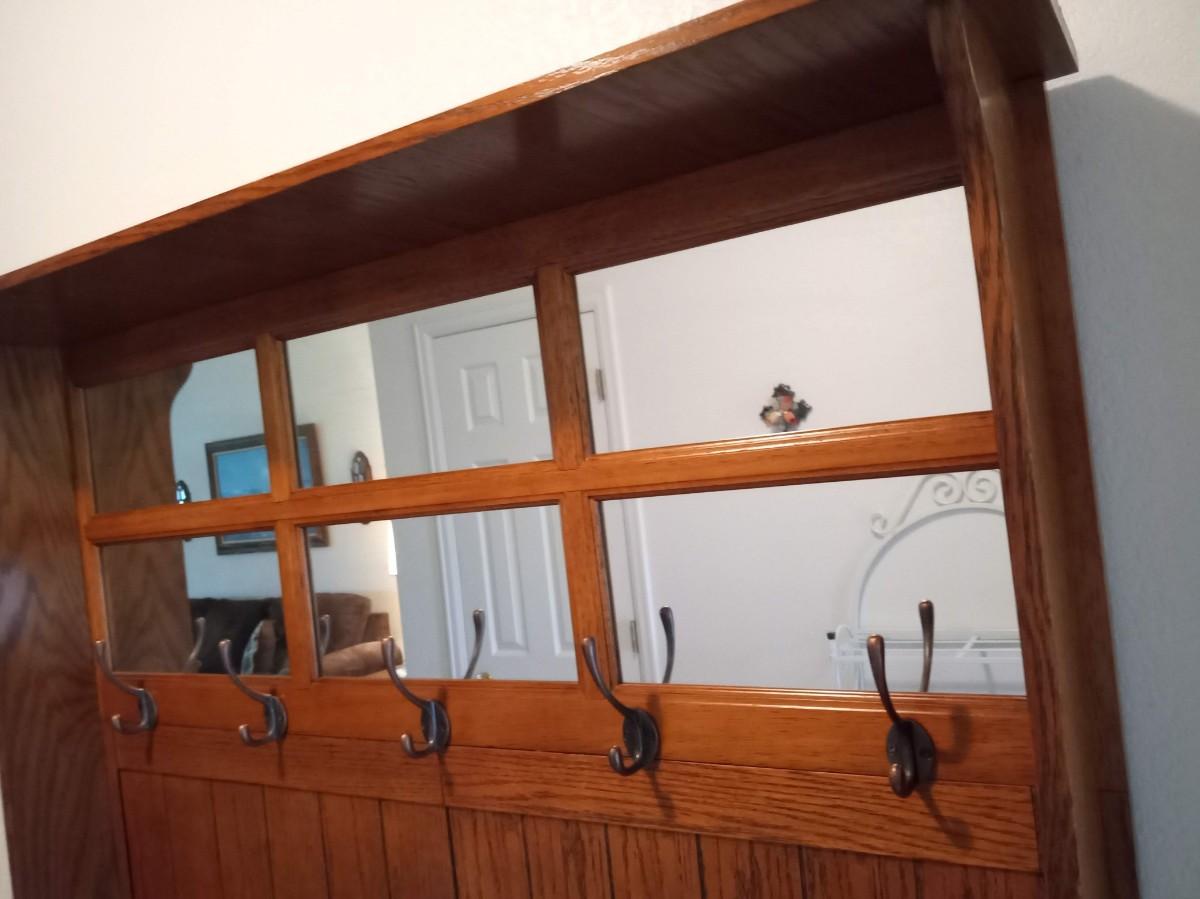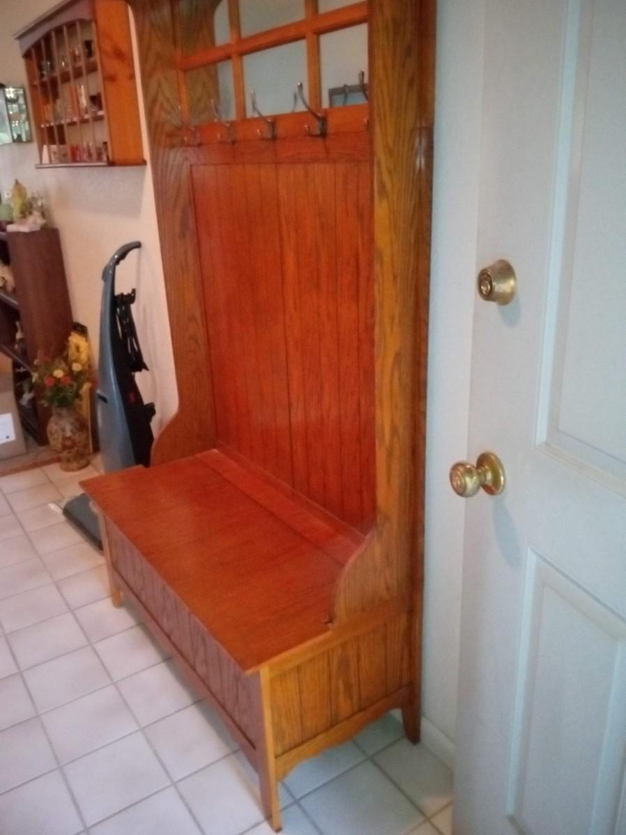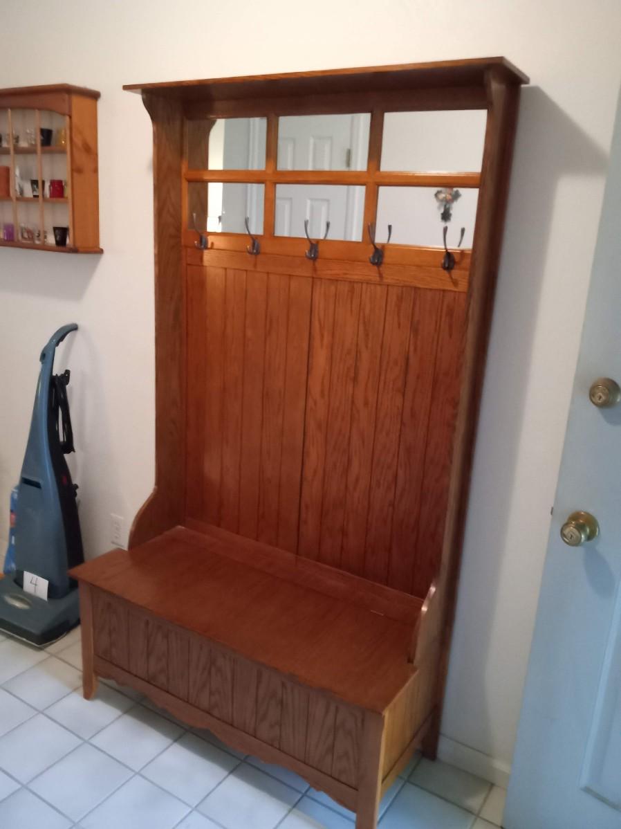 40" X 18" X 71" HANDSOME PIECE WITH PANELED MIRRORS ABOVE 5 COAT HOOKS. THE BENCH HAS A LIFT UP TOP FOR STORAGE