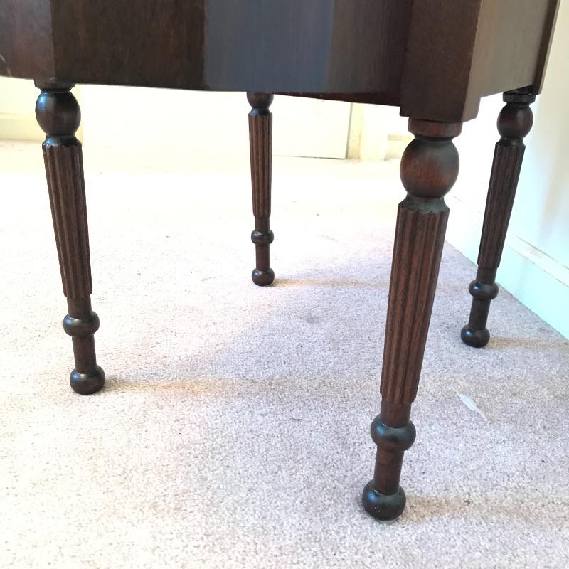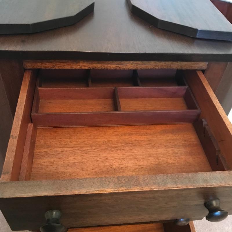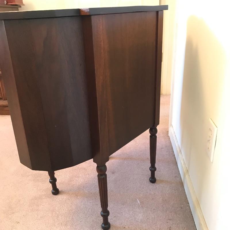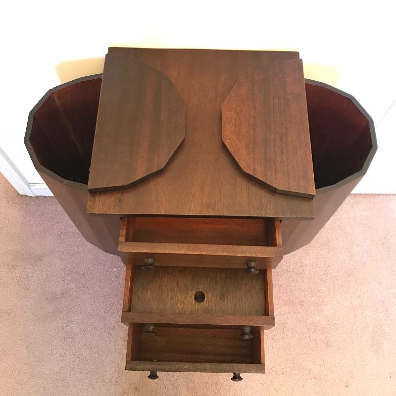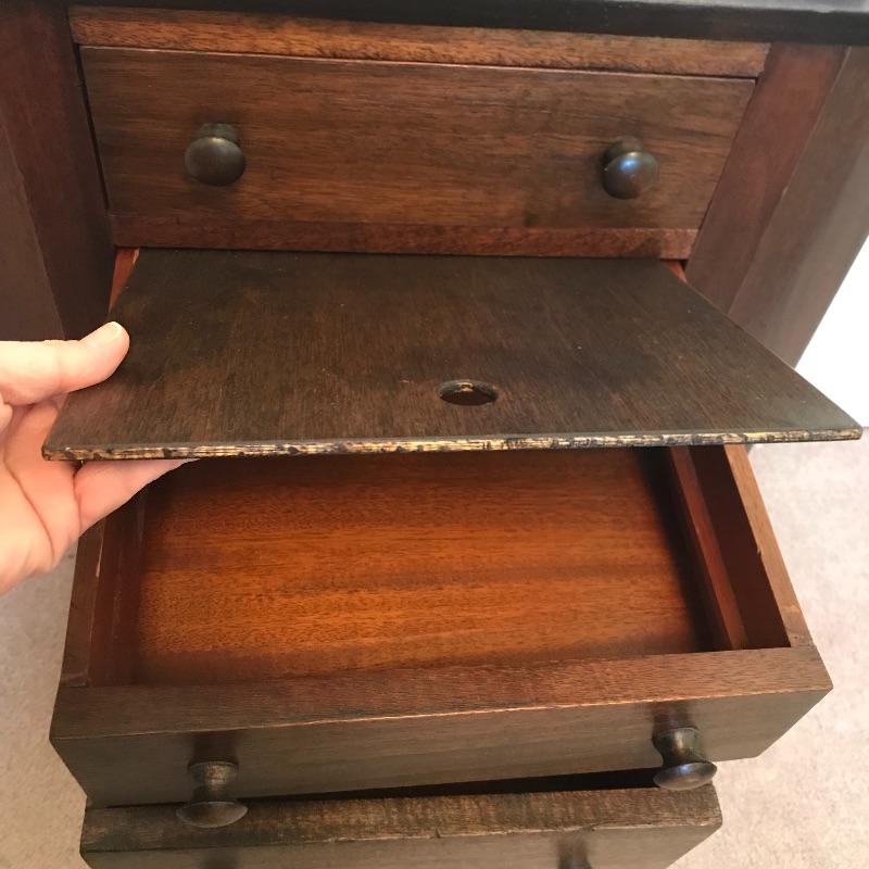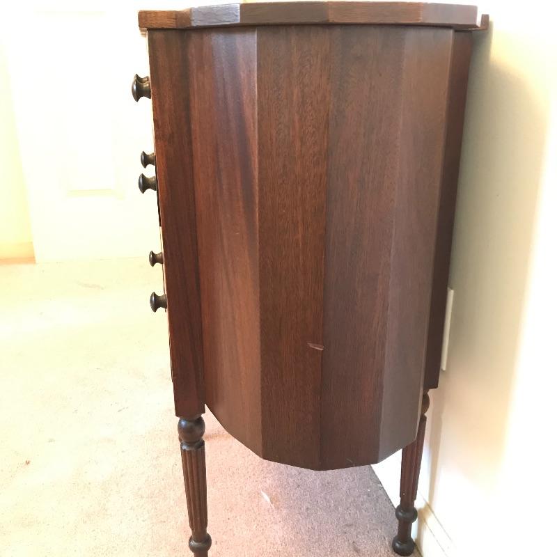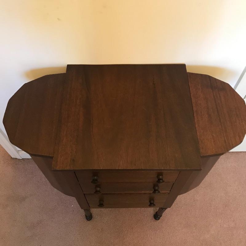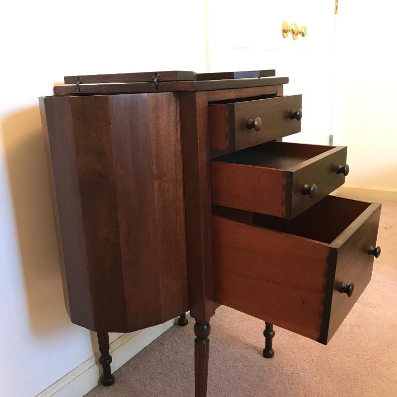 Old fashioned “Martha Washington” sewing cabinet in amazing condition. Three drawers with removable organizers glide smoothly. Two knitting drawers. The dovetail drawers have wooden knobs and there is very fine detail on each leg. There is a small one inch gash on the right side and some surface scratches on top, see photos. Cabinet measures approximately 27” x 14” x 28.75”. No shipping.
