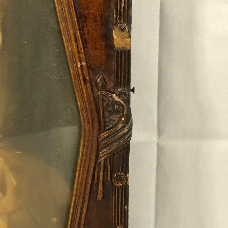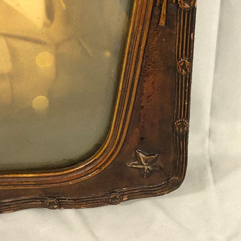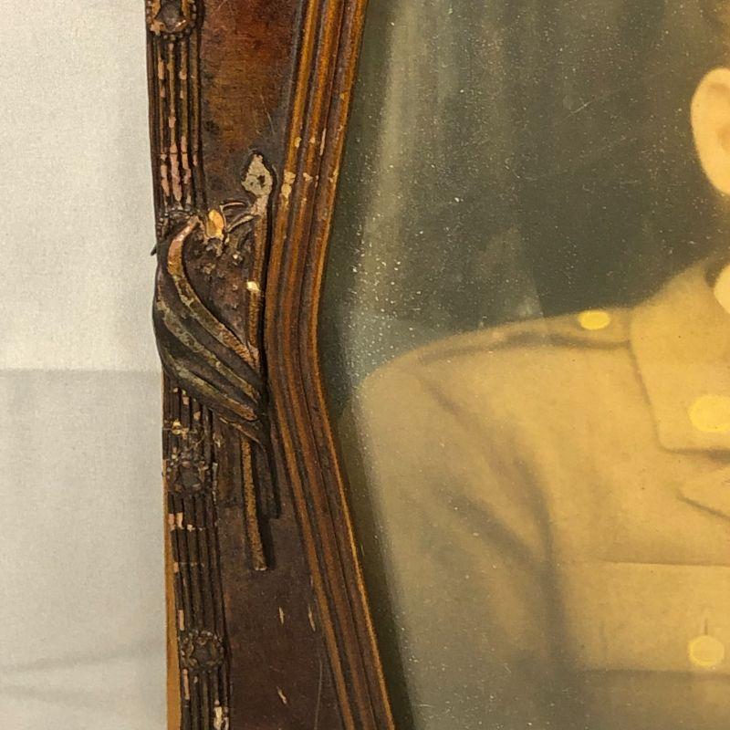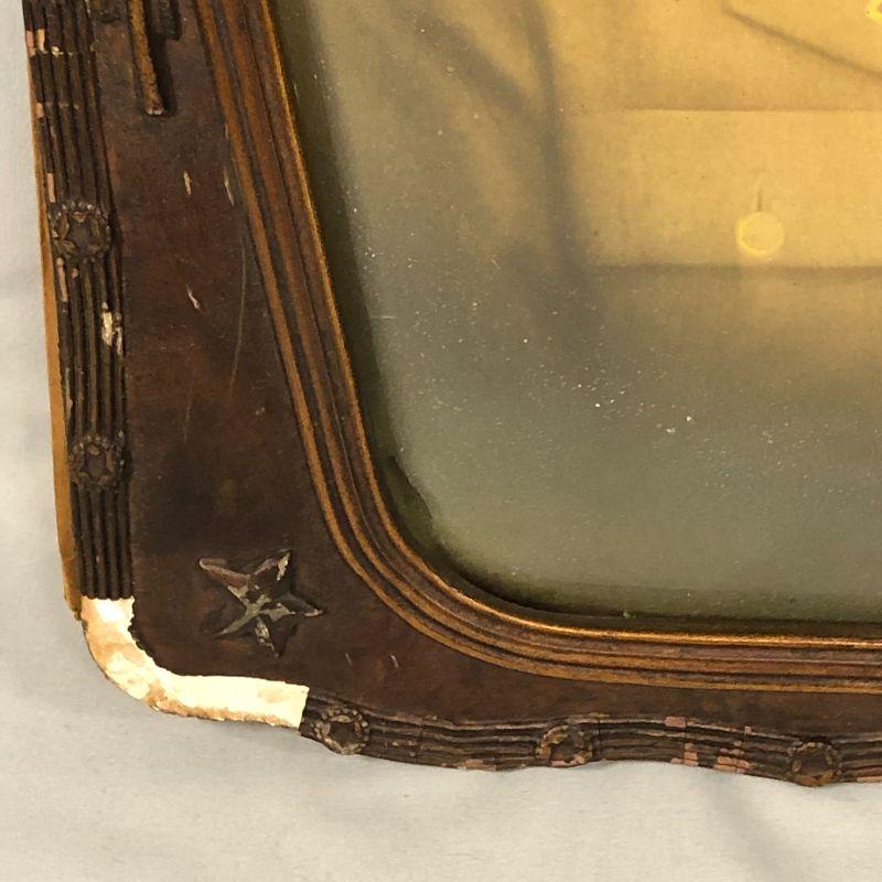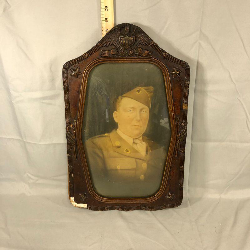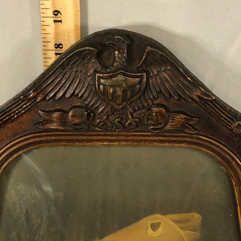 This is a beautiful wood based frame with a bubble/raised glass that has at the top an eagle with a shield holding a banner that says "USA". There is a flag at the middle on either side. There is a spot of damage on the bottom left corner. The frame measures about 19.25" x 12".