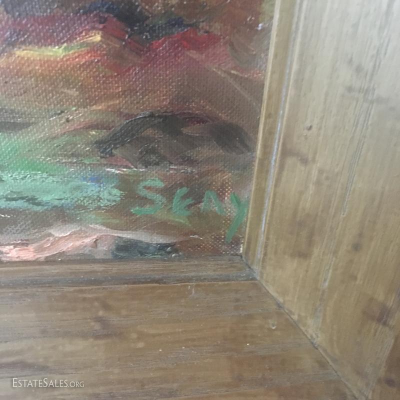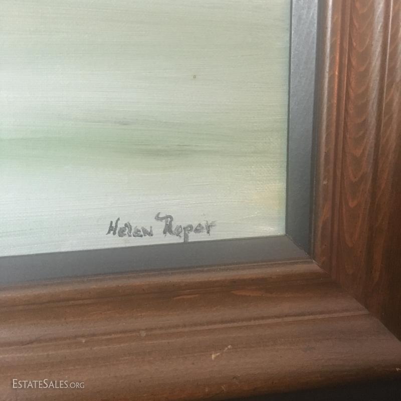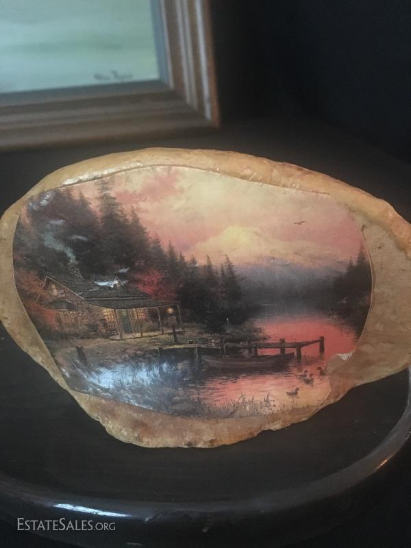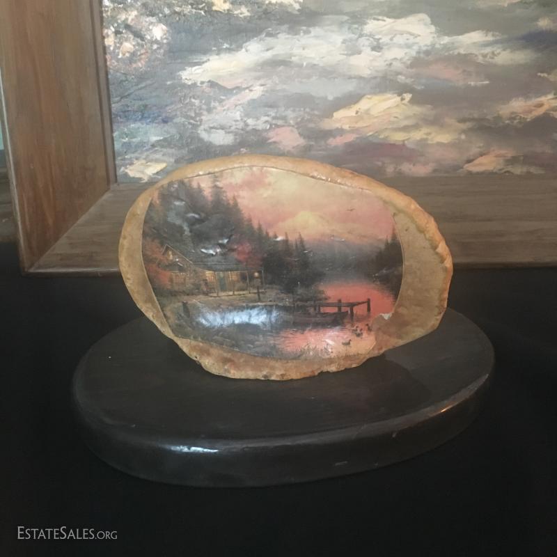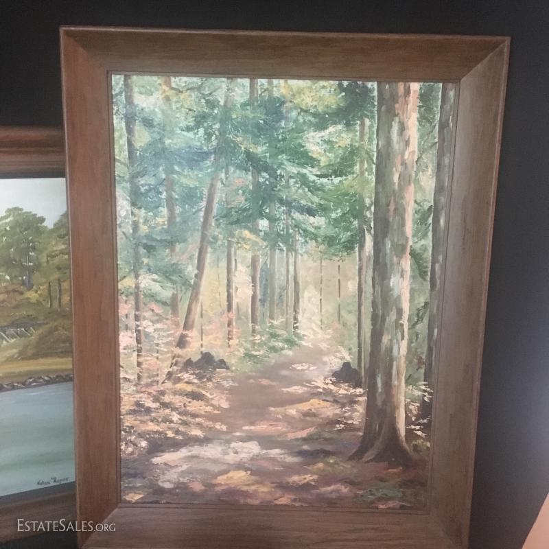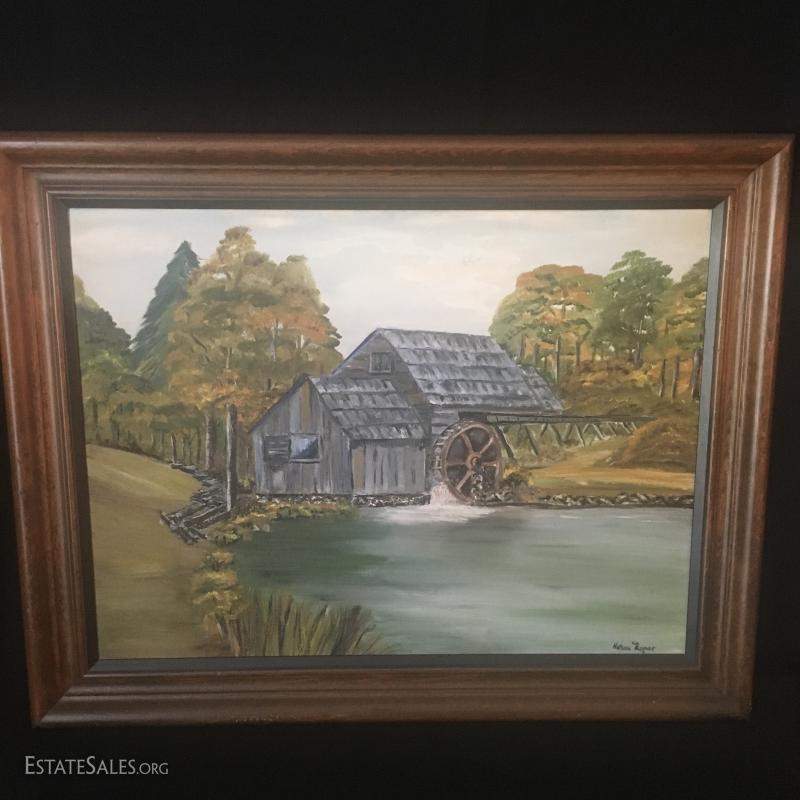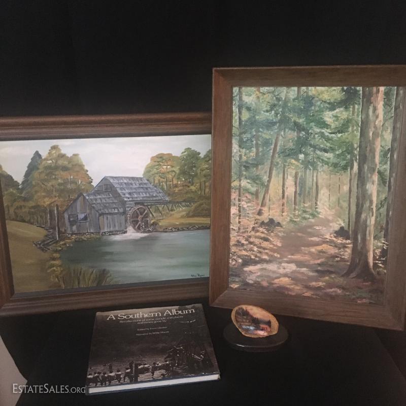 Two framed oil paintings, signed along with a local art book and wood art on stand. Watermill painting is by Helen Roper and measures 28.5" x 23". Woods painting is signed by Seay and measures 28" x 21.5". Small wood art piece measures 7" x 4.5" on stand. This lot is available for shipping or local pick up in Asheville, NC.