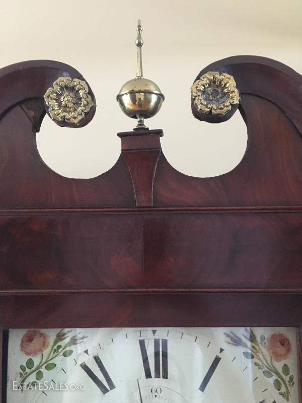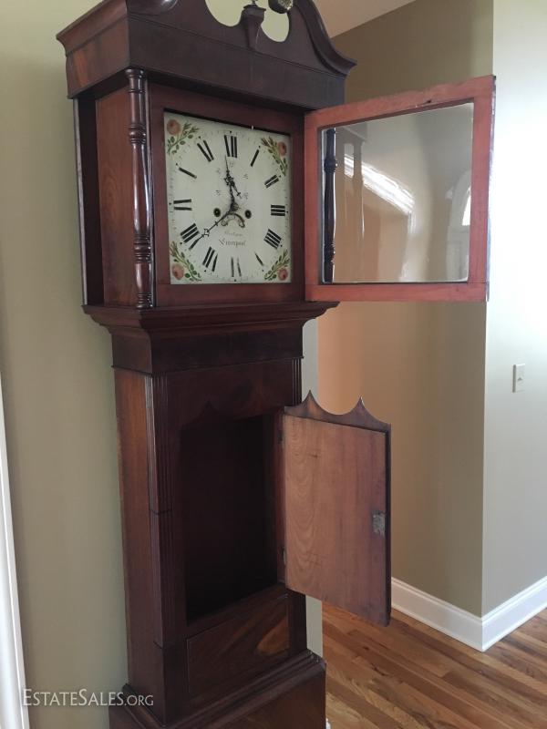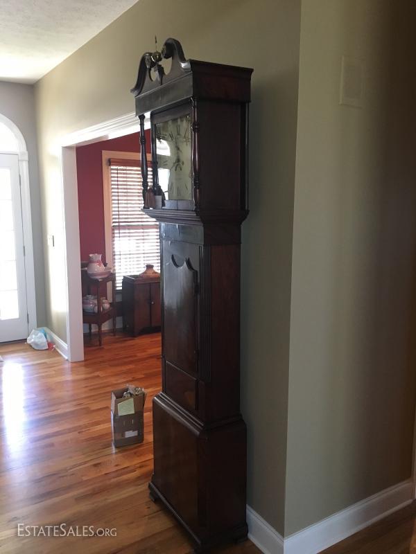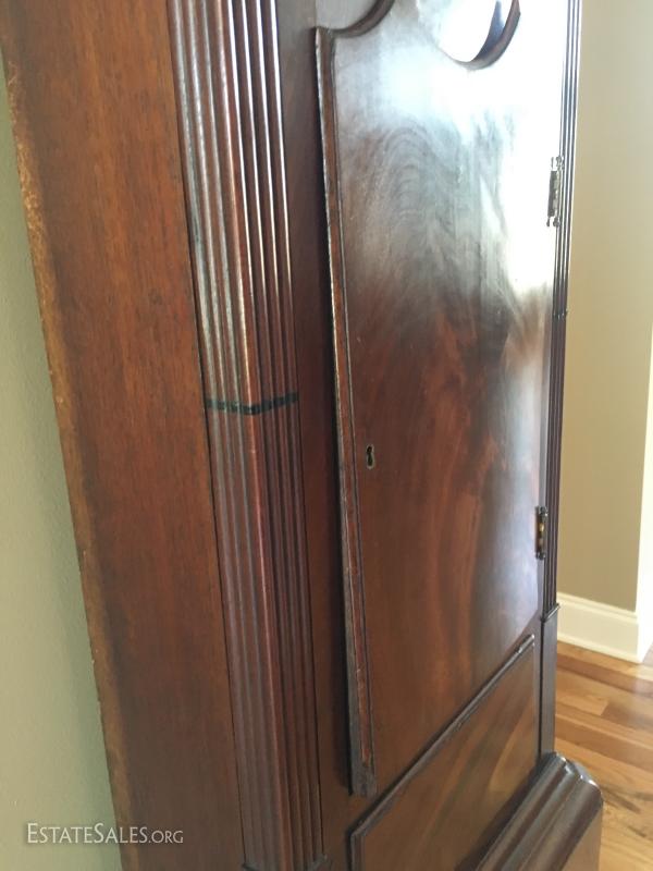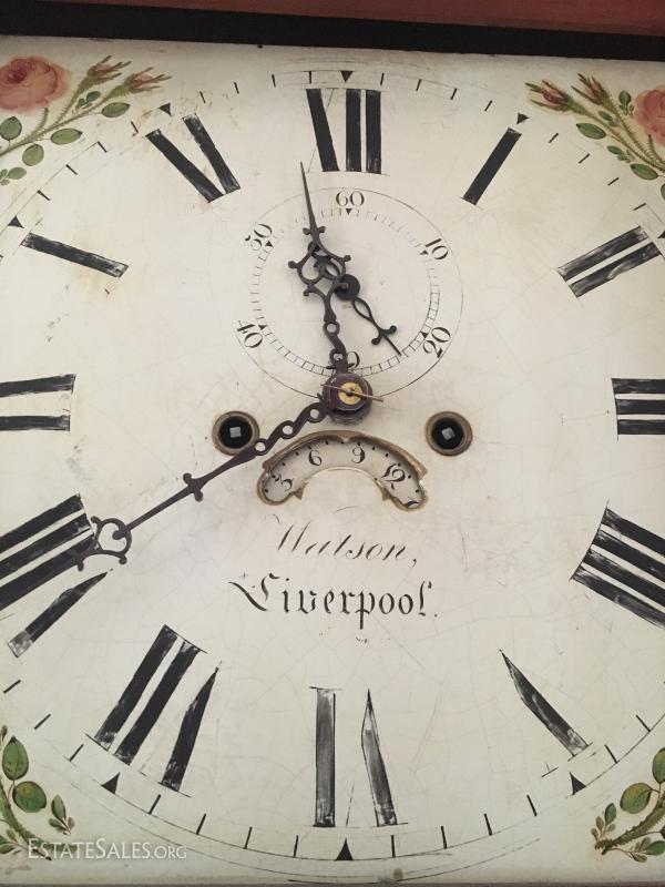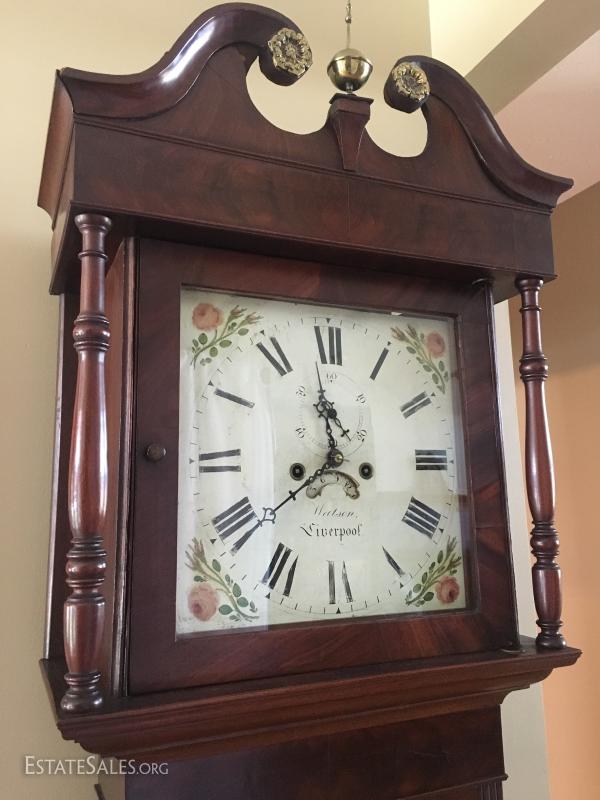English Mahogany wood Watson Grandfather clock made in Liverpool c. approx 1825. Pendulum and weights are already removed for transport. Will need adjustments once set up in new resting place. Measures 34"lx11.5"wx87"h. Item available for local pick up only in Hendersonville, NC