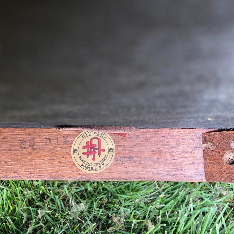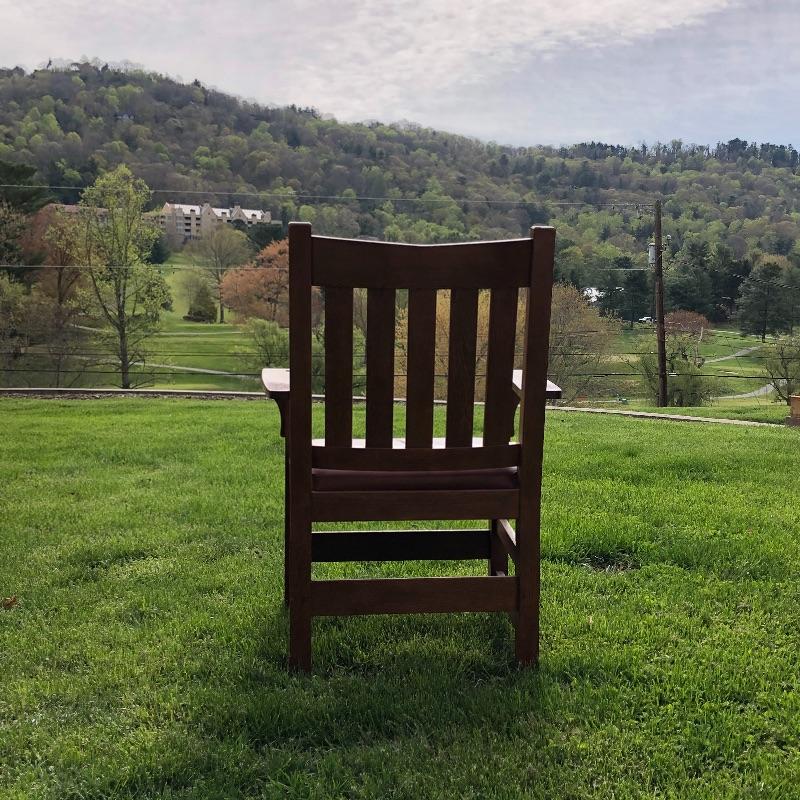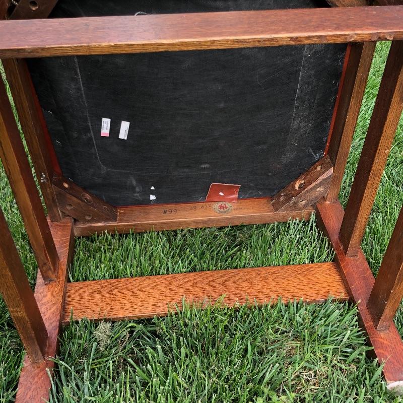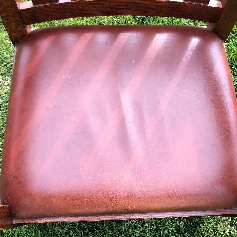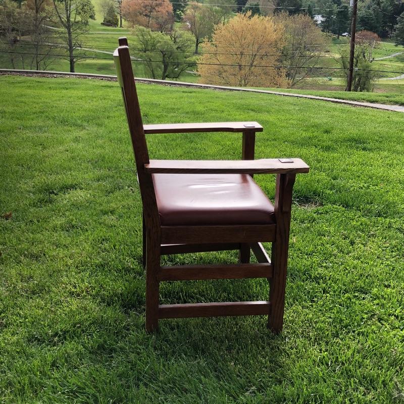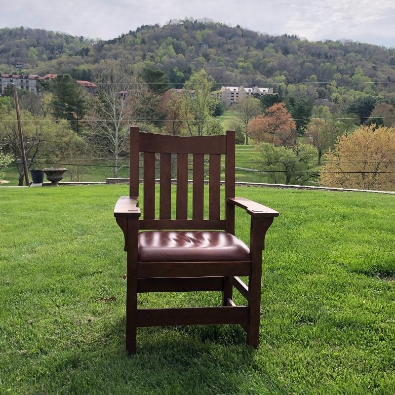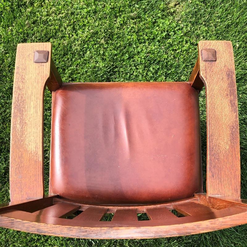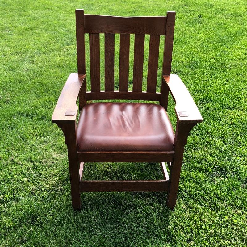 You will love the look of this classic Stickley mission style chair that was originally from the Grove Park Inn, as per the owner. A great chair to sit back and enjoy a nice book. Chair is in good shape with some scratches and nicks on the wood and the leather padded seat. Chair measures 22” x 27” x 39” with a seat height of 20”.
