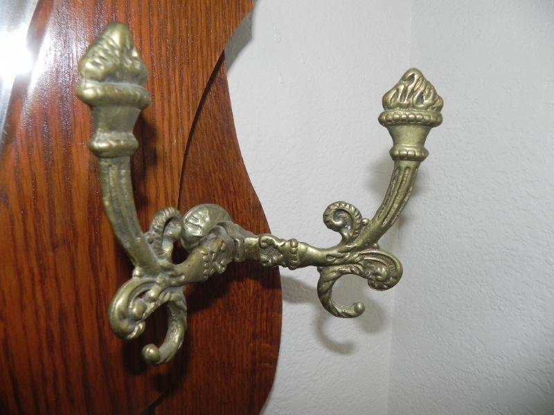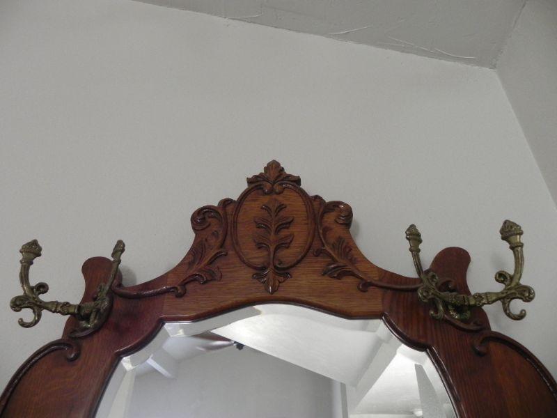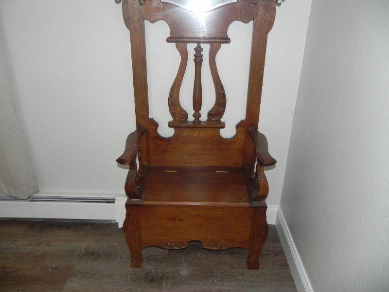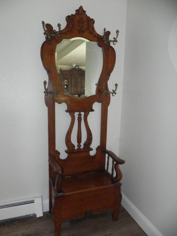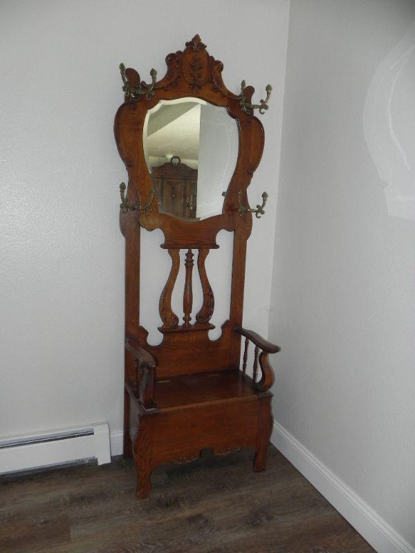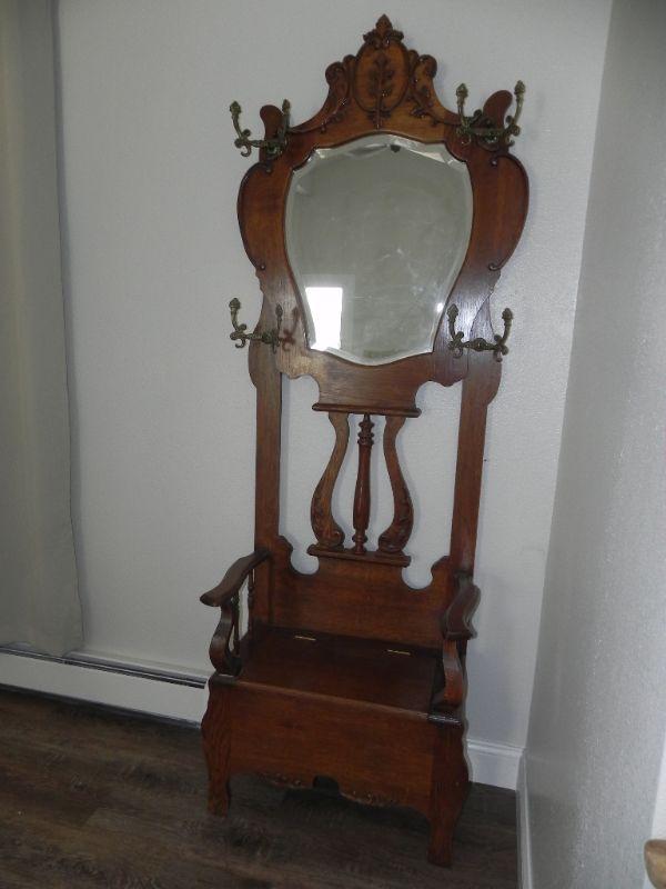 IN GREAT CONDITION. MEASURES 30x16x63. STORAGE INSIDE THE SEAT, BEVELED GLASS, UNIQUE COAT AND HAT HOOKS.