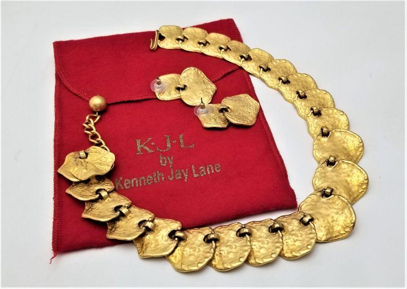Very nice gold tone Kenneth Jay Lane (signed with original pouch) necklace and pierced earring set. Necklace is about 15.5 inches long (not counting clasp or adjustment links. Earrings are 1.5 inches long. Unless otherwise stated, all jewelry has been gently worn.