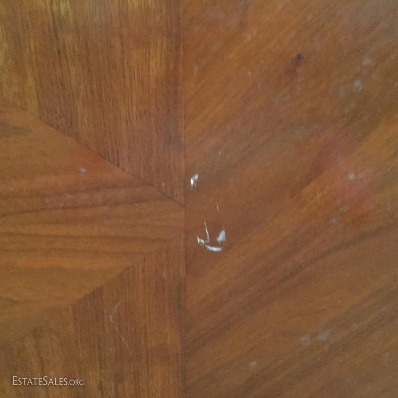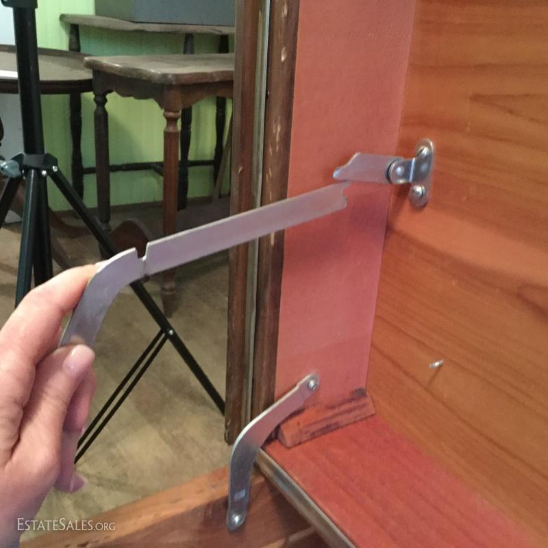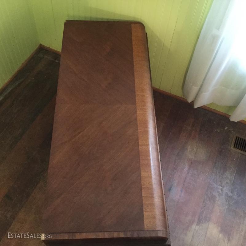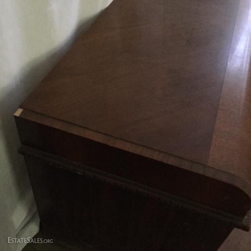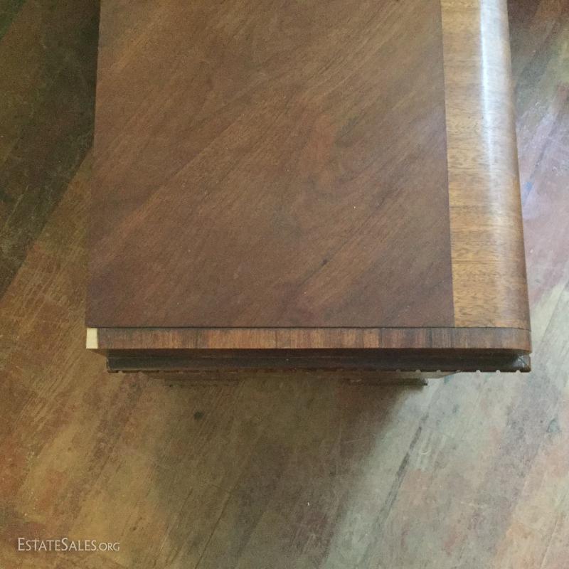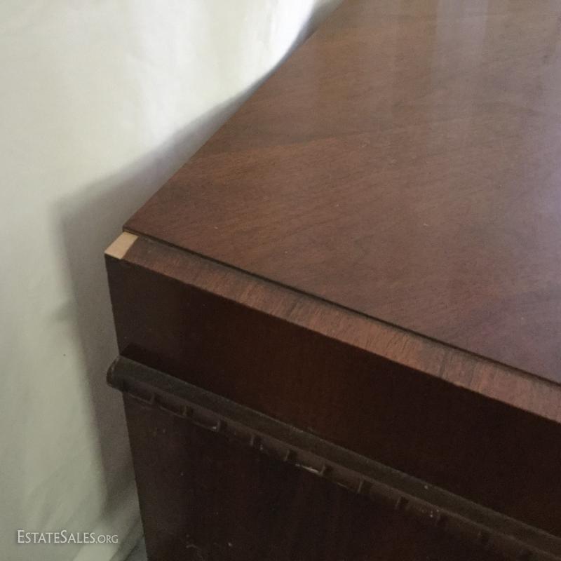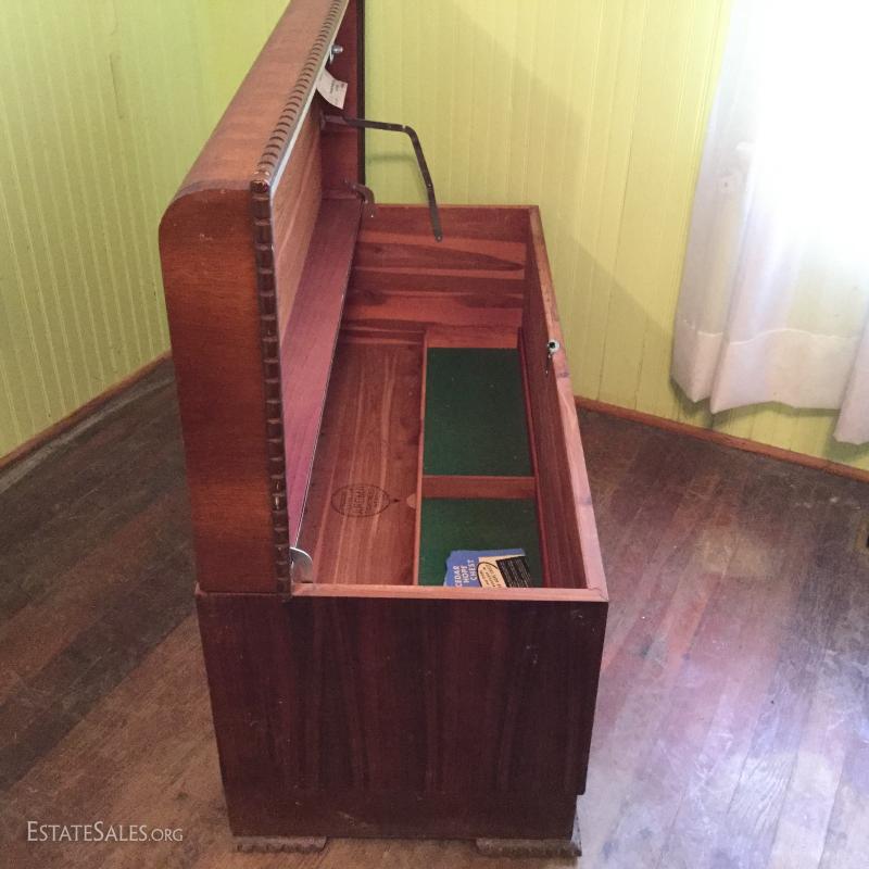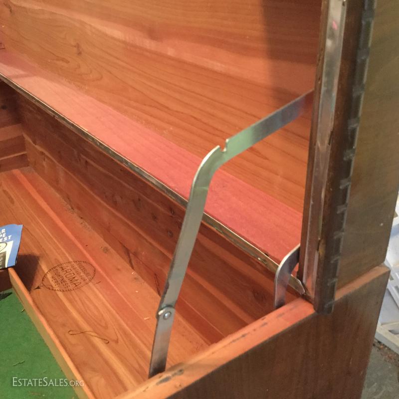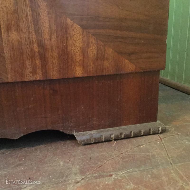 Still has it's original key, Damage to one inside metal track that supports a movable shelf. Can easily be repaired and does not hinder opening or closing of the chest. Small scratches in veneer