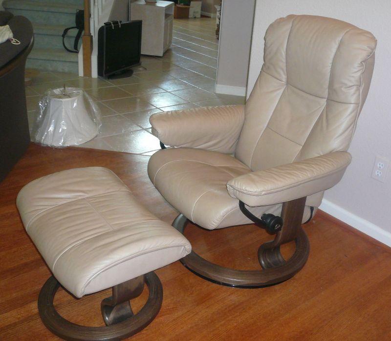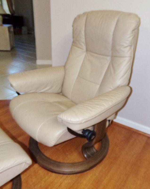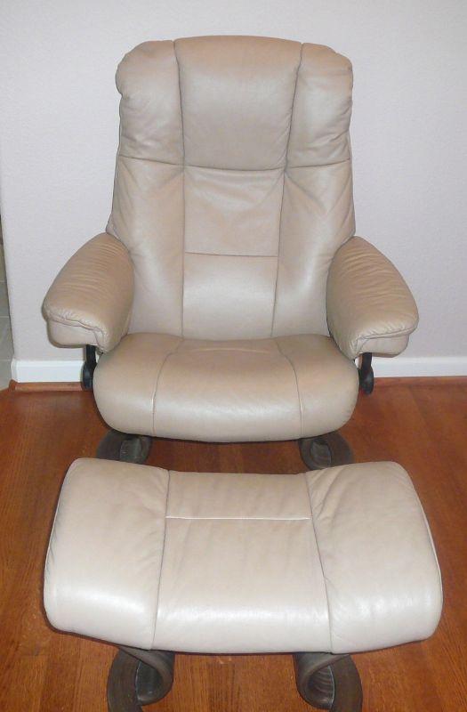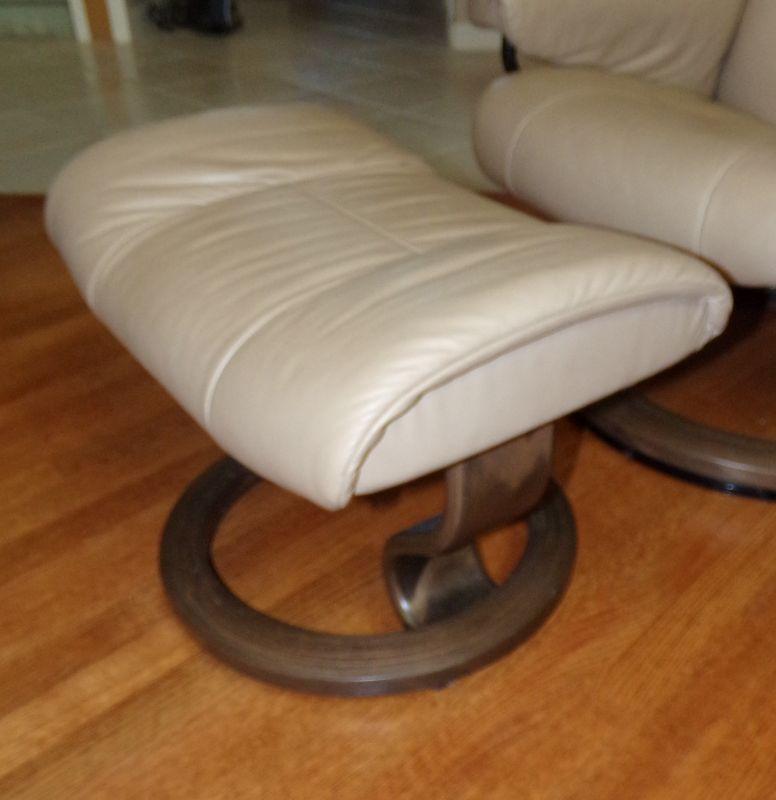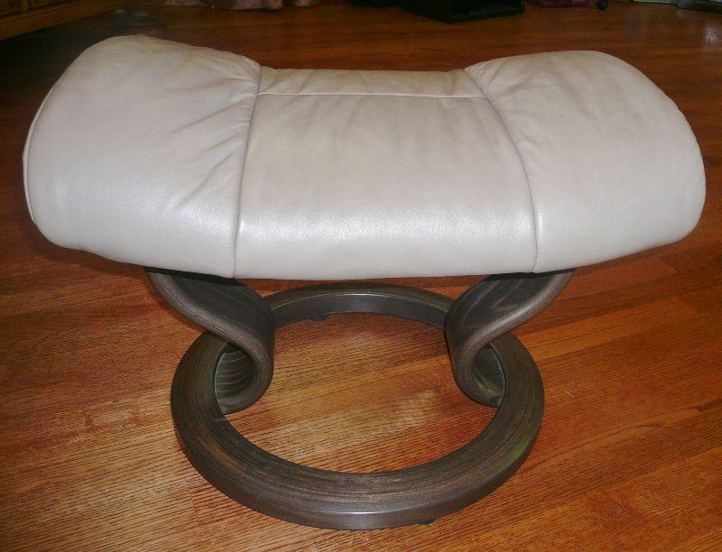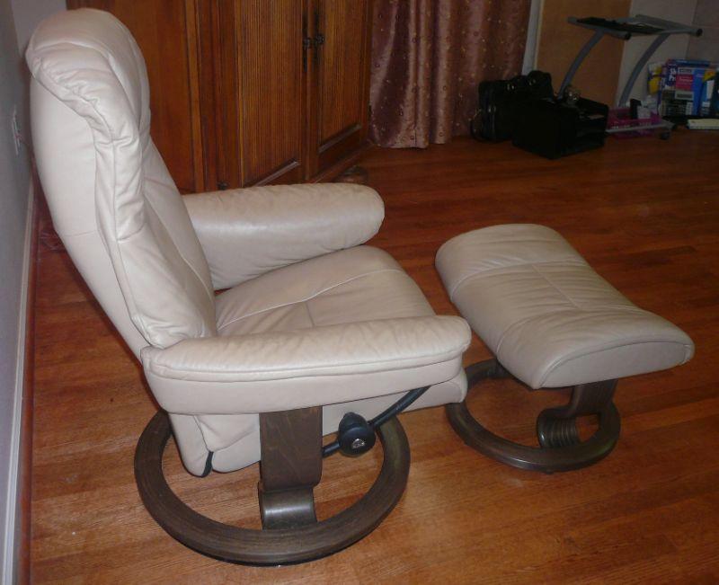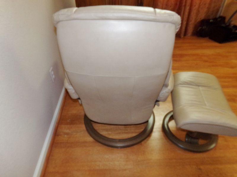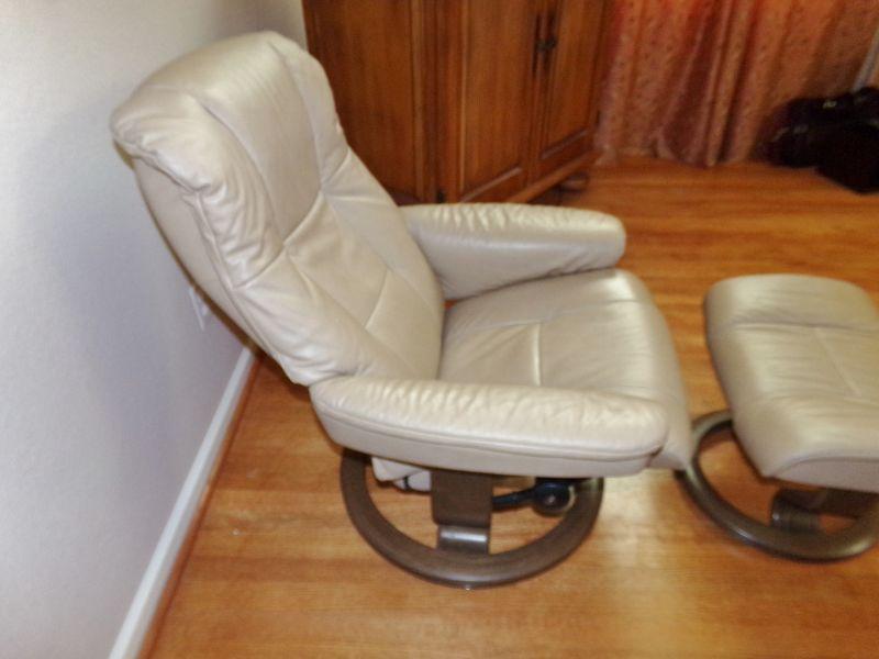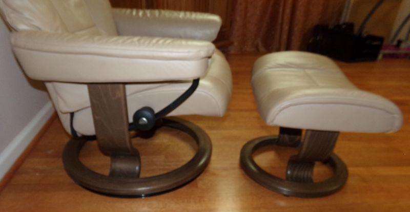 LEATHER CHAIR AND OTTOMAN WITH A WOODEN FRAME ARE IN VERY GOOD CONDITION!