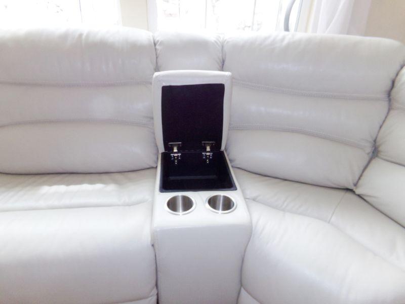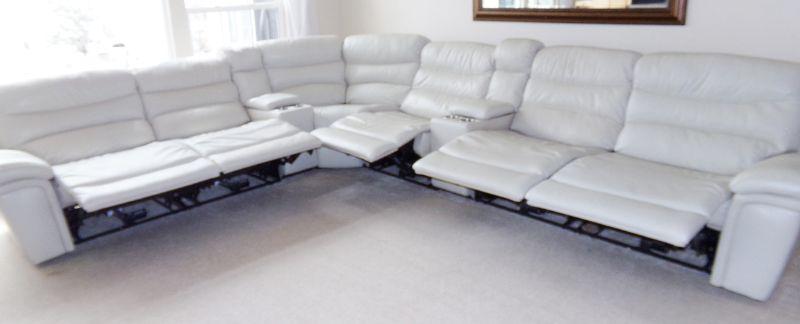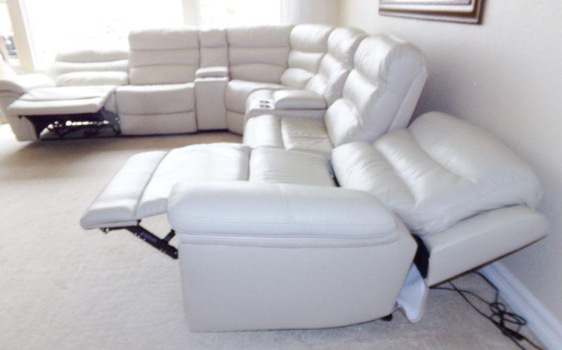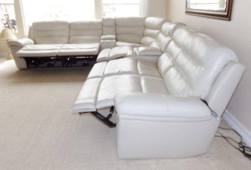 This Sectional has 5 Power Recliners with Limitless Positions. It Also Includes 2 Storage Compartments, Each is Equipped with 2 Cup Holders, 2 Three Prong Electrical Outlets and 2 USB Ports. It measures 12' x 9'8" THERE IS NO BUYERS PREMIUM FOR THIS ITEM