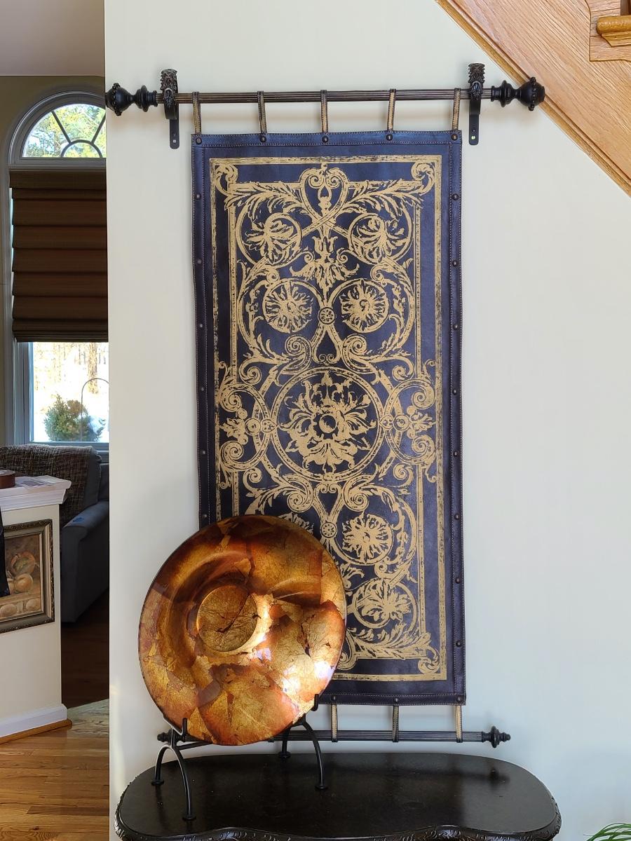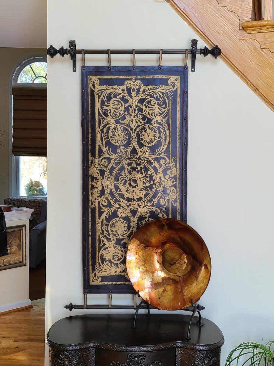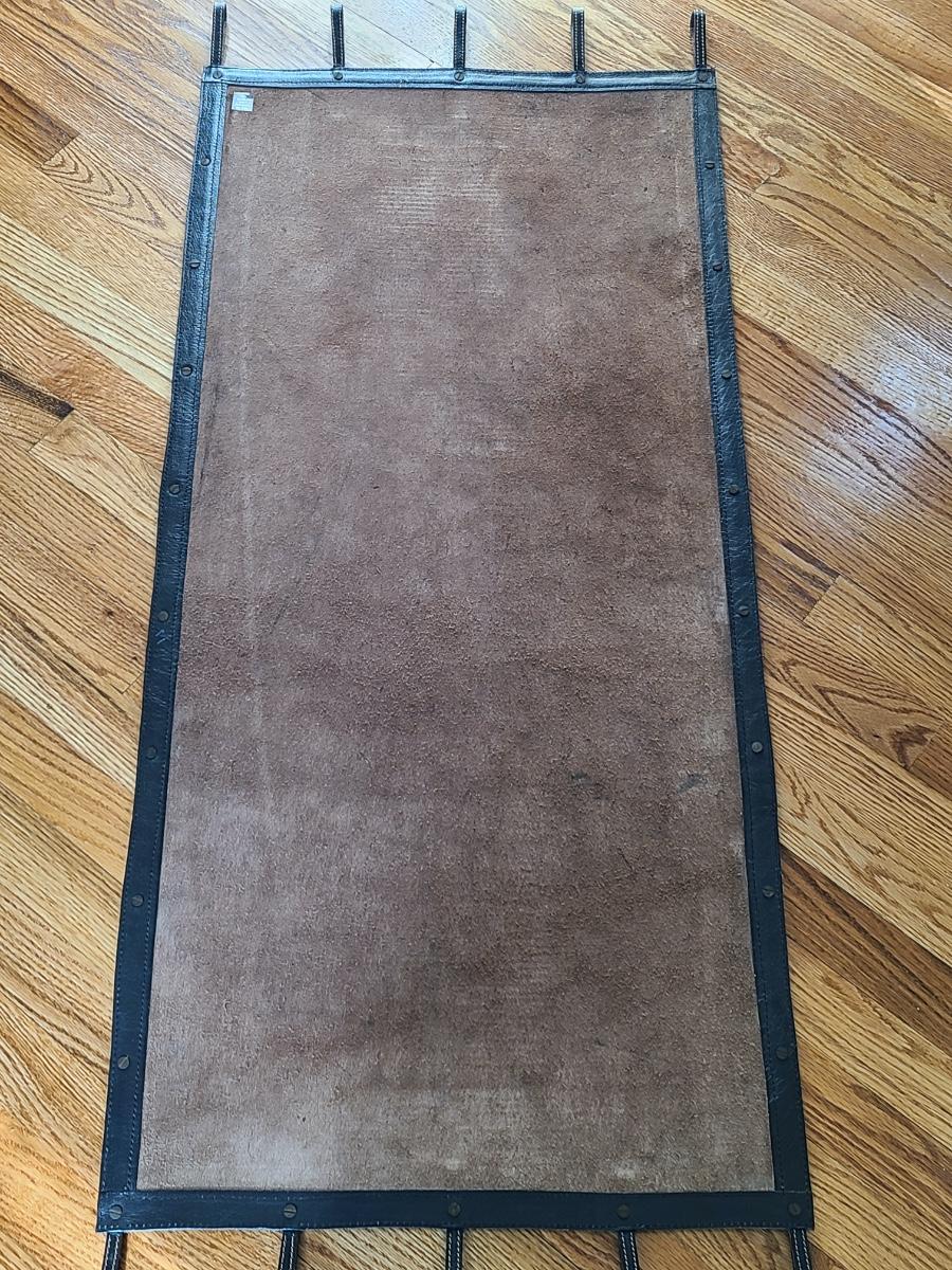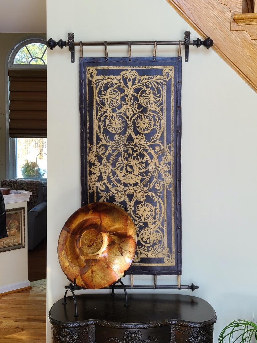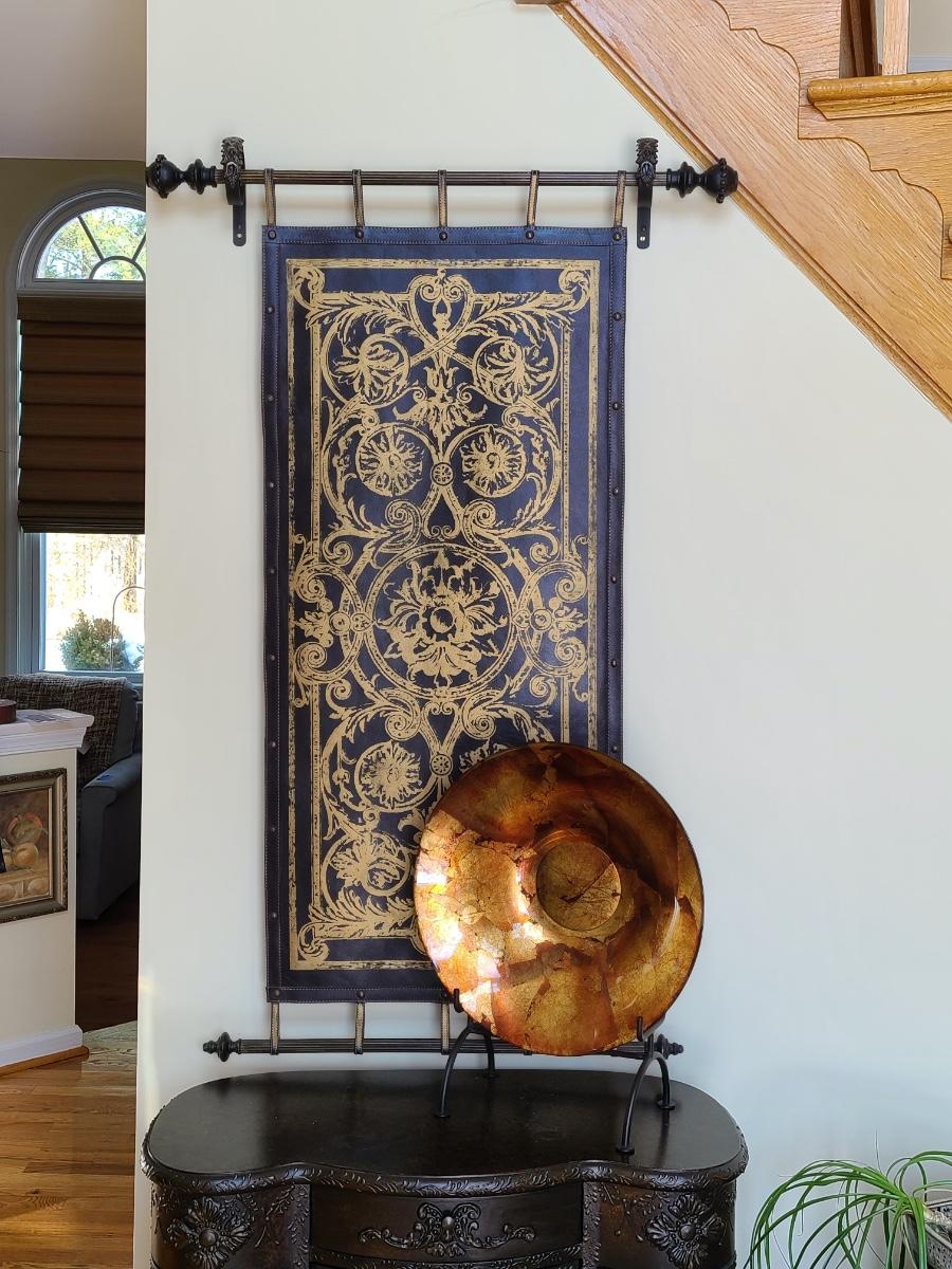 This looks to be a leather painted wall hanging with gold accents. It comes with the brackets. It measures 47 inches long and the brackets at top are 31 inches wide and at the bottom, 26 inches wide. Lovely wall decor for any room in the home. Please see all pictures as they are the best representation of the items. The pictures show condition, measurements if taken, and what is included in the lot. Due to the large amount that we photograph and the time frame, we are not always able to take measurements. All items unless noted, are pre-owned and have been used. If you purchased furniture, you must bring help. We do not allow one person to carry large furniture out on their own. Bring help, tools and a truck for the safety of our client’s homes, and your personal safety. Any damages that result to the property including walls, and floors due to moving of the furniture will be charged to the buyer. Company policy. Thank you.