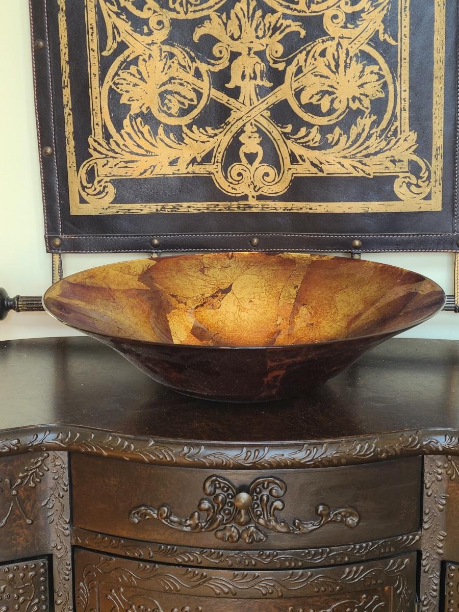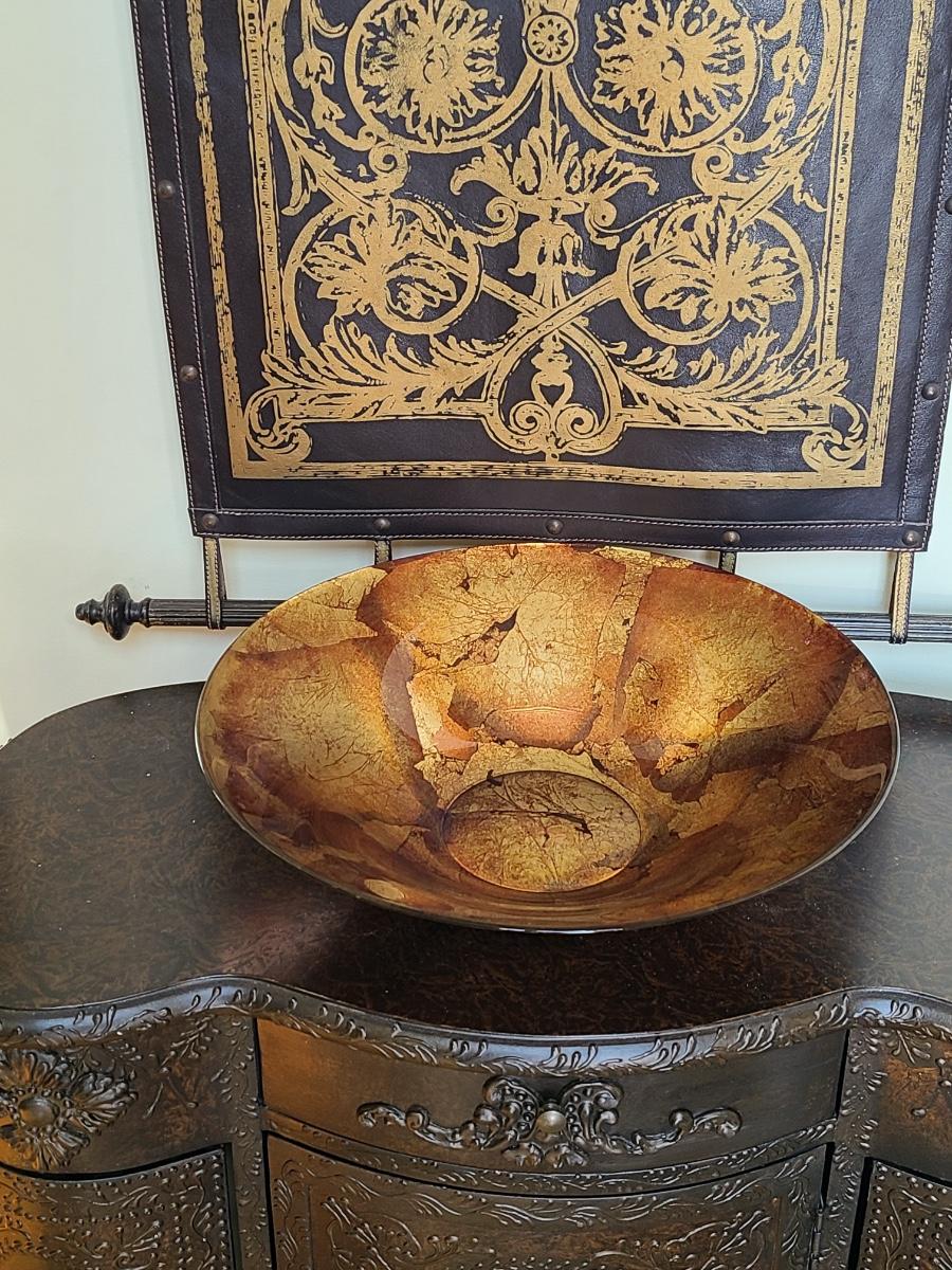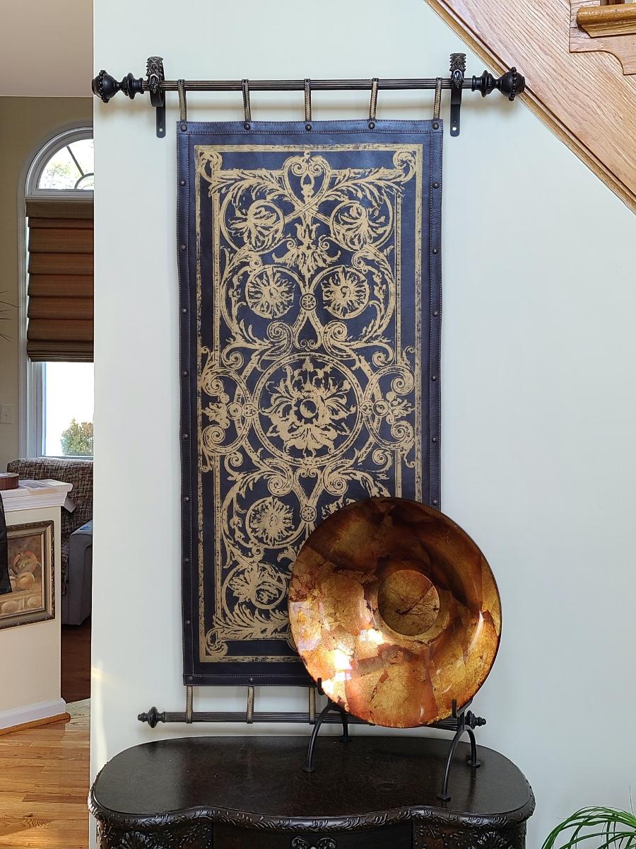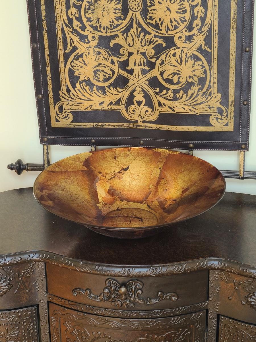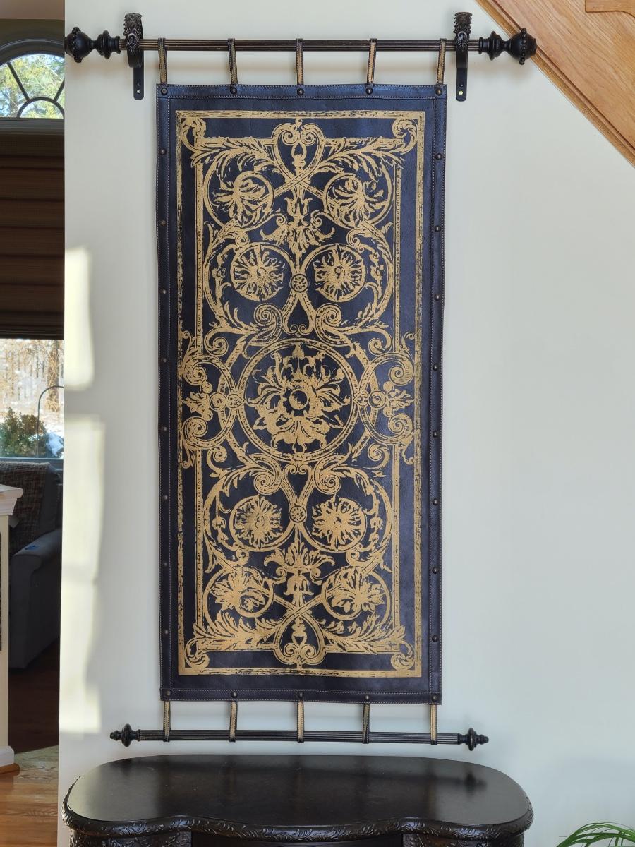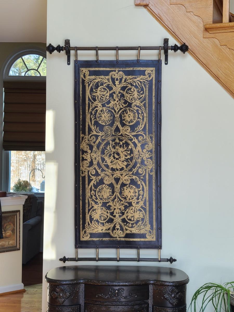 This looks to be a leather painted wall hanging with gold accents. It comes with the brackets. It measures 47 inches long and the brackets at top are 31 inches wide and at the bottom, 26 inches wide. Lovely wall decor for any room in the home. Please see all pictures as they are the best representation of the items. The pictures show condition, measurements if taken, and what is included in the lot. Due to the large amount that we photograph and the time frame, we are not always able to take measurements. All items unless noted, are pre-owned and have been used. If you purchased furniture, you must bring help. We do not allow one person to carry large furniture out on their own. Bring help, tools and a truck for the safety of our client’s homes, and your personal safety. Any damages that result to the property including walls, and floors due to moving of the furniture will be charged to the buyer. Company policy. Thank you.