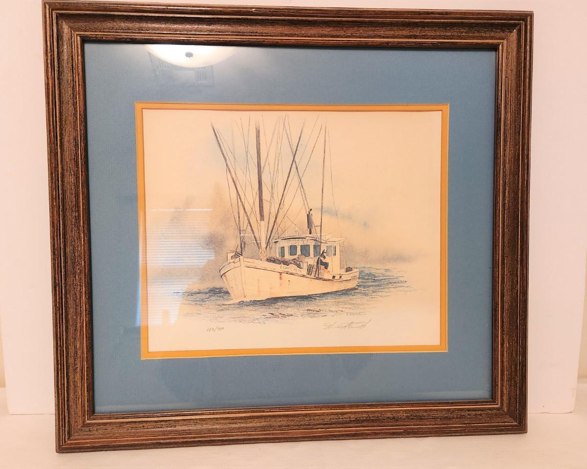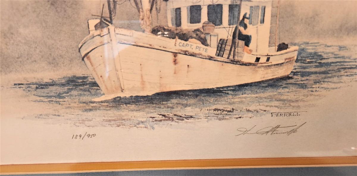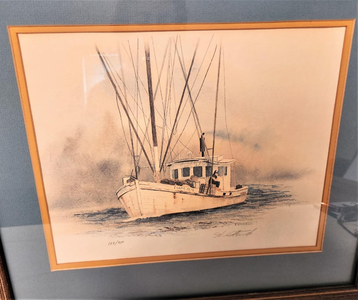 Limited edition print of a shrimp boat (the "Captain Pete") - double matted, #189/950, signed "Ferrell". 20" across, 18.5" tall. Good condition.