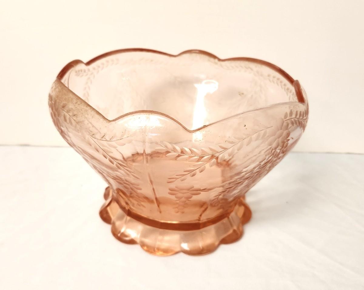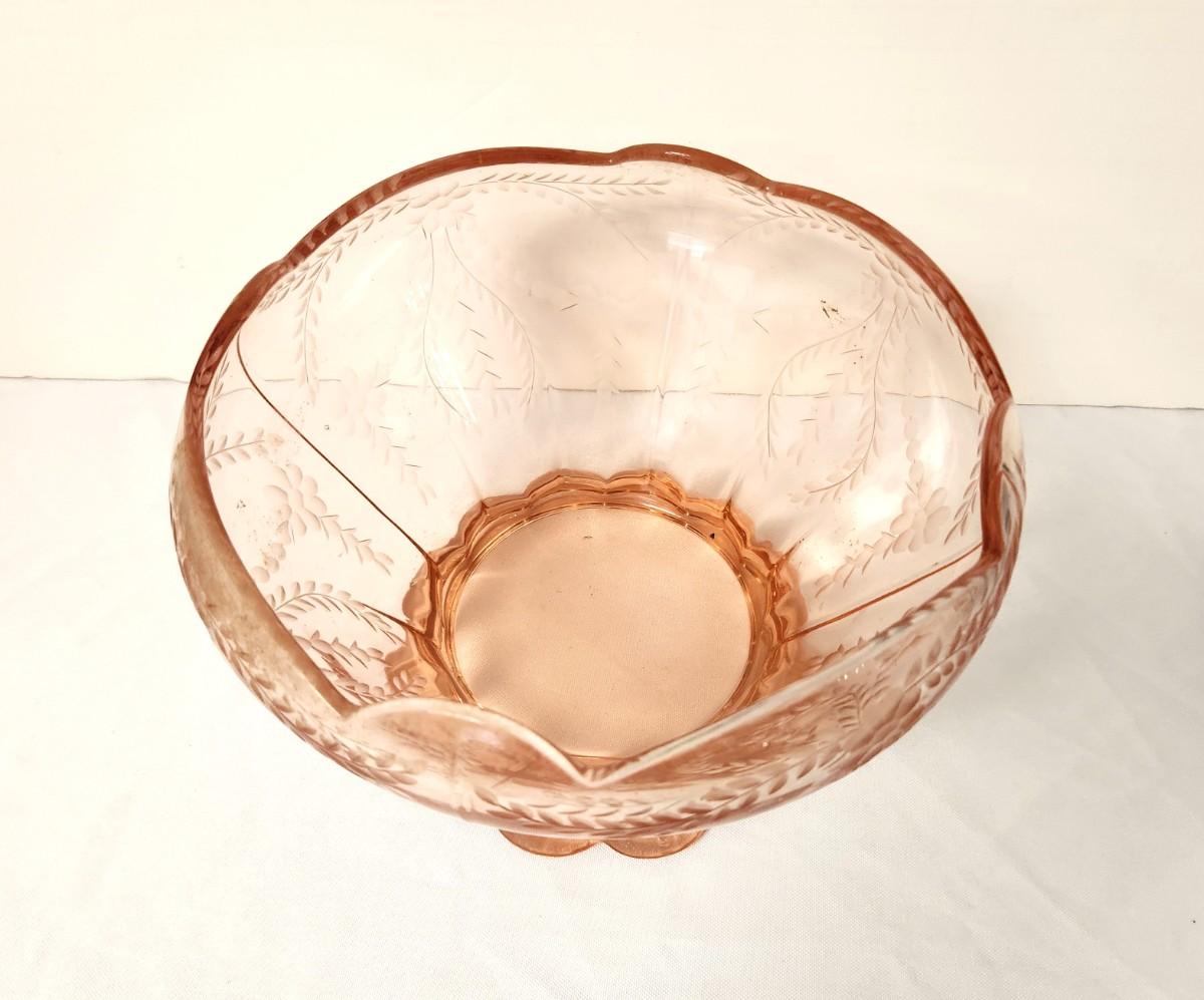 Beautiful Depression-era center bowl in pink - pretty etched design. Good condition - 5.75" tall, 8.5" across. No chips or cracks.