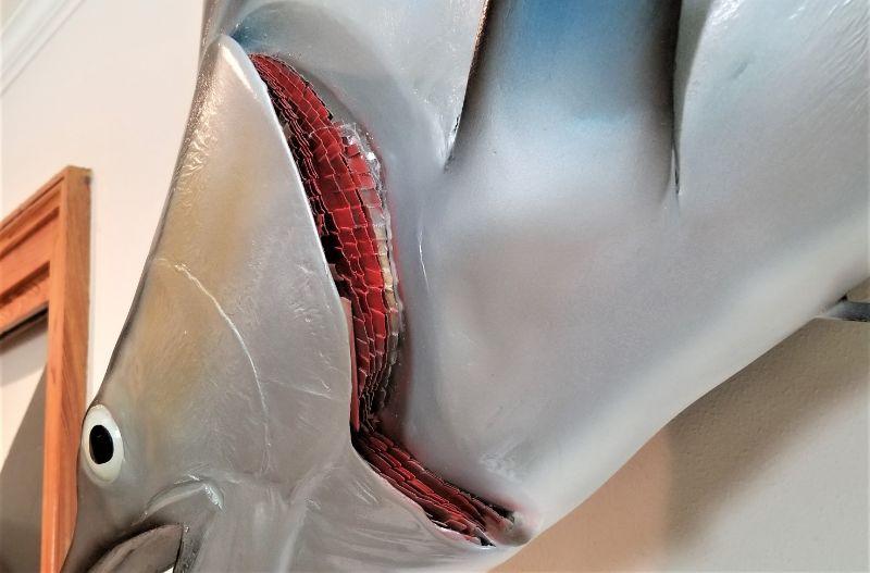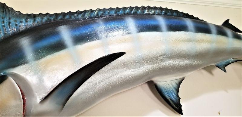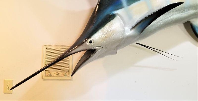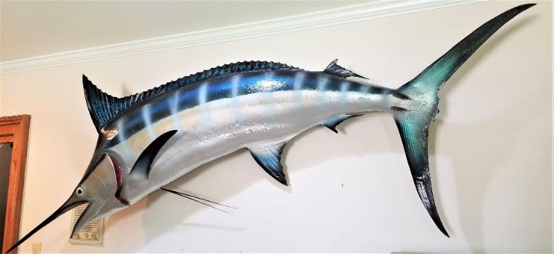 Here is a great item for your den or man cave - well-executed Vintage replica Marlin or Swordfish - measures about 106" long, 37" tall at tallest point. Blue and Silver with white accents. Good condition.