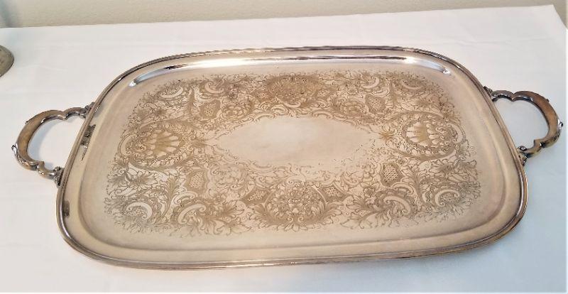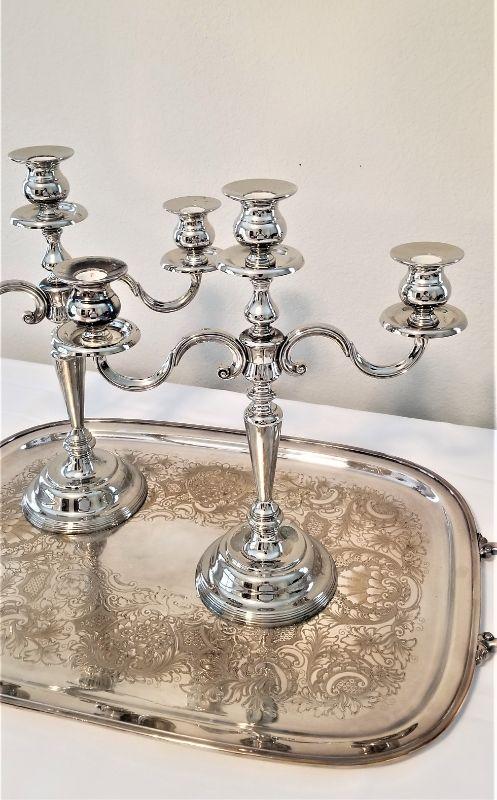 Heavy Silverplate Handled Serving tray and a matched pair of silverplate 3-arm candelabra. Good used condition. Tray measures 26.75" handle to handle, 16" across. Candelabra are 15" tall at tallest point, 13" across. All the candle inserts are there. Just in time for your holiday table.