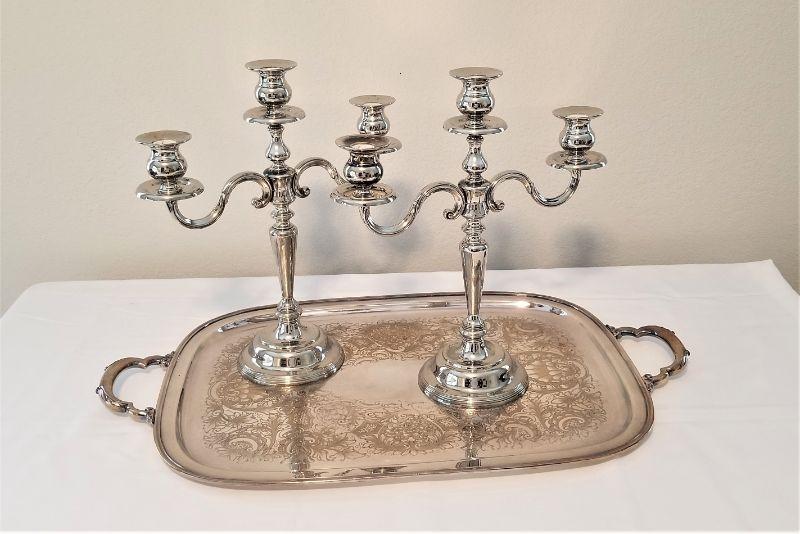 Lot #1 Silverplate Serving Tray and Pair of Silverplate Candelabra