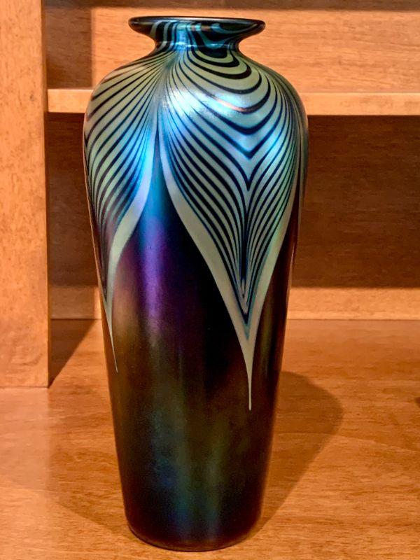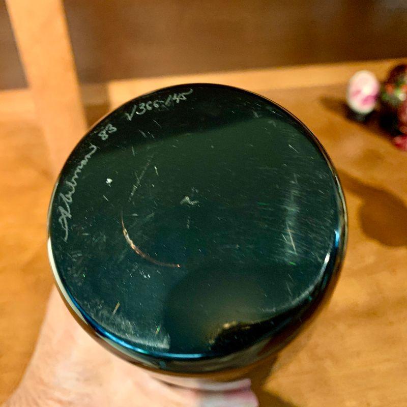 Pulled feather iridescent aurene art glass. Hand blown, signed Abelman'85 V366-145, 11 1/2" tall. Very dark purple with a silver pulled feather. Good condition, no chips or cracks.s