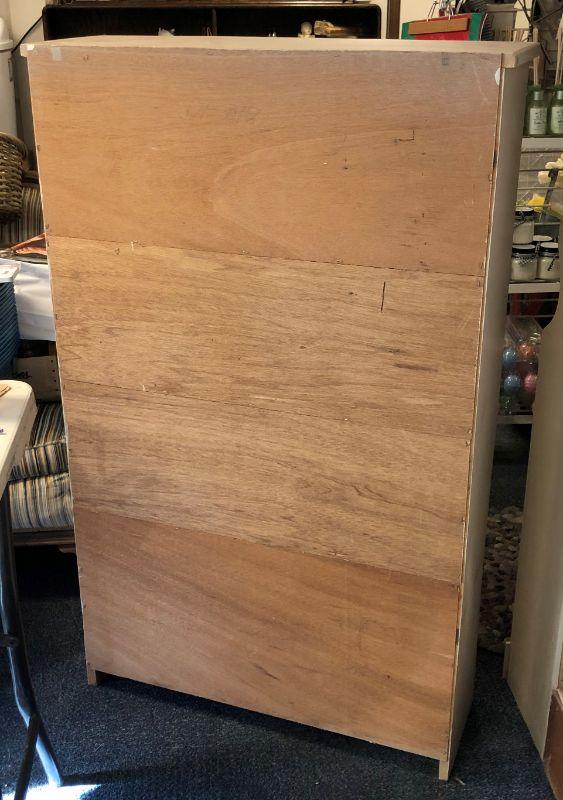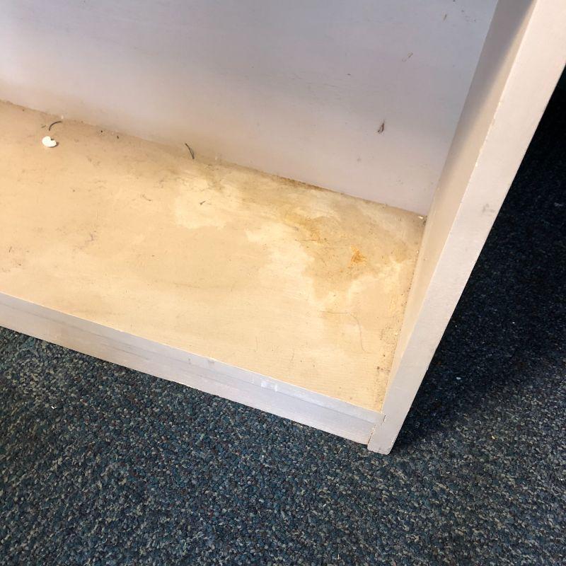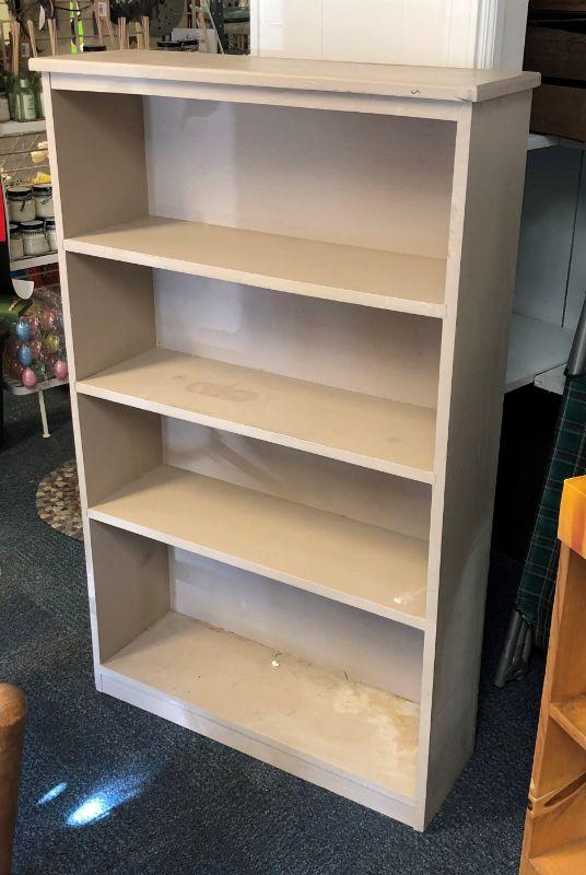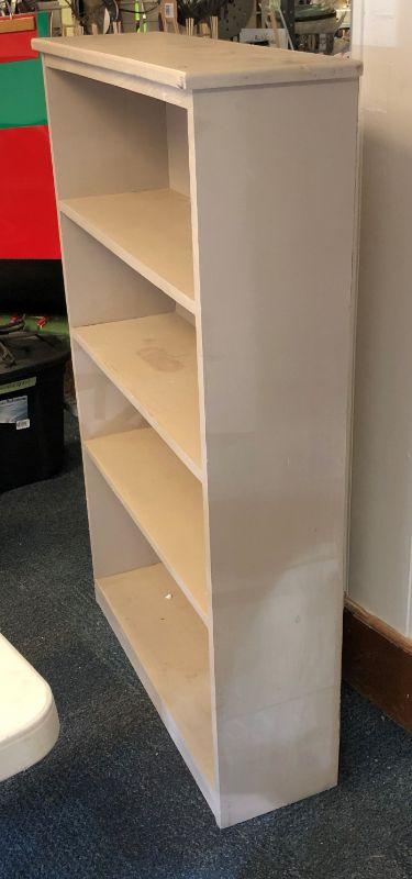 This bookcase is in great shape, but the paint needs a bit of help. There is a spot on the bottom shelf that looks like a little bit of water damage, but the wood seems good, just the paint. Approximately 47.5" x 29.5" x 9.5".