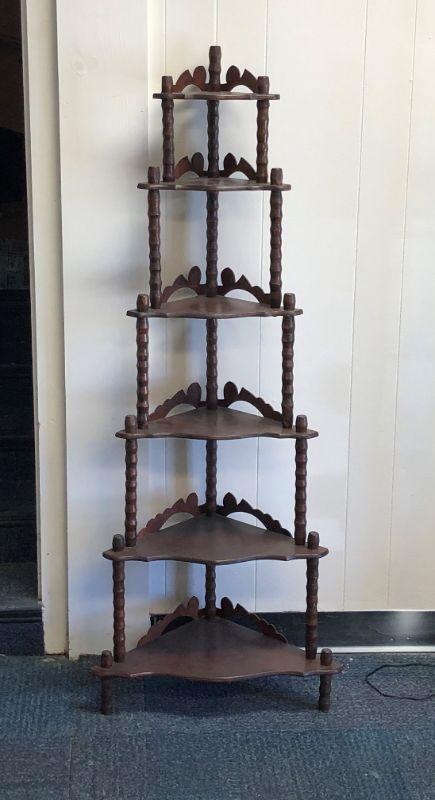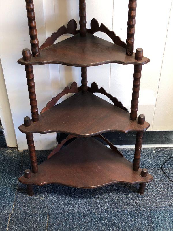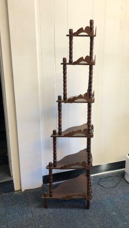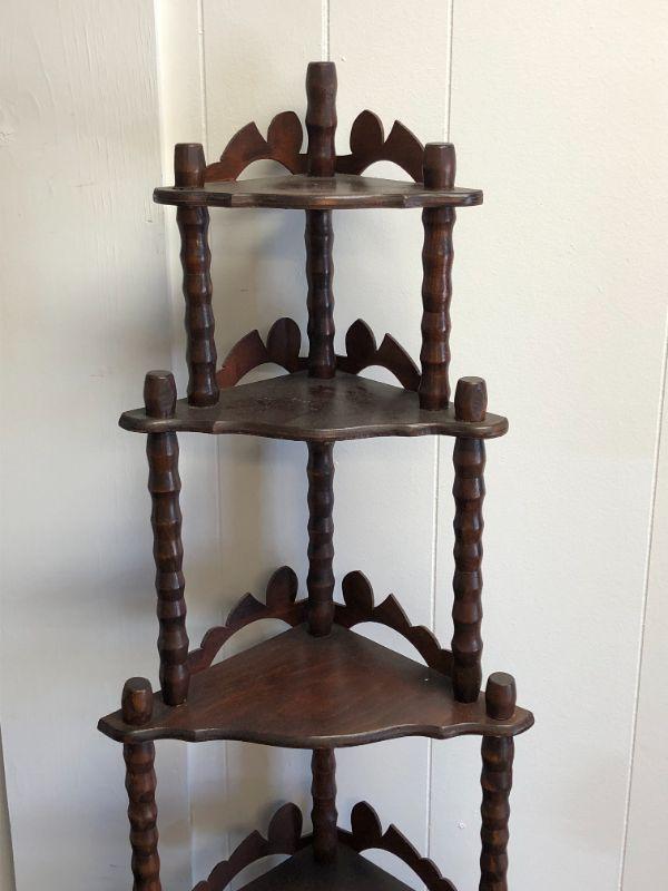 This lovely shelf is in excellent condition. It stands about 53.5" tall, the bottom shelf is about 20.5" at the widest and 12" deep. The shelves gradually get smaller with the top shelf being 10" at the widest and 6" deep.