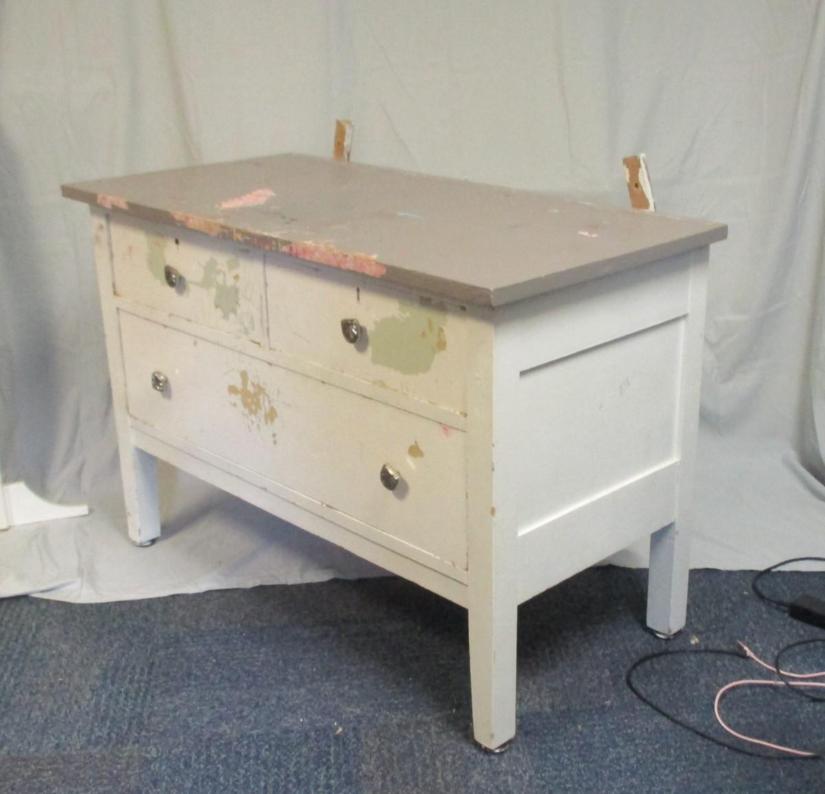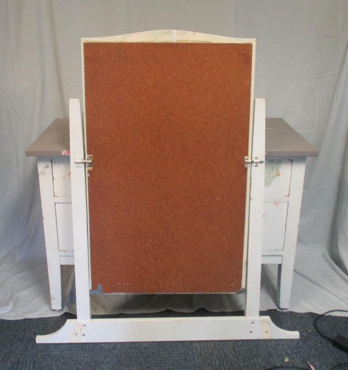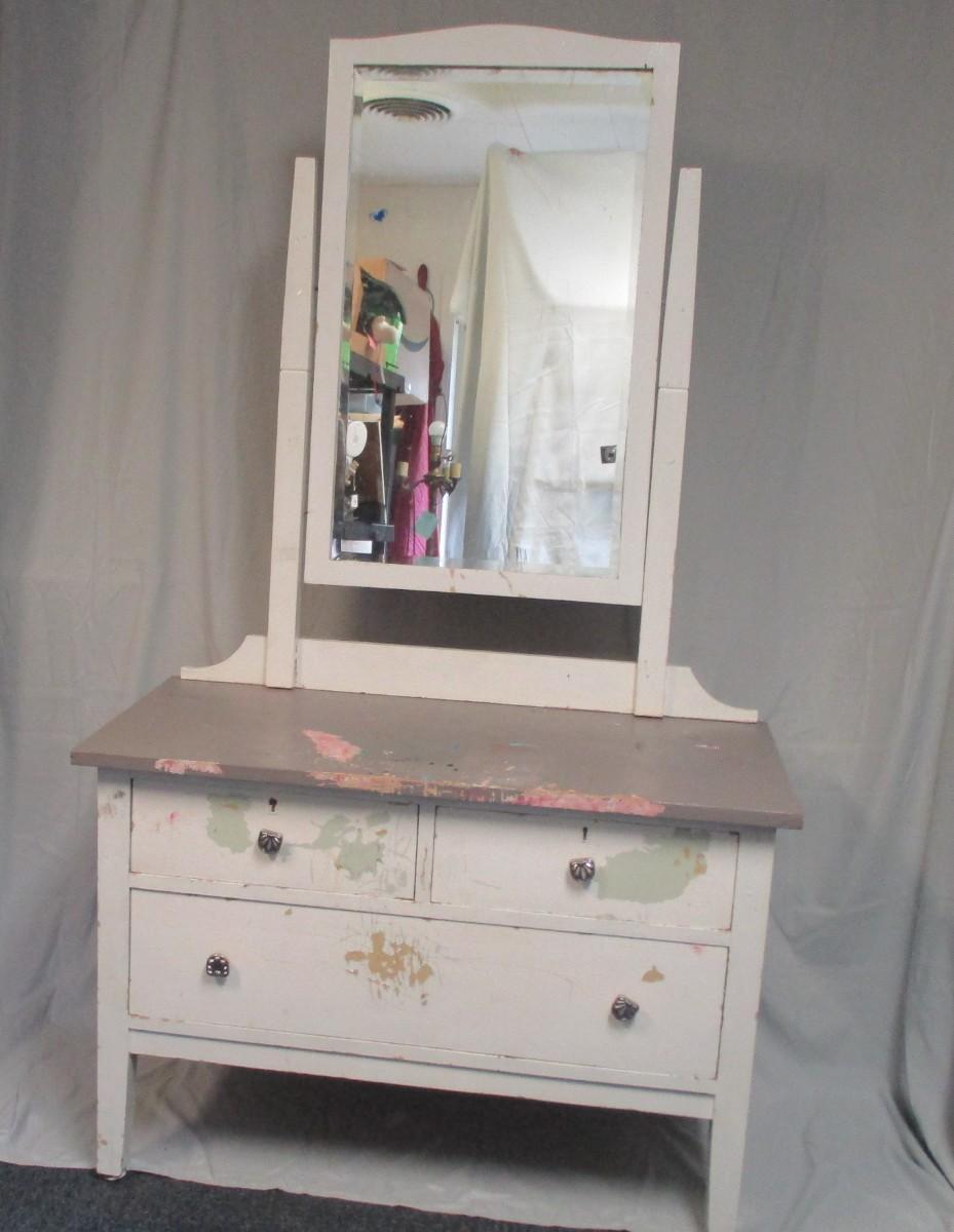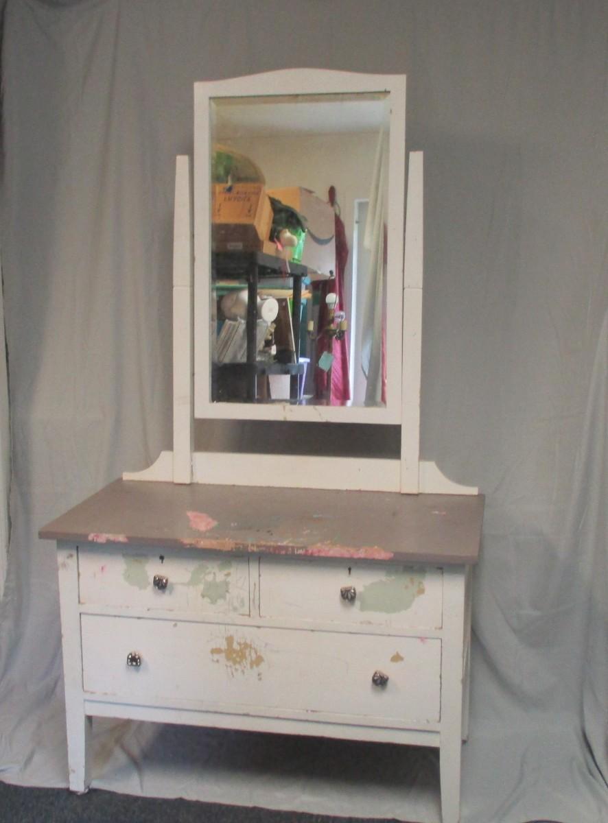 This is a solid wood dresser with a swing mirror that is in great structural condition, but needs some cosmetic love. I believe that it was done with a latex based paint. The dresser is 25" tal and the mirror adds another 40" to the height. It is 18" deep and about 37" wide. This could be a stunning piece with a little bit of cosmetic love!